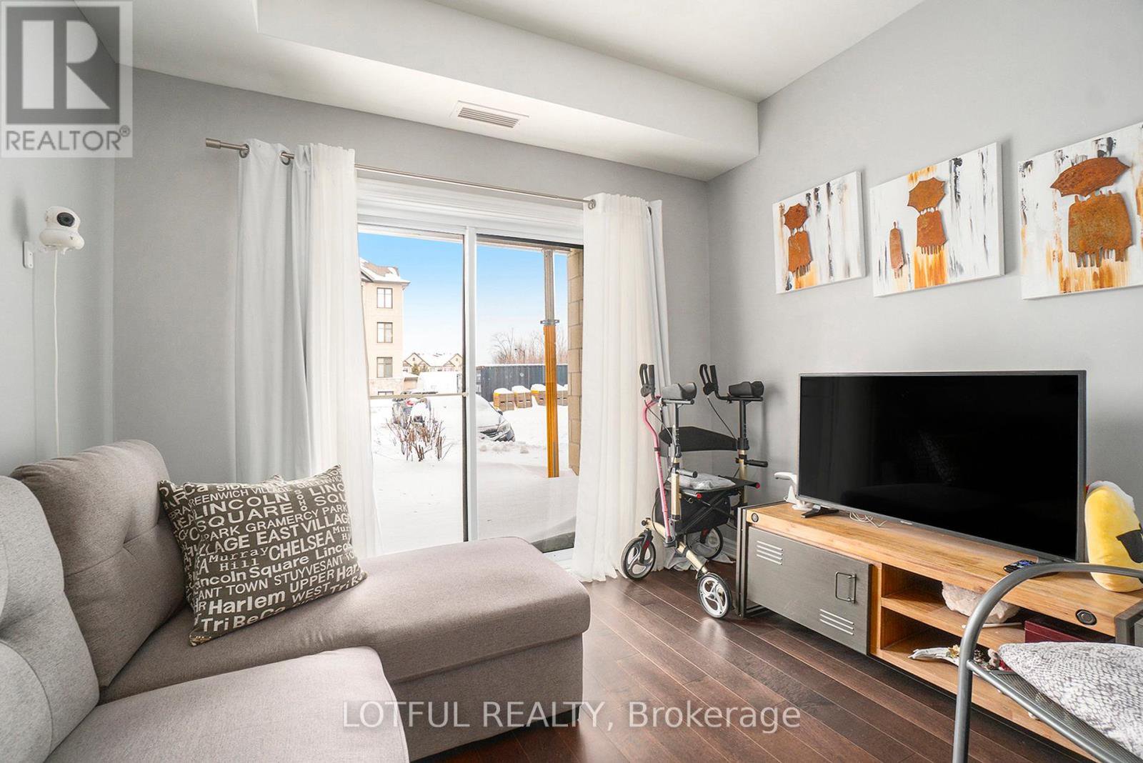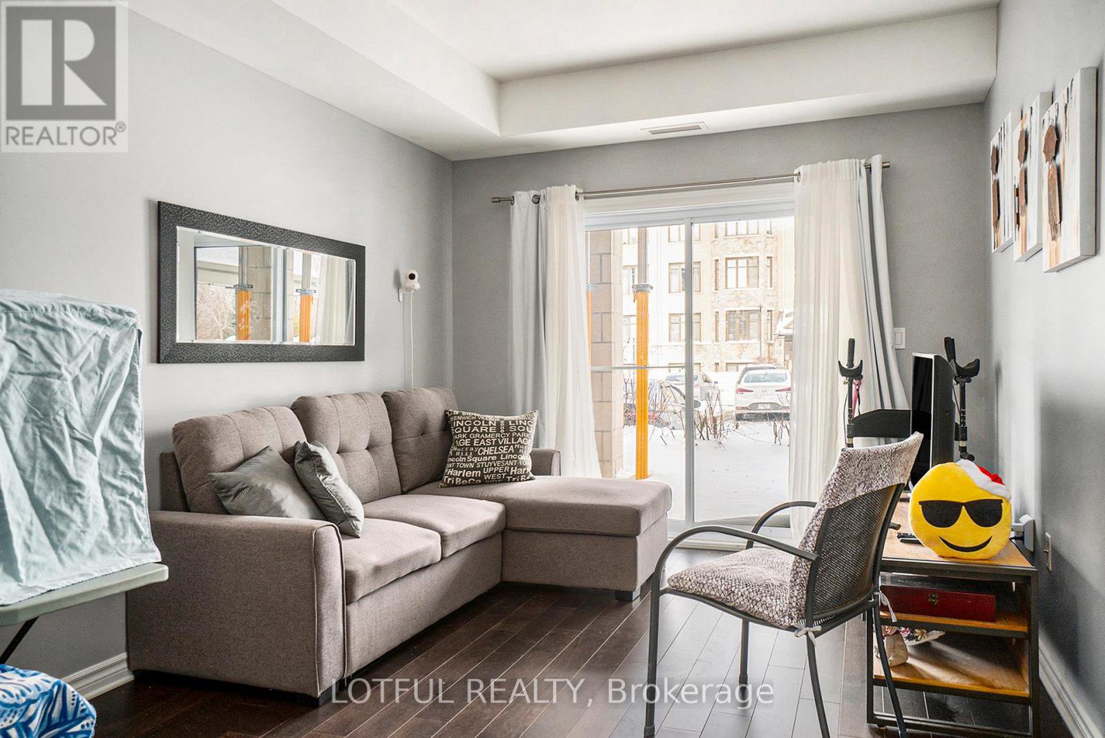 Nestled near the Ottawa River in the prestigious community of Petrie's Landing, this elegant condo offers a sophisticated, maintenance-free lifestyle. Step into the luxurious lobby, where elevators await to take you to this sun-filled 1-bedroom + den retreat. Designed with an airy open-concept layout, this home features gleaming hardwood and ceramic flooring throughout. The stylish kitchen boasts granite countertops, stainless steel appliances, and ample cabinetry. The living and dining area is bathed in natural light, with sliding doors leading to a beautifully landscaped private patio perfect for relaxing or entertaining. The spacious primary bedroom offers a walk-in closet, while the versatile den serves as an ideal home office or guest space. A spa-like 4-piece bathroom impresses with a soaker tub and separate glass-enclosed shower. Additional conveniences include a dedicated parking space and storage locker. Enjoy an unbeatable location just steps from scenic trails, green spaces, and Petrie Islands waterfront. With all amenities nearby and the future LRT within close reach, downtown Ottawa is just a short 15-minute commute away