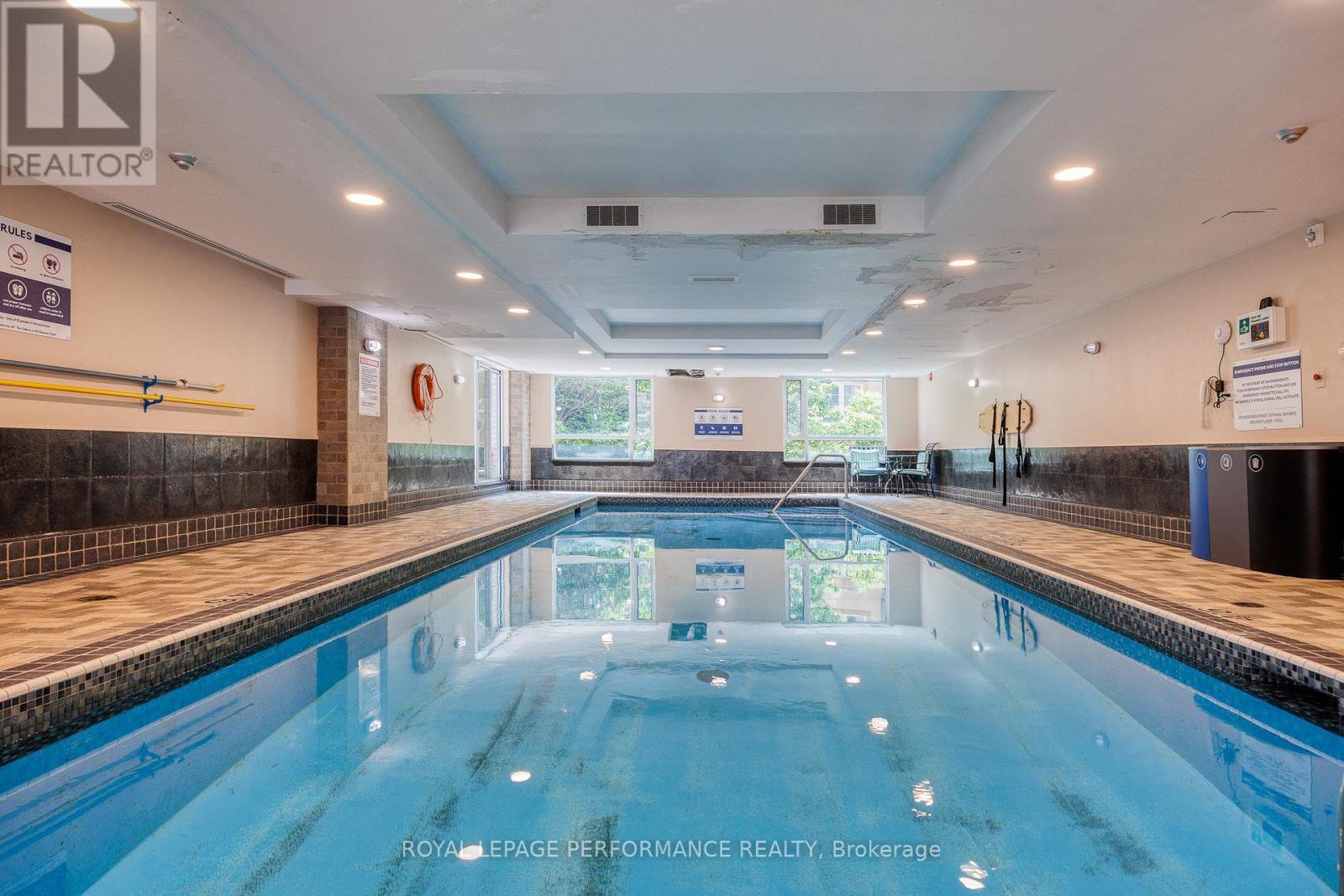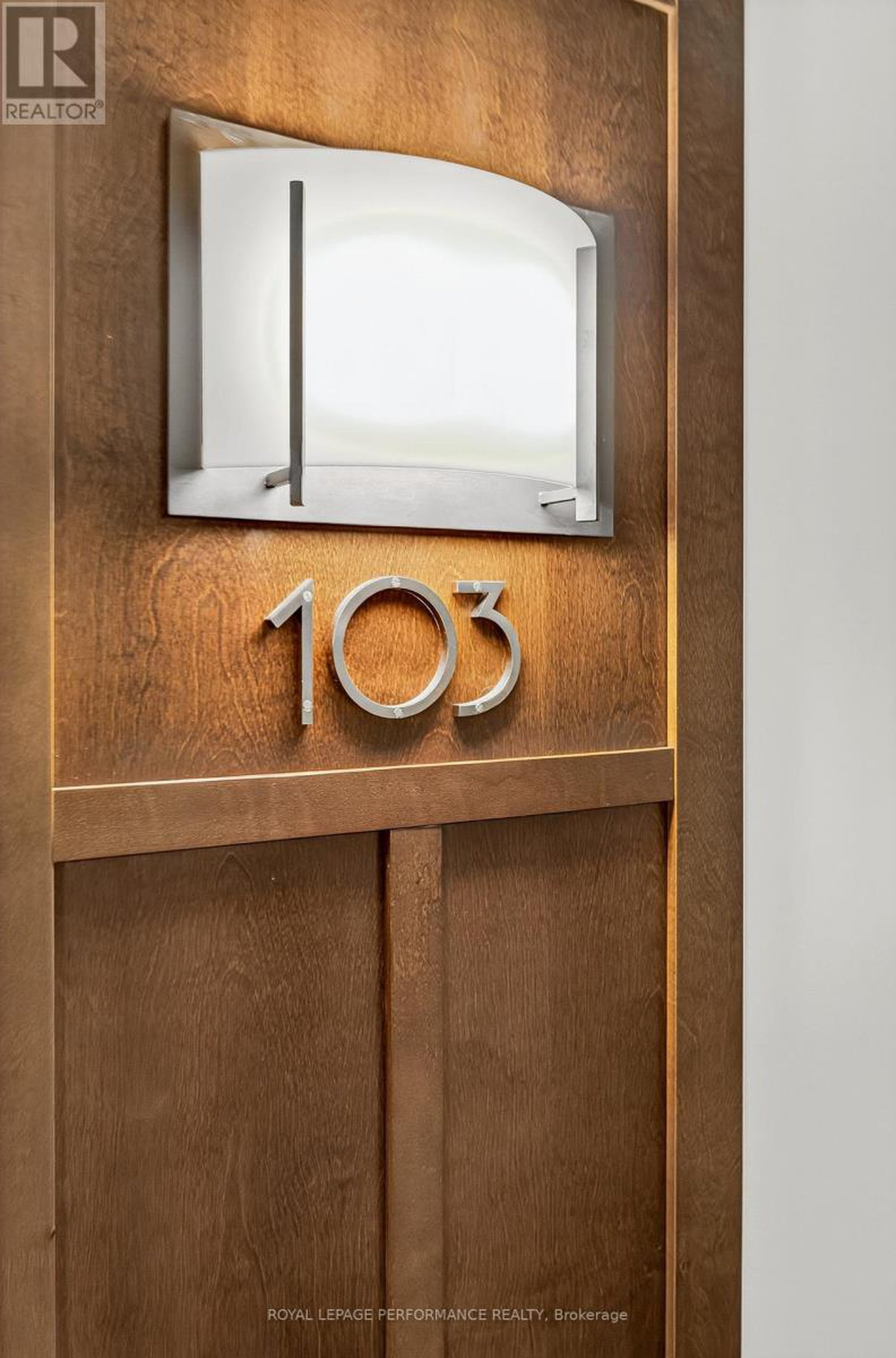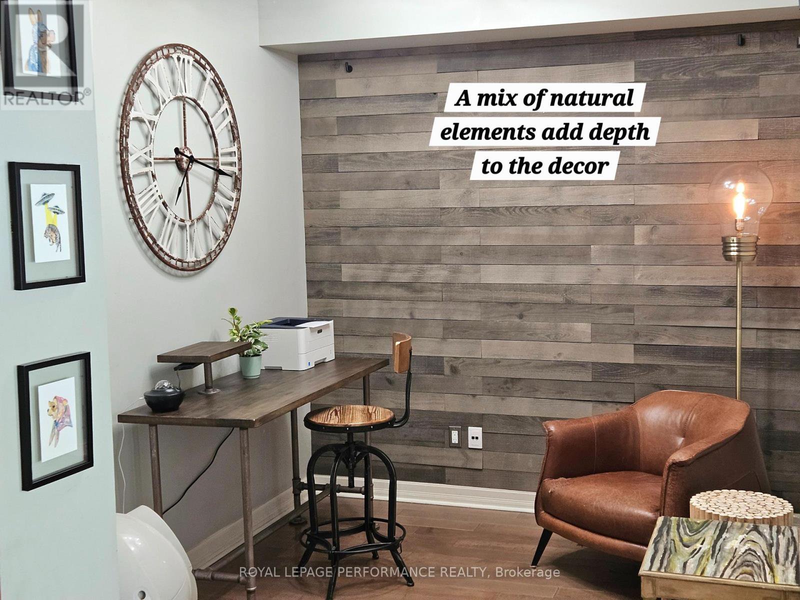 Rarely offered, this modern and elegant 2 BEDRM condo also has a large DEN, 2 FULL bathrooms, 2 INDR underground parking spots & a storage locker. Approx. 1135 sq ft as per Builder's plan. The owner has lovingly added modern upgrades to embrace natural elements into the space; brick facade added to the granite breakfast bar, wood panels in the den, Edison light fixtures and metal and wooden shelving etc. Hardwood flooring throughout and open concept layout. Kitchen features granite countertops, convenient double sink, stainless steel appliances and hidden pantry. Full sized ,newer LG washer and dryer that offers durability while being quiet. Primary Bedrm has a wall of windows with views of the terrace, 2 sets of closet space and a 4 pc ensuite bathrm with a separate shower area. Have a roommate or a guest? 2nd bedroom also has a wall of windows with views of the terrace, & great closet space. Gym and sauna /lounge area on the 2nd floor. Parking P1-7, P1-3. Storage S4-20. Walking distance to grocery stores, LCBO, LRT etc. This building allows for pets - with some restrictions on size. Security - on site.This prime location is perfect for those who love the energy of being downtown. This unit has a walking score of= 99. Transit score =91, Bike Score =97.