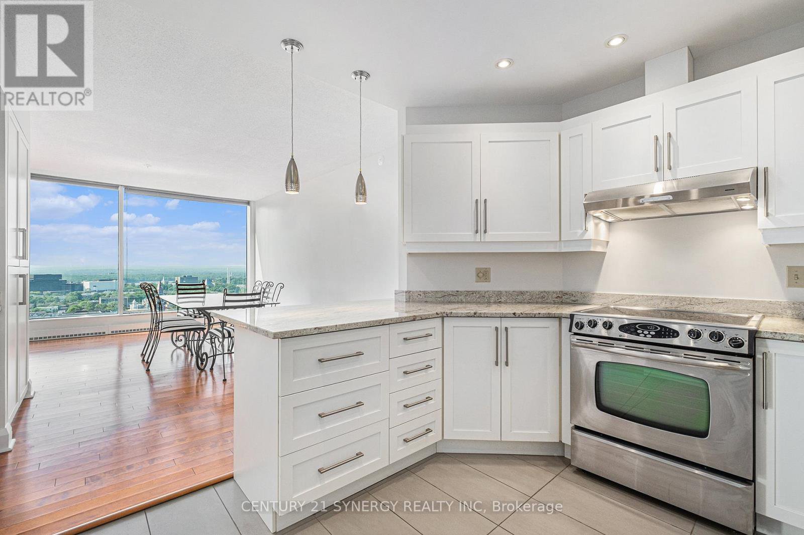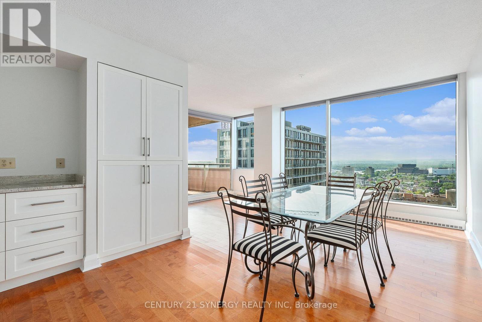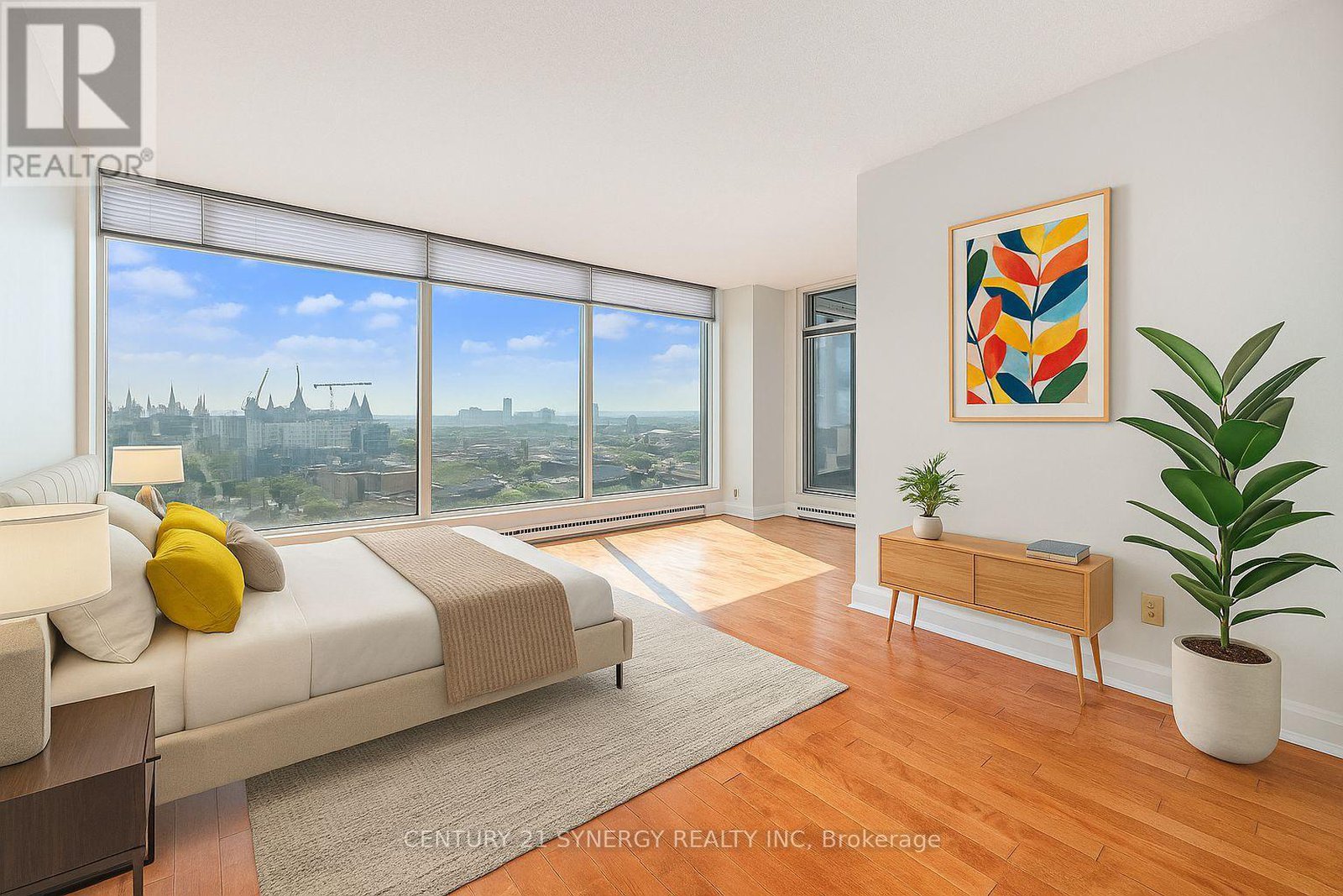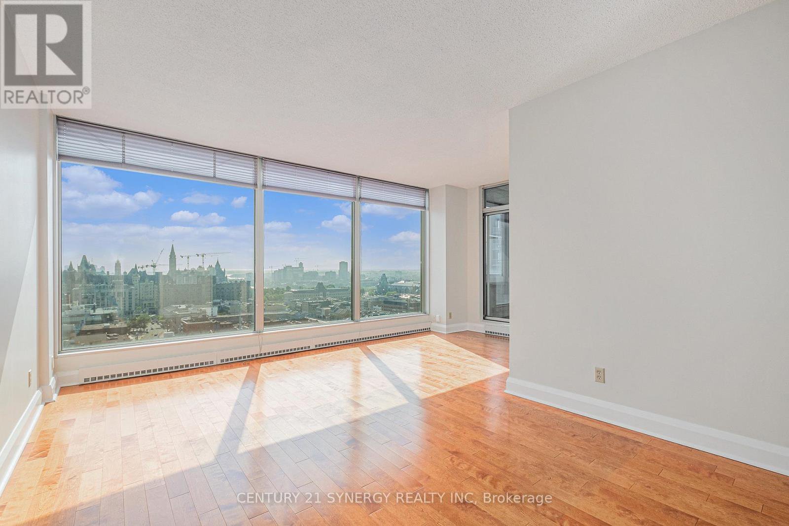 Rarely Offered 2 Bedroom, 3 Bathroom Condo at The St. George. Welcome to this spacious DOUBLE ensuite bedroom and sun-filled condo in the heart of the city, offering over 2,000 sqft of modern living. Beautiful hardwood floors throughout and expansive west and south facing windows, natural light pours into every corner of this home. The kitchen features granite countertops, stainless steel appliances, abundant pot lighting, a large pantry, and a convenient coffee nook. Step onto the open sizable balcony to enjoy stunning views of Ottawa. The oversized primary bedroom boasts full-length, UPGRADED SOUNDPROOFING windows, greatly reducing the outdoor disturbances, a walk-through walk-in closet, offering a large soaker tub with double sink vanity. The second bedroom includes its own full ensuite and access to the ENCLOSED balcony which was an additional and expensive improvement paid by the owner. The balcony can be finished as an additional interior room. This unit features top-tier amenities including 24-hour security, an underground parking with a PRIVATE storage room, guest suite, fitness centre, indoor pool, saunas, and a landscaped 3rd-floor patio with gas BBQ and covered dining area. (Some pictures virtually staged)