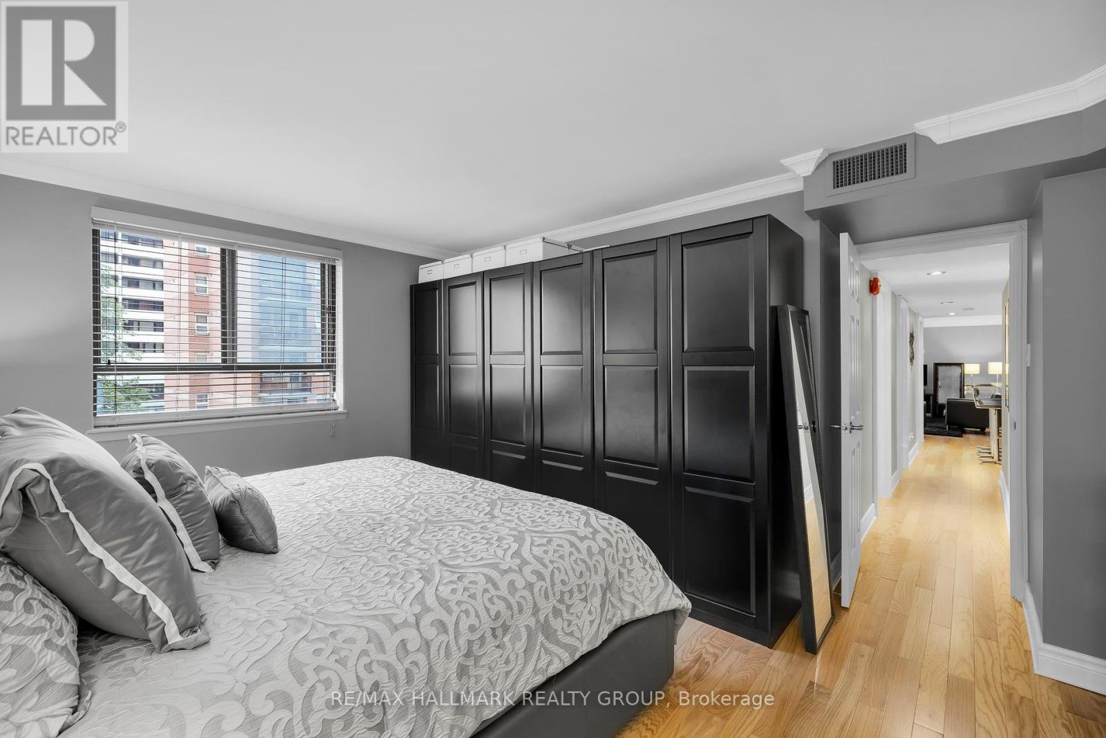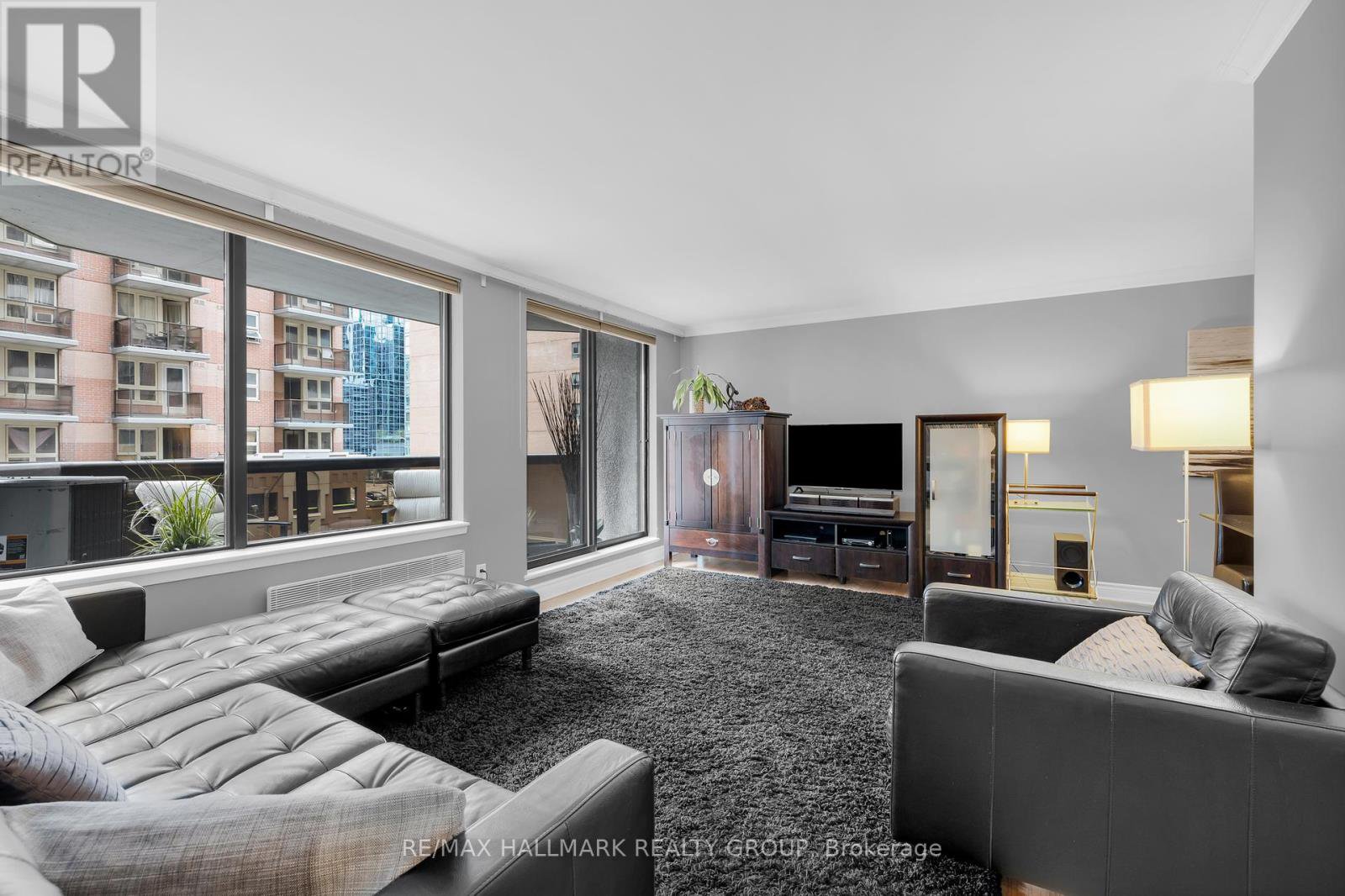 Beautifully updated, this spacious 2-bdrm, 2-bath corner unit condo (app. 1200 sf) blends style, comfort and convenience in the heart of the city. Open-concept layout features soundproof engineered real hardwood floors, crown moulding, high baseboard trim & wood trim around doors, high-end lighting fixtures throughout, and the entire unit is finished in neutral elegant paint tones. From the living area, step out to a large private balcony w/ great city views. The generous dining room offers ample space for entertaining or can easily serve as a home office. The contemporary kitchen is both stylish & functional, complete w/ granite counters on an extended breakfast bar, tiled backsplash, energy-efficient appliances, ample cabinetry & under-cabinet lighting. Both bedrooms are generously sized with excellent storage, while individually controlled wall-mounted heaters & insulated blinds provide comfort & efficiency - helping keep heating & cooling bills low. The primary suite includes a large walk-in closet and private 2-pce ensuite, while the 2nd bedroom also has its own walk-in. The main 4-pce bath is beautifully finished w/ granite counters, updated tilework & excellent storage. A separate laundry room offers a stackable washer/dryer, high-efficiency HWT, tile flooring & loads of storage. This secure building provides excellent amenities: 24-hr concierge & security cameras, indoor saltwater pool, hot tub, men's & women's saunas, guest suite, party room, rooftop terrace (23rd flr) w/ dining & lounge areas, plus back courtyard w/ BBQ and seating. Unit comes w/ bike storage, storage locker & underground parking. Enjoy the very best of urban living just steps from trendy restaurants, shops, Rideau Centre, Parliament Hill, ByWard Market, Parks, National Museums, all major Government offices, City Hall, & scenic walking/biking paths along the Canal. With Lyon LRT Station & major bus routes nearby, commuting is effortless while still avoiding the congestion of heavy traffic.