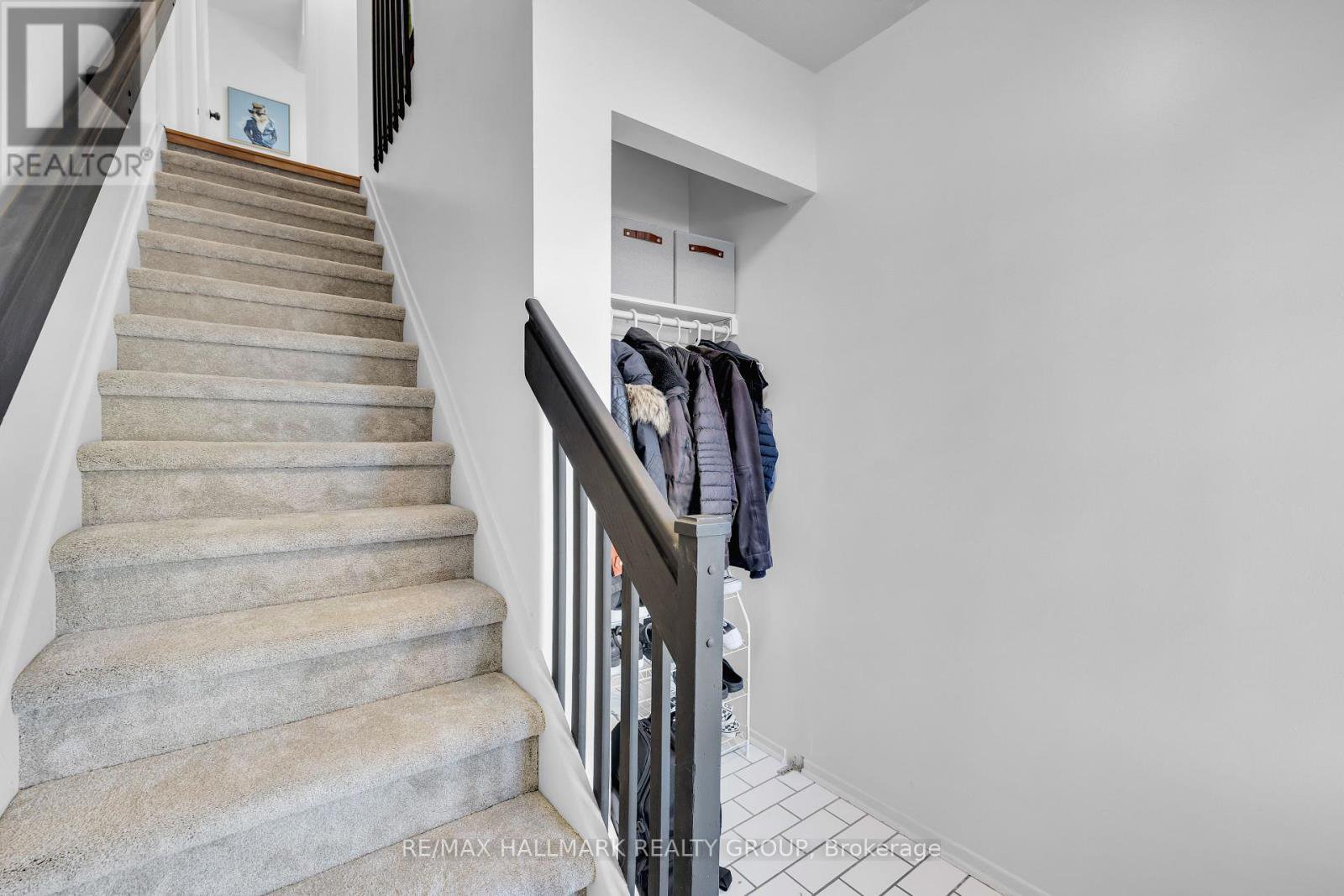 Bright and private, this 2-bedroom, 3-bath upper corner-unit condo townhouse offers the charm of a corner unit with three inviting outdoor spaces: a balcony off the living room, a private balcony from the primary suite, and a front yard. Set in a peaceful location surrounded by a natural stream, hiking trails, the Trans Canada Trail, and NCC woodlands, this home provides a serene retreat while remaining close to city conveniences. The main floor welcomes you with a spacious tiled foyer and closet. On the second level, the living and dining areas are bright and airy, featuring large windows, gleaming floors, and a cozy wood-burning fireplace; and you can step out onto the private balcony. The generous kitchen is well appointed with ample cabinetry, new counters, vinyl tile flooring, recessed lighting, and a stylish subway tile backsplash. A 2-piece bathroom with updated finishes and a separate laundry area with storage complete this level. Upstairs, both bedrooms and bathrooms have updated floorings. The generously sized primary bedroom is filled with natural light from two large windows and opens to a private balcony overlooking tranquil NCC green space. It also features a walk-in closet, a tasteful accent wall, and a 3-piece ensuite. The second bedroom, ideal as a guest room, home office, or child's room, is served by a full 4-piece bathroom. Additional highlights include a private front yard perfect for outdoor relaxation, plus surface and visitor parking on site. Conveniently located near amenities, restaurants, vibrant local breweries, shopping, parks, hiking/biking trails, DND, public transit, and highway access, this home is ideal for first-time buyers, investors, or downsizers.
