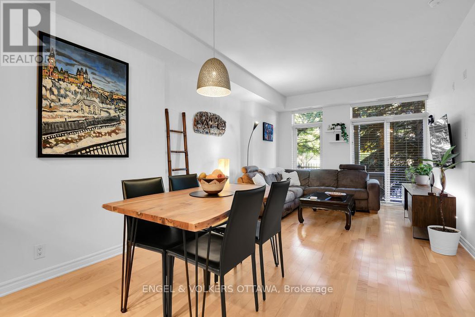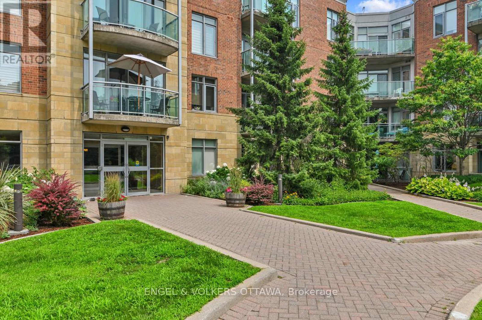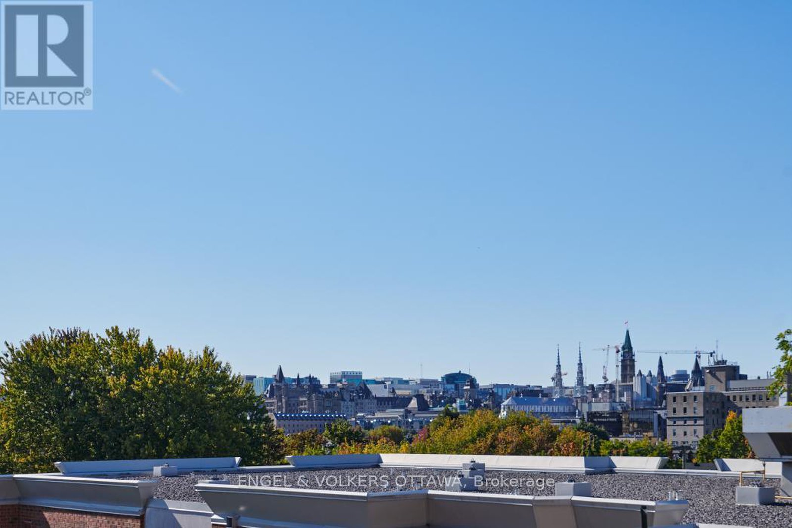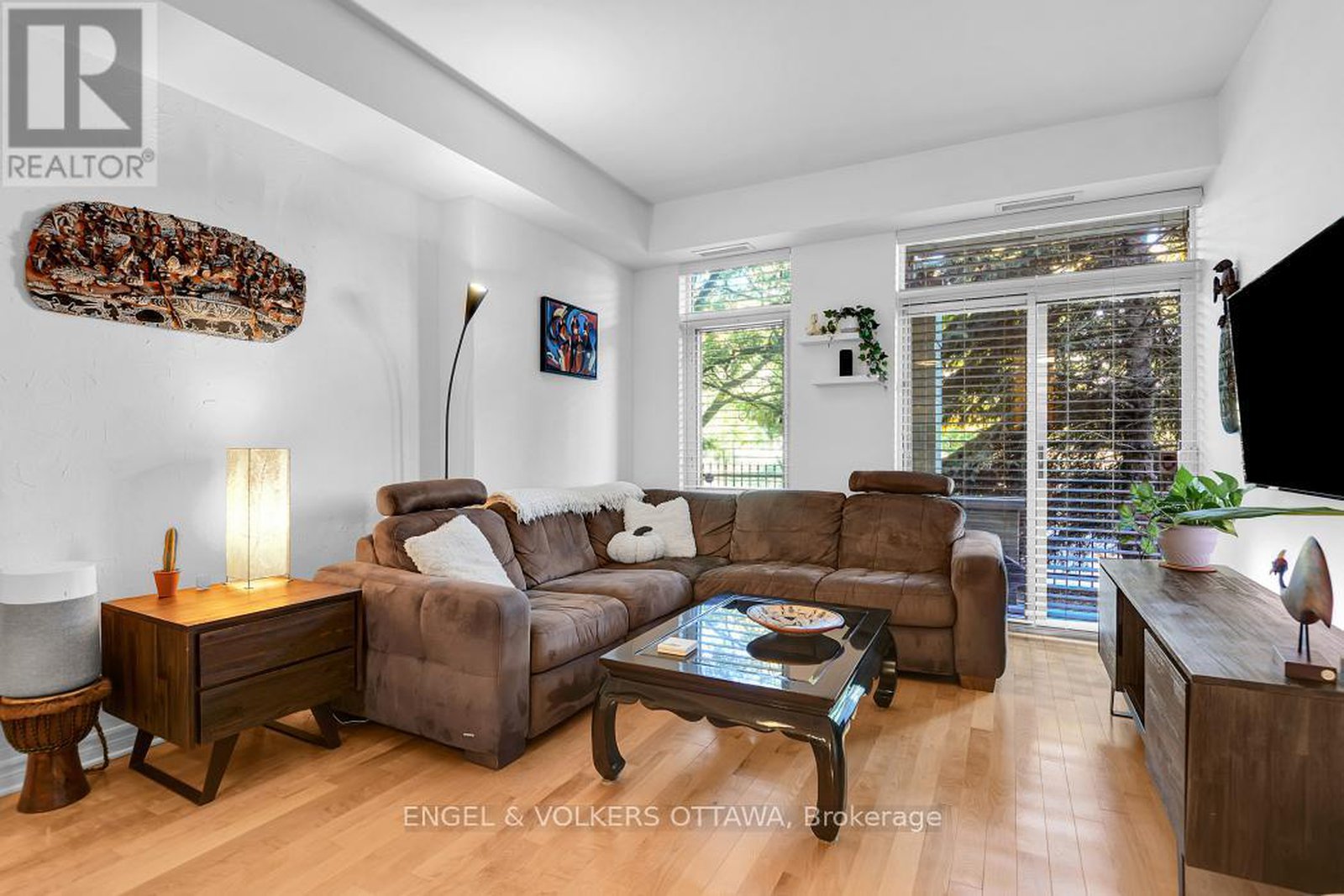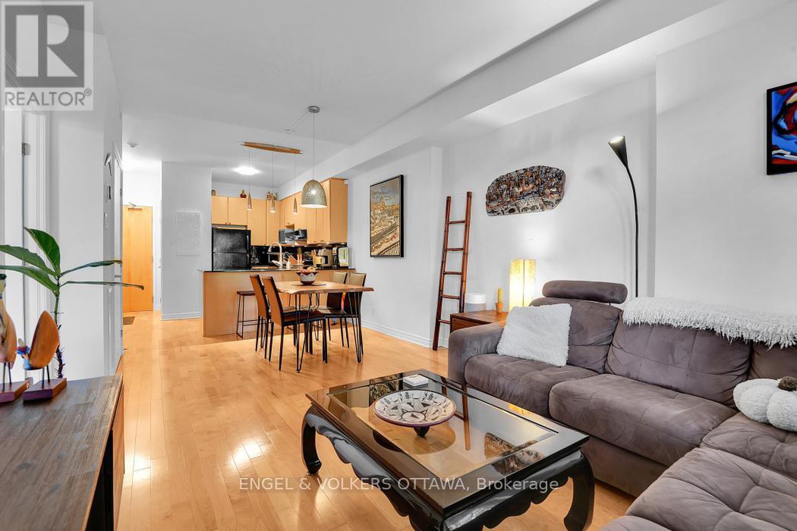 This freshly painted 760 sq ft. (as per floor plan) condo features 1 bedroom + a den and an updated bath (2025). Situated on the north end of the Byward Market giving you the best of both worlds. Walking distance to restaurants, cafes and everyday conveniences as well as minutes to Parliament Hill, Government Offices, Embassies and offices on Sussex Drive. Embrace and immerse yourself in the culture our city has to offer being walking distance to local farm and artisan's markets, cultural events, galleries, museums, cafes, boutiques, pubs, some amazing restaurants & active nightlife. The is the larger of the 1 + den layouts allowing for spacious open concept living including luxury granite counters and breakfast bar in the kitchen and convenience of living on the main floor - with patio doors leading you to a tranquil, private terrace, perfect if you have pets, or ideal for a quick exit on a bike ride or run. The condo building is surrounded by beautiful gardens and a central fountain to welcome you home. Amenities include: exercise room, party room with library, car wash bay, bike storage, 1 underground parking and 1 locker. Ample underground visitor parking and street parking.