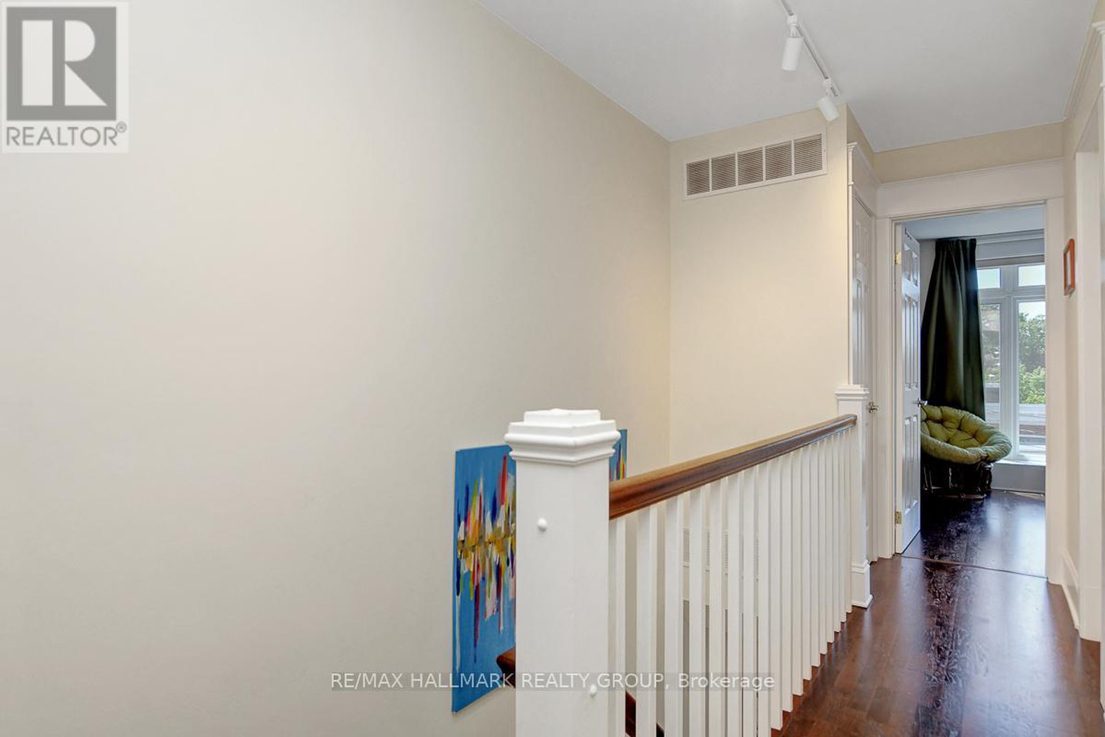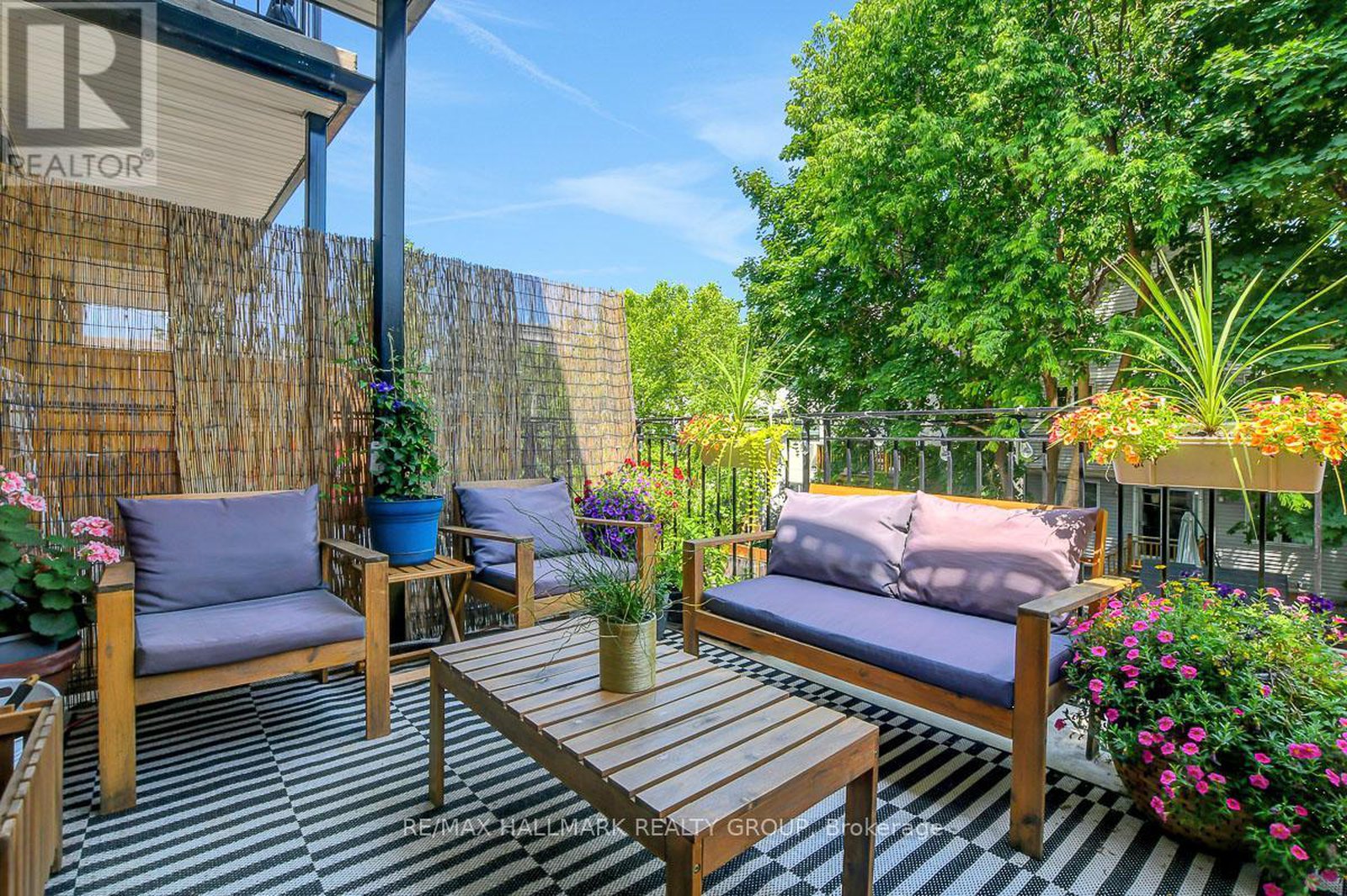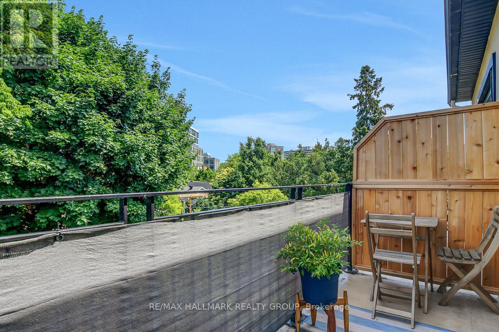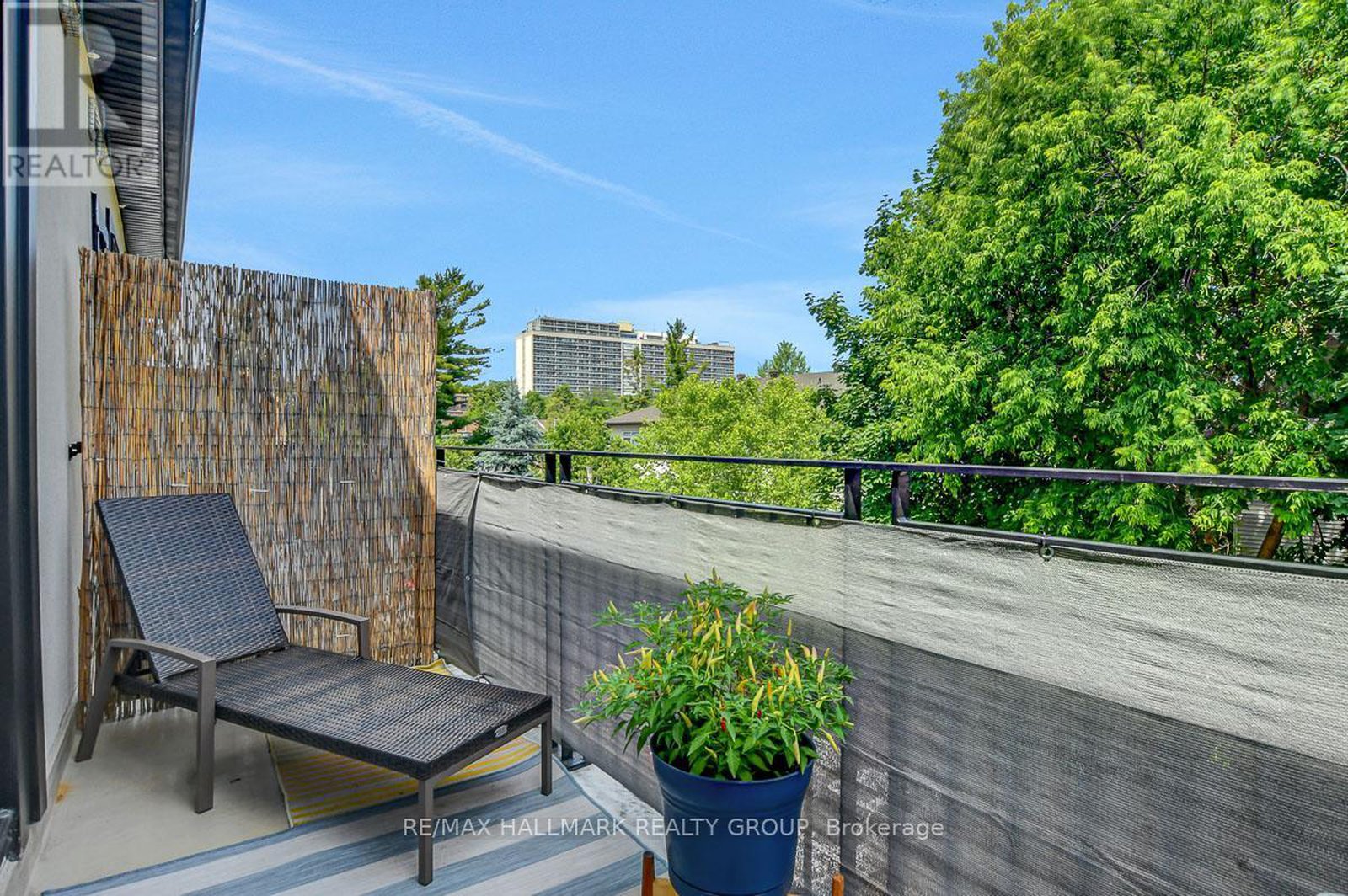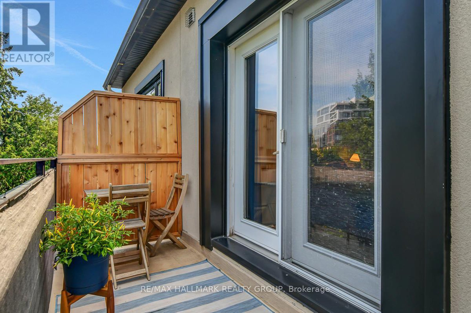 Chic, stylish, and inspired by classic NYC brownstones, this beautifully maintained Upper 2-bedroom townhouse is just steps from Beechwood Avenue. The light-filled main floor features soaring 9' ceilings, radiant heated engineered hardwood floors, LED lighting throughout, and a cozy gas fireplace framed by custom built-ins with exquisite glass shelves. The open-concept layout includes a modern kitchen with granite counters, a gas stove, island seating, and eye-catching glass pendant lights. Step out to your private rear balcony oasis - perfect for relaxing or entertaining, complete with extra storage. Upstairs, the spacious primary bedroom boasts two well-appointed closets, a luxurious 4-piece ensuite, and French doors leading to a second private balcony retreat. The second bedroom features oversized windows, a custom closet, and a built-in Murphy bed, making it ideal as a guest room or home office. A second full bathroom and in-unit laundry with Blomberg washer/dryer add to the convenience. Located in a vibrant walkable neighbourhood near shops, restaurants, Stanley Park, and Global Affairs. Easy access to downtown and a short walk to Rideau Hall Grounds or a meal at Tavern on the Falls with friends. A rare opportunity to enjoy refined urban living in one of Ottawa's most sought-after communities. Recently updated: front concrete stairs, freshly painted stair handrails and balcony railings. Bosch Silence Plus dishwasher (4 yrs old), newer vanity in 2nd bathroom (2024). Features include: surround sound in living room, retractable screen on main balcony, storage shed on main balcony, interior painted with high quality Sherwin Williams washable paint. Pets are welcome (certain restrictions apply). No smoking inside/outside. Condo fees cover: building insurance, water/sewer, maintenance & repairs, landscaping, snow removal, reserve fund.