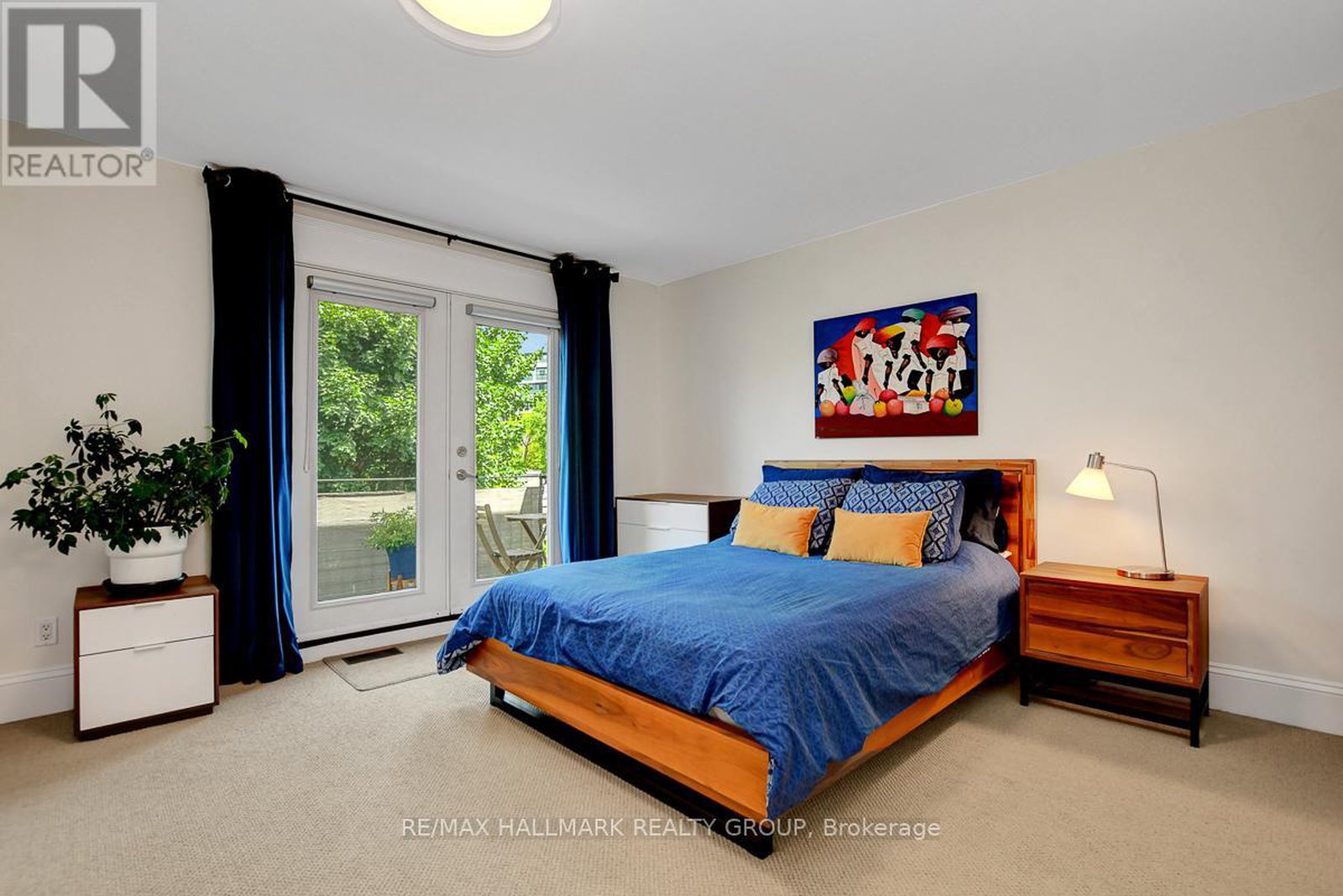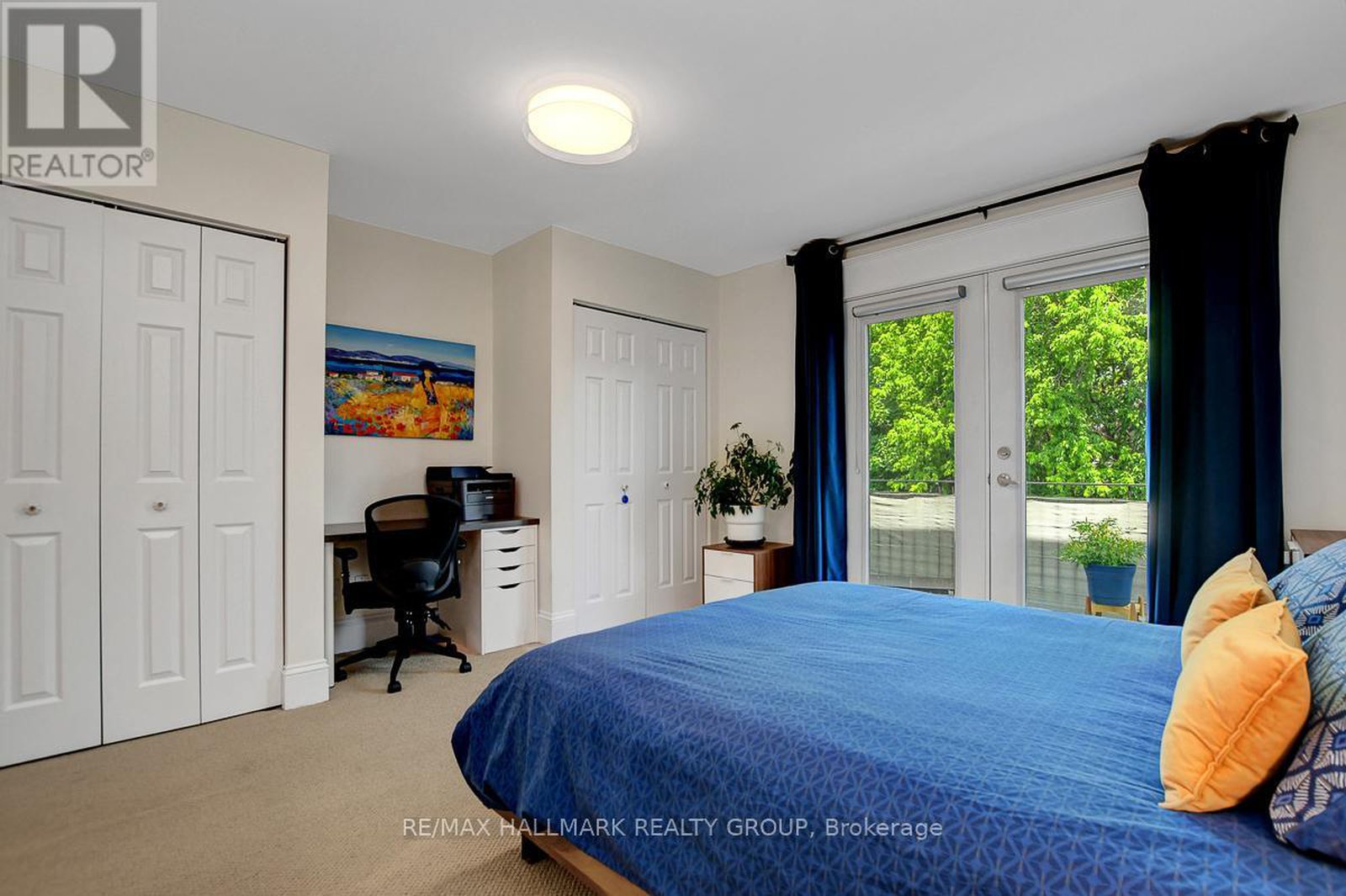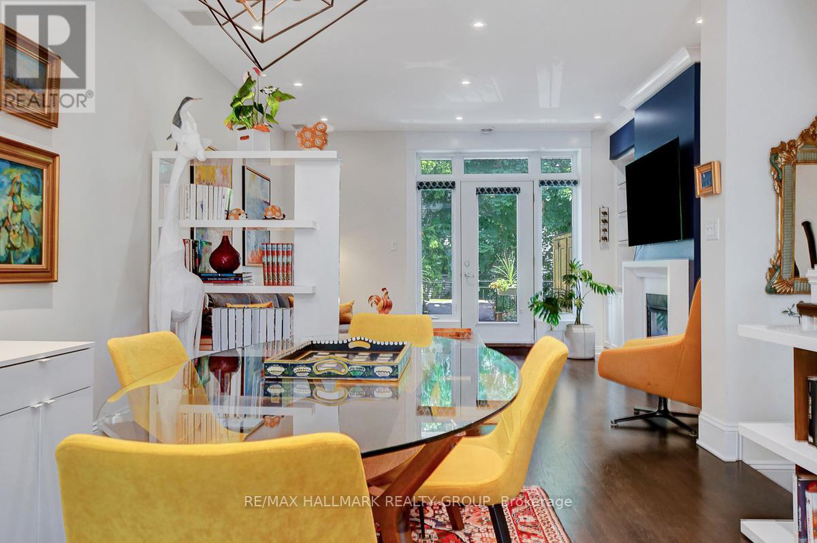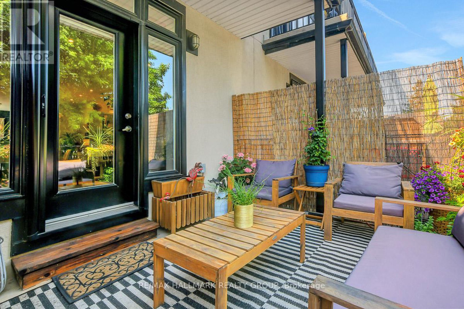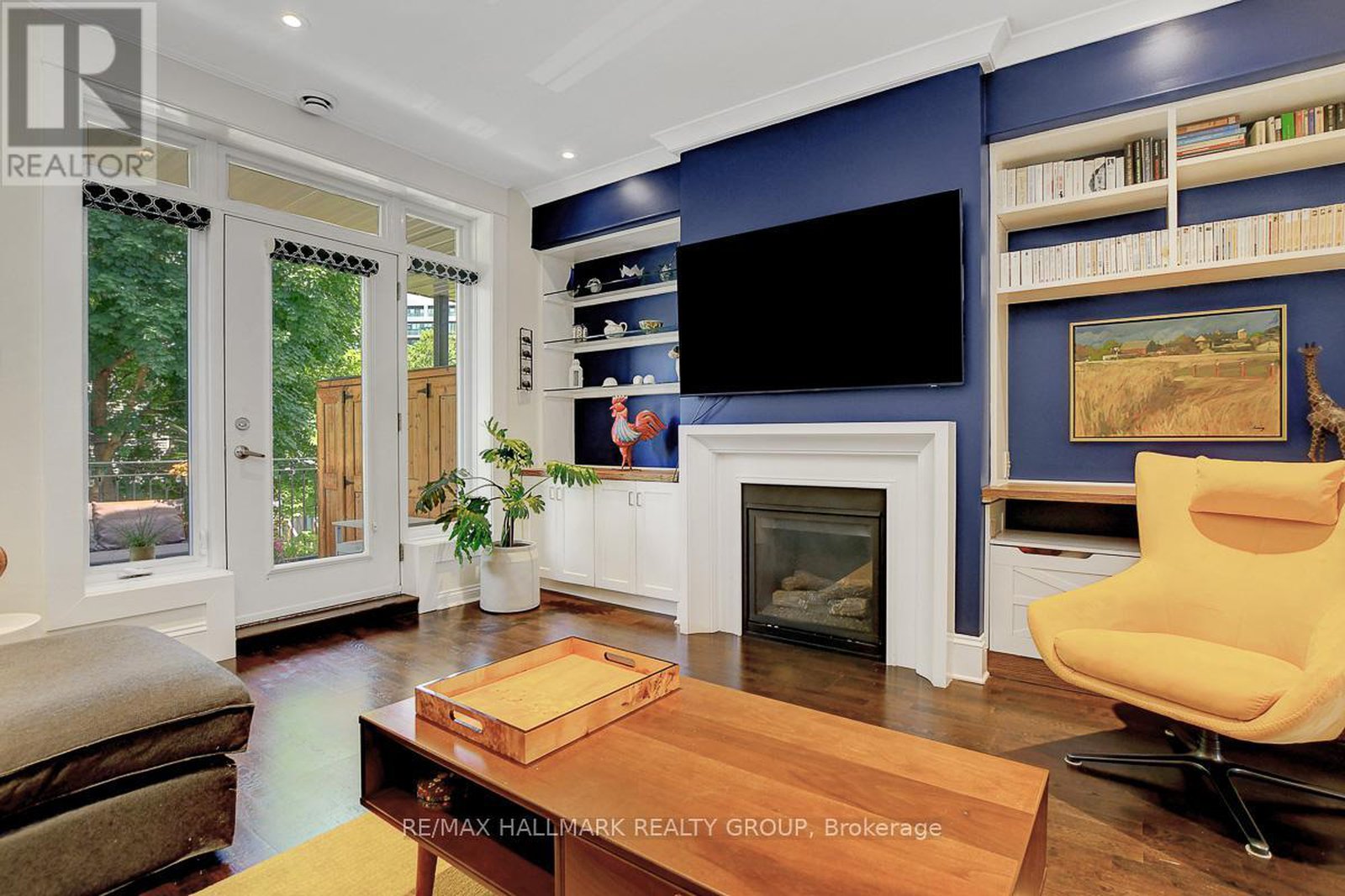 Chic, stylish, and inspired by classic NYC brownstones, this beautifully maintained Upper 2-bedroom townhouse is just steps from Beechwood Avenue. The light-filled main floor features soaring 9' ceilings, radiant heated engineered hardwood floors, LED lighting throughout, and a cozy gas fireplace framed by custom built-ins with exquisite glass shelves. The open-concept layout includes a modern kitchen with granite counters, a gas stove, island seating, and eye-catching glass pendant lights. Step out to your private rear balcony oasis - perfect for relaxing or entertaining, complete with extra storage. Upstairs, the spacious primary bedroom boasts two well-appointed closets, a luxurious 4-piece ensuite, and French doors leading to a second private balcony retreat. The second bedroom features oversized windows, a custom closet, and a built-in Murphy bed, making it ideal as a guest room or home office. A second full bathroom and in-unit laundry with Blomberg washer/dryer add to the convenience. Located in a vibrant walkable neighbourhood near shops, restaurants, Stanley Park, and Global Affairs. Easy access to downtown and a short walk to Rideau Hall Grounds or a meal at Tavern on the Falls with friends. A rare opportunity to enjoy refined urban living in one of Ottawa's most sought-after communities. Recently updated: front concrete stairs, freshly painted stair handrails and balcony railings. Bosch Silence Plus dishwasher (4 yrs old), newer vanity in 2nd bathroom (2024). Features include: surround sound in living room, retractable screen on main balcony, storage shed on main balcony, interior painted with high quality Sherwin Williams washable paint. Pets are welcome (certain restrictions apply). No smoking inside/outside. Condo fees cover: building insurance, water/sewer, maintenance & repairs, landscaping, snow removal, reserve fund.