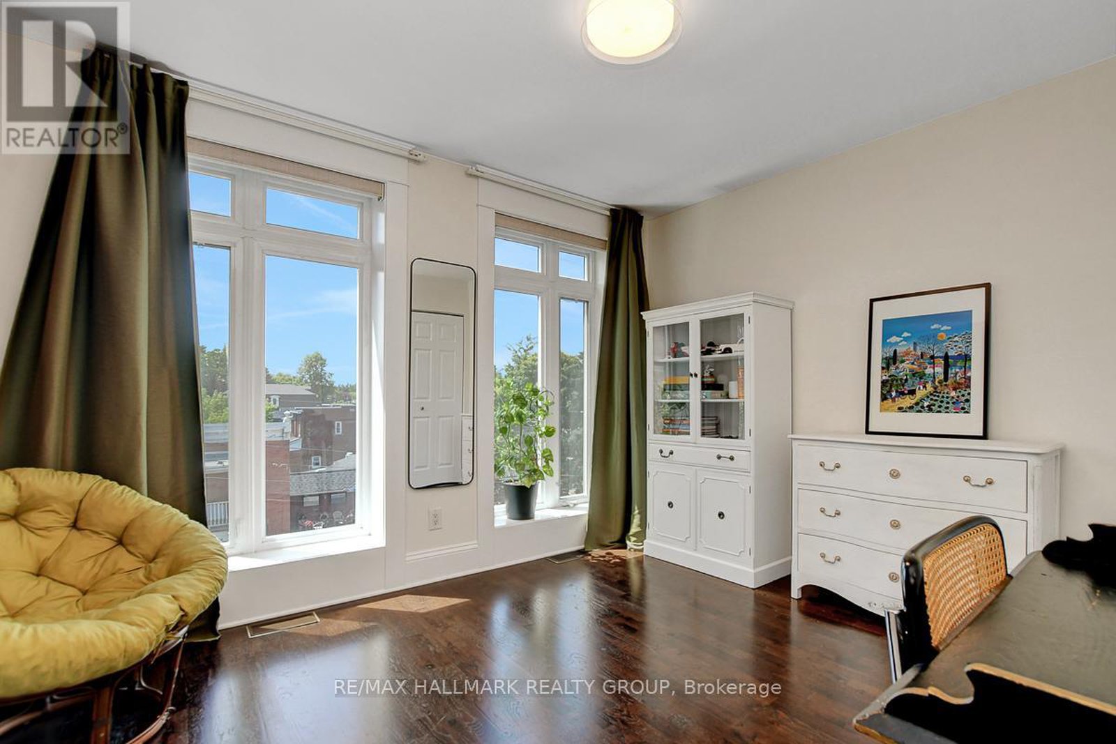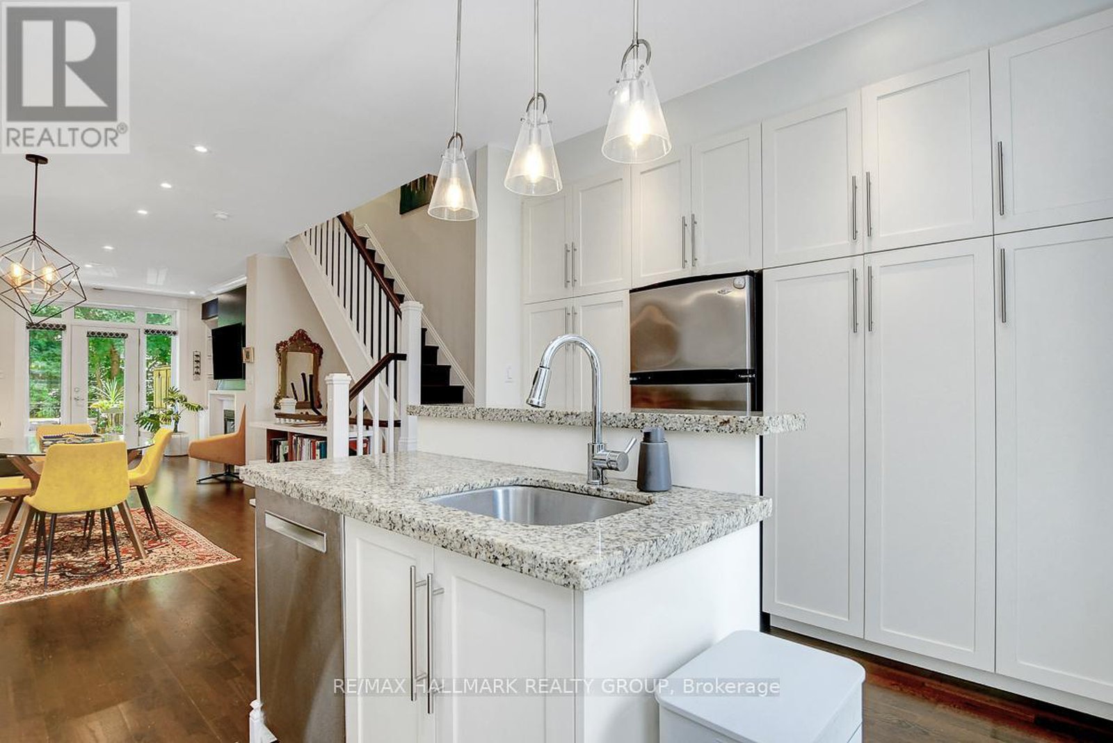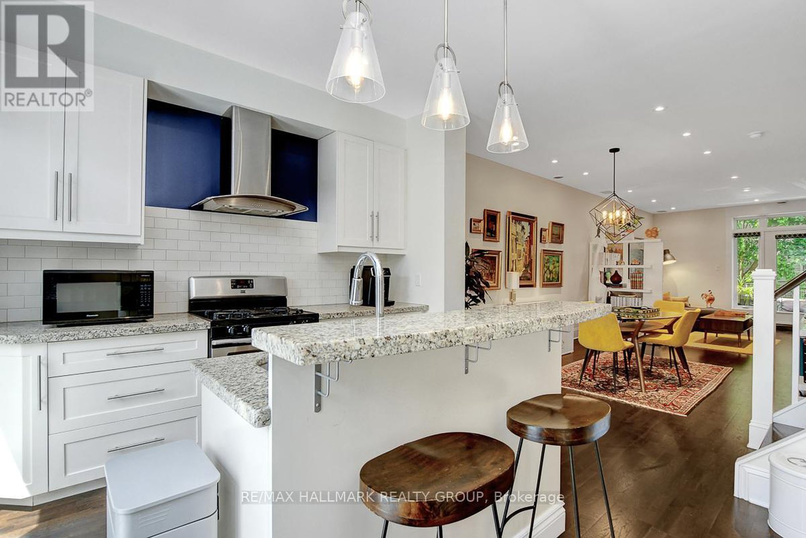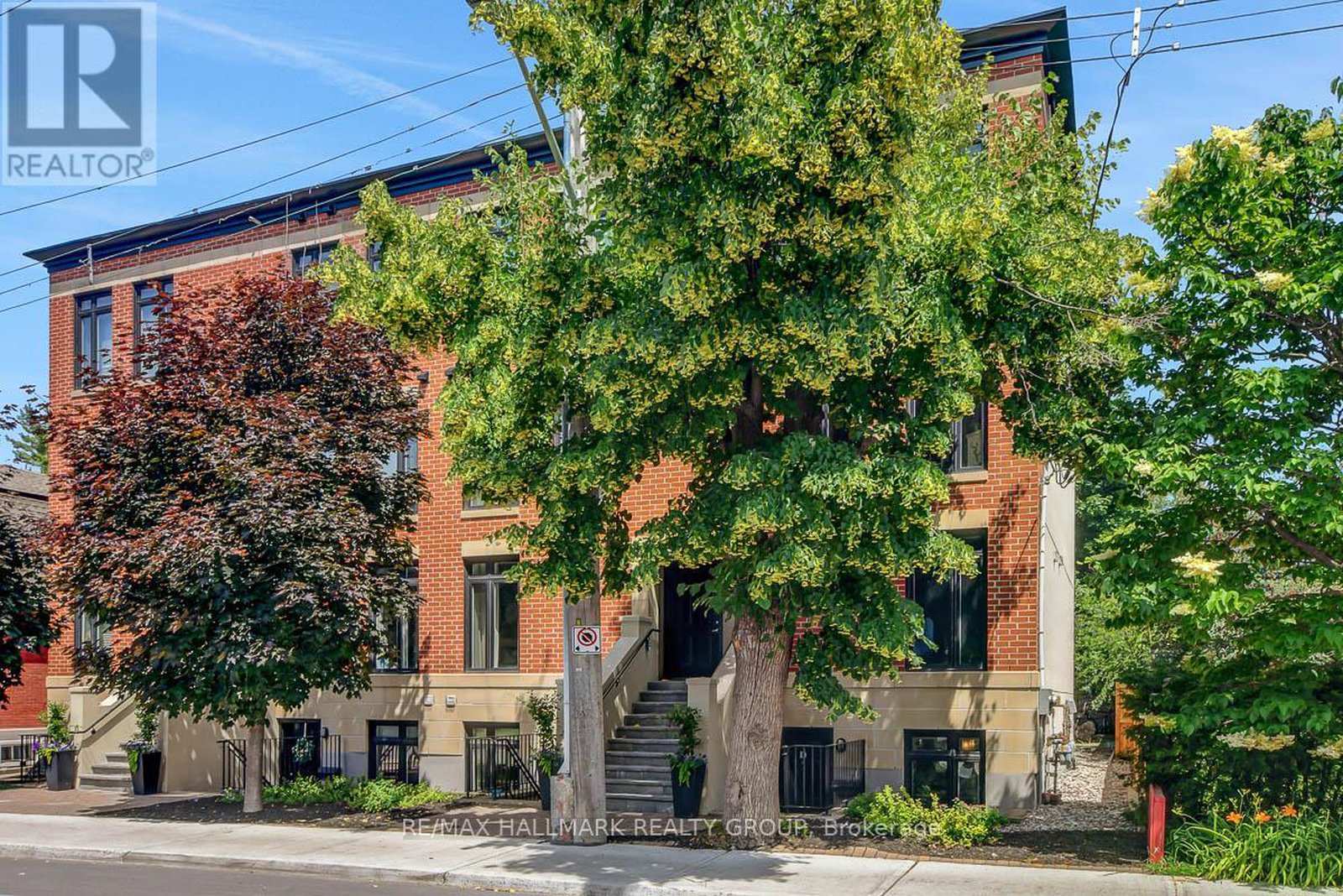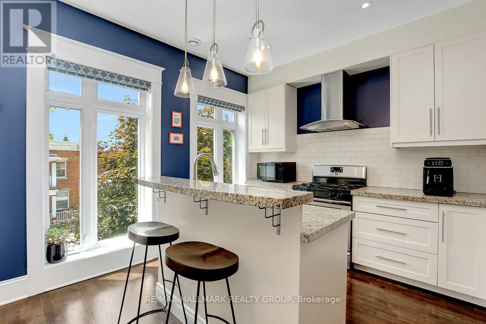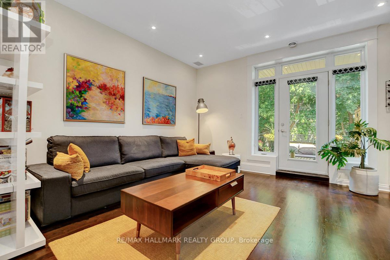 Chic, stylish, and inspired by classic NYC brownstones, this beautifully maintained Upper 2-bedroom townhouse is just steps from Beechwood Avenue. The light-filled main floor features soaring 9' ceilings, radiant heated engineered hardwood floors, LED lighting throughout, and a cozy gas fireplace framed by custom built-ins with exquisite glass shelves. The open-concept layout includes a modern kitchen with granite counters, a gas stove, island seating, and eye-catching glass pendant lights. Step out to your private rear balcony oasis - perfect for relaxing or entertaining, complete with extra storage. Upstairs, the spacious primary bedroom boasts two well-appointed closets, a luxurious 4-piece ensuite, and French doors leading to a second private balcony retreat. The second bedroom features oversized windows, a custom closet, and a built-in Murphy bed, making it ideal as a guest room or home office. A second full bathroom and in-unit laundry with Blomberg washer/dryer add to the convenience. Located in a vibrant walkable neighbourhood near shops, restaurants, Stanley Park, and Global Affairs. Easy access to downtown and a short walk to Rideau Hall Grounds or a meal at Tavern on the Falls with friends. A rare opportunity to enjoy refined urban living in one of Ottawa's most sought-after communities. Recently updated: front concrete stairs, freshly painted stair handrails and balcony railings. Bosch Silence Plus dishwasher (4 yrs old), newer vanity in 2nd bathroom (2024). Features include: surround sound in living room, retractable screen on main balcony, storage shed on main balcony, interior painted with high quality Sherwin Williams washable paint. Pets are welcome (certain restrictions apply). No smoking inside/outside. Condo fees cover: building insurance, water/sewer, maintenance & repairs, landscaping, snow removal, reserve fund.