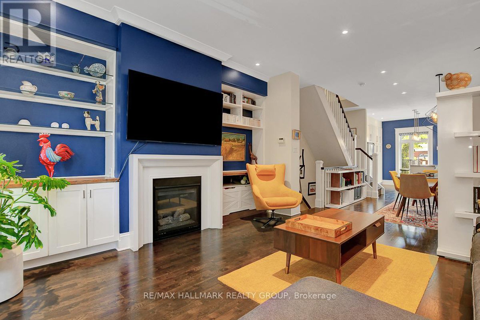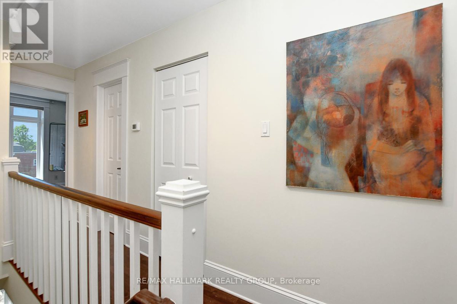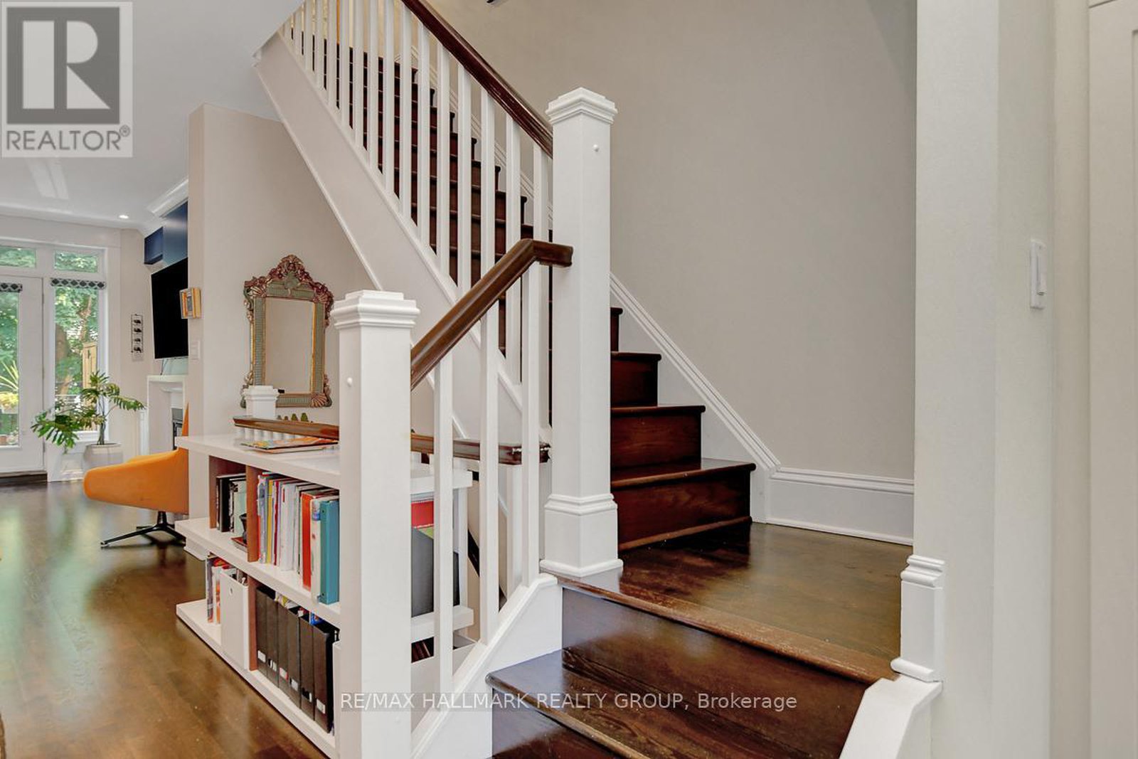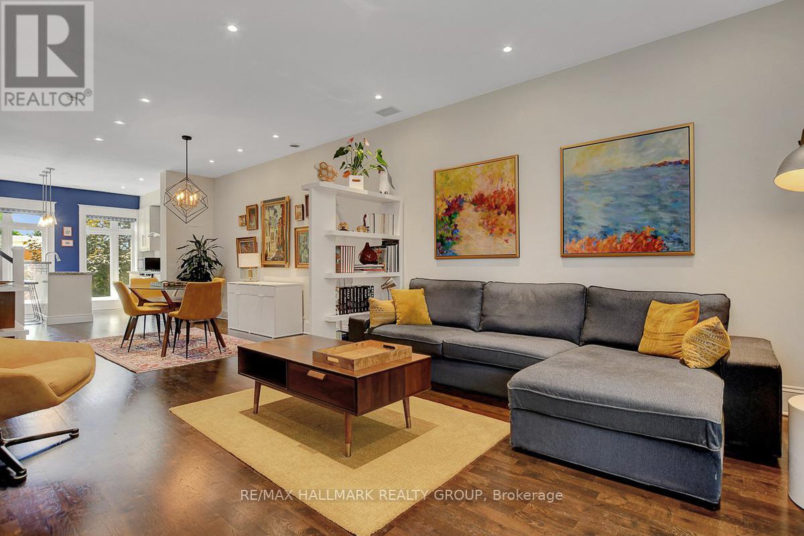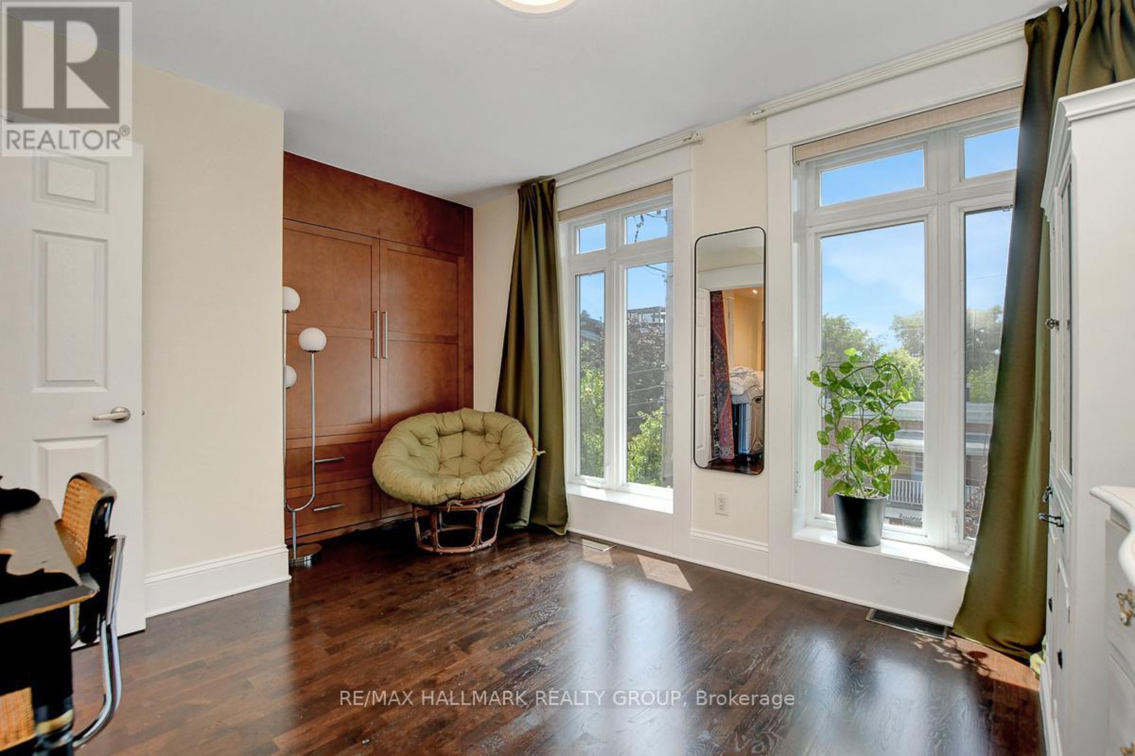 Chic, stylish, and inspired by classic NYC brownstones, this beautifully maintained Upper 2-bedroom townhouse is just steps from Beechwood Avenue. The light-filled main floor features soaring 9' ceilings, radiant heated engineered hardwood floors, LED lighting throughout, and a cozy gas fireplace framed by custom built-ins with exquisite glass shelves. The open-concept layout includes a modern kitchen with granite counters, a gas stove, island seating, and eye-catching glass pendant lights. Step out to your private rear balcony oasis - perfect for relaxing or entertaining, complete with extra storage. Upstairs, the spacious primary bedroom boasts two well-appointed closets, a luxurious 4-piece ensuite, and French doors leading to a second private balcony retreat. The second bedroom features oversized windows, a custom closet, and a built-in Murphy bed, making it ideal as a guest room or home office. A second full bathroom and in-unit laundry with Blomberg washer/dryer add to the convenience. Located in a vibrant walkable neighbourhood near shops, restaurants, Stanley Park, and Global Affairs. Easy access to downtown and a short walk to Rideau Hall Grounds or a meal at Tavern on the Falls with friends. A rare opportunity to enjoy refined urban living in one of Ottawa's most sought-after communities. Recently updated: front concrete stairs, freshly painted stair handrails and balcony railings. Bosch Silence Plus dishwasher (4 yrs old), newer vanity in 2nd bathroom (2024). Features include: surround sound in living room, retractable screen on main balcony, storage shed on main balcony, interior painted with high quality Sherwin Williams washable paint. Pets are welcome (certain restrictions apply). No smoking inside/outside. Condo fees cover: building insurance, water/sewer, maintenance & repairs, landscaping, snow removal, reserve fund.