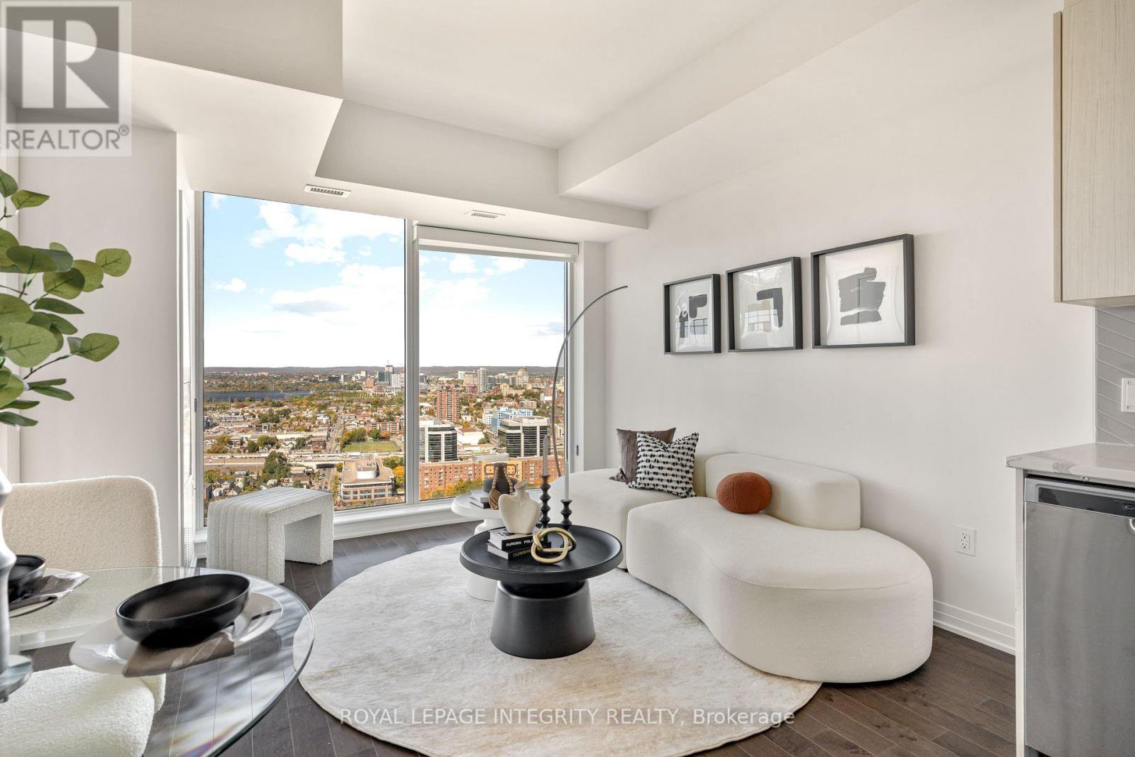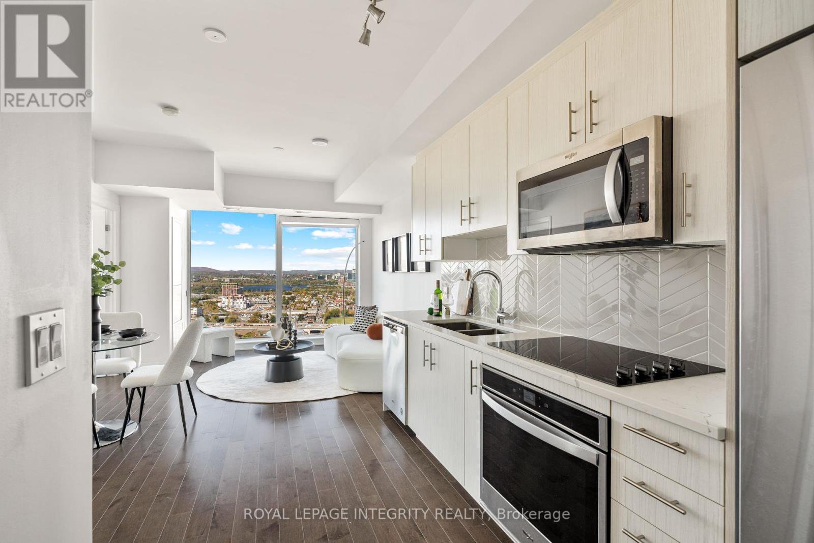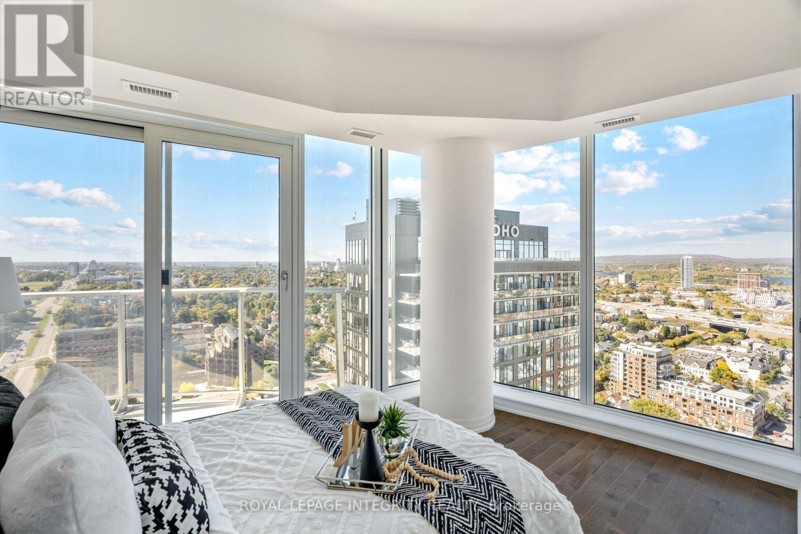 ** OPEN HOUSE: Sunday, October 5 at 2-4 PM** Welcome to elevated living at The Icon - Ottawa's most prestigious address. Perched on the 29th floor, this freshly painted corner-unit residence offers breathtaking views of the Gatineau Hills and radiant sunsets over the city. Designed for the discerning buyer, this 2-bedroom, 1-bath home is a masterclass in sophistication and comfort. Step inside to a bright, open-concept layout adorned with soaring 9-ft ceilings, floor-to-ceiling windows, and timeless finishes. Sleek hardwood floors flow throughout, anchored by the chefs kitchen complete with gleaming quartz countertops, modern cabinetry, and high-end stainless steel appliances. Both bedrooms offer large closets and access to a private, shared balcony - perfect for your morning coffee or evening wine with panoramic views. Enjoy the ease of in-unit laundry, underground parking, and a spacious storage locker. Resort-style amenities elevate your lifestyle: fully equipped gym with lake views, yoga studio, indoor pool, sauna, theatre, party room, rooftop terrace with BBQs, and 24-hour concierge service. Located beside Dows Lake and vibrant Little Italy, you're surrounded by Ottawa's best dining, cafés, festivals, and outdoor activities - skating, kayaking, cycling and more. Just minutes from downtown. Live above it all - luxury, lifestyle, location. Book your private showing today!
