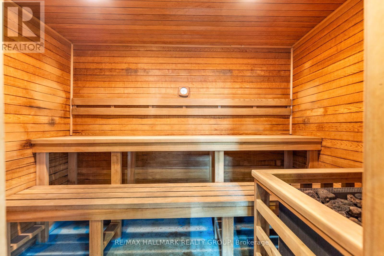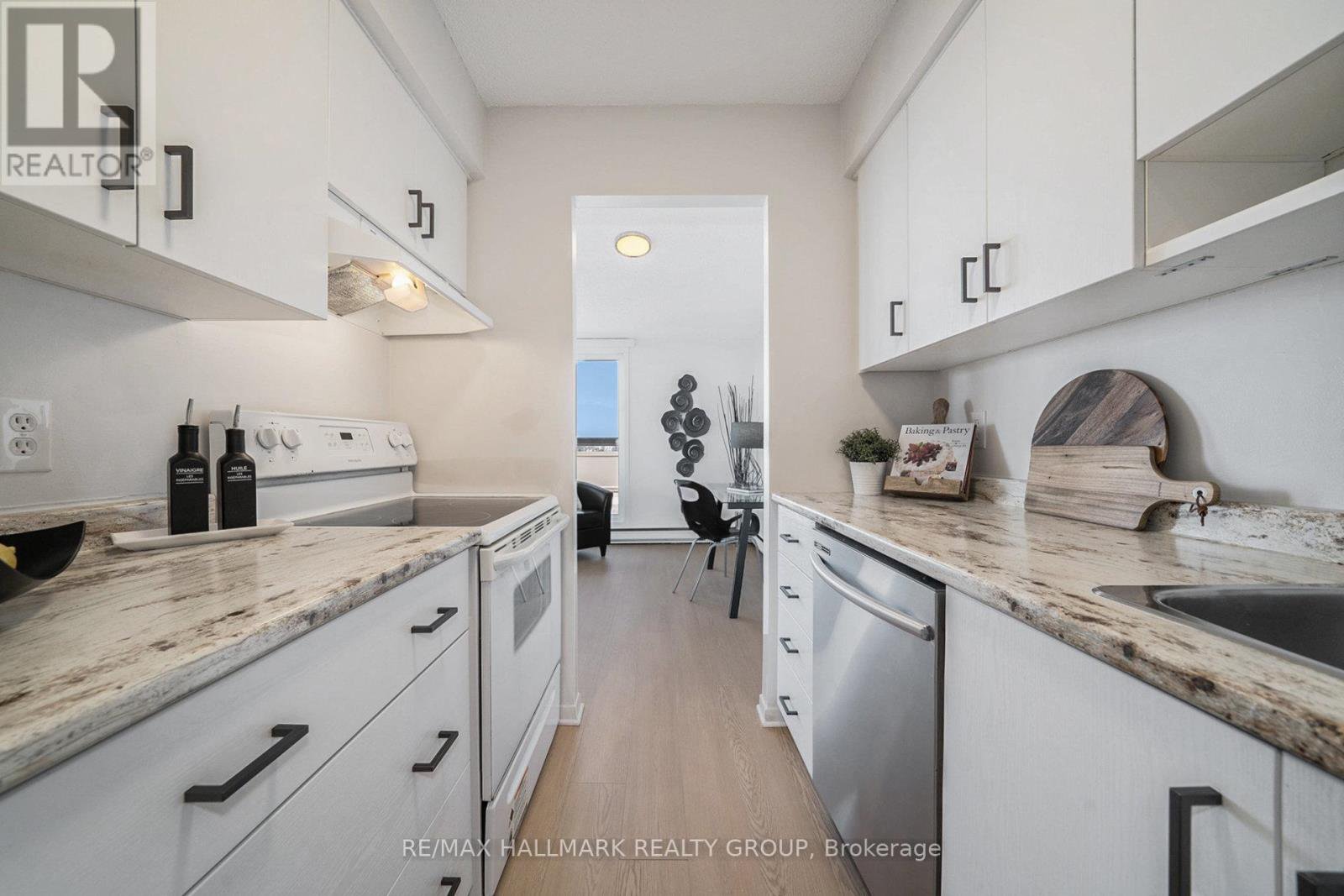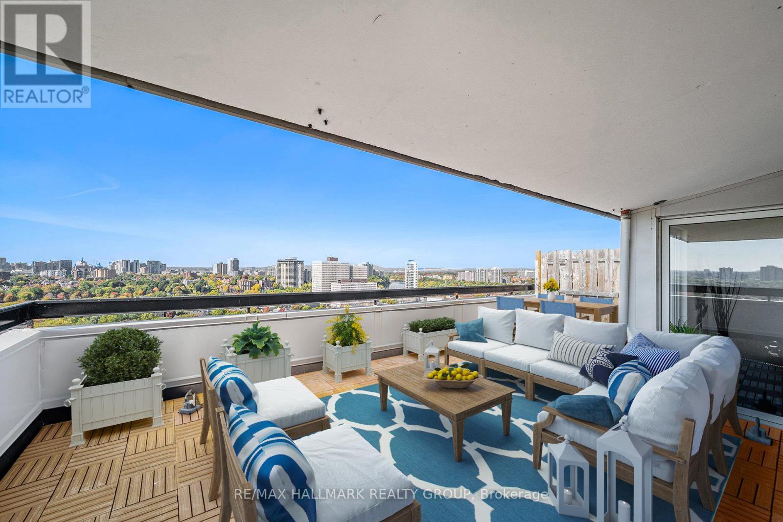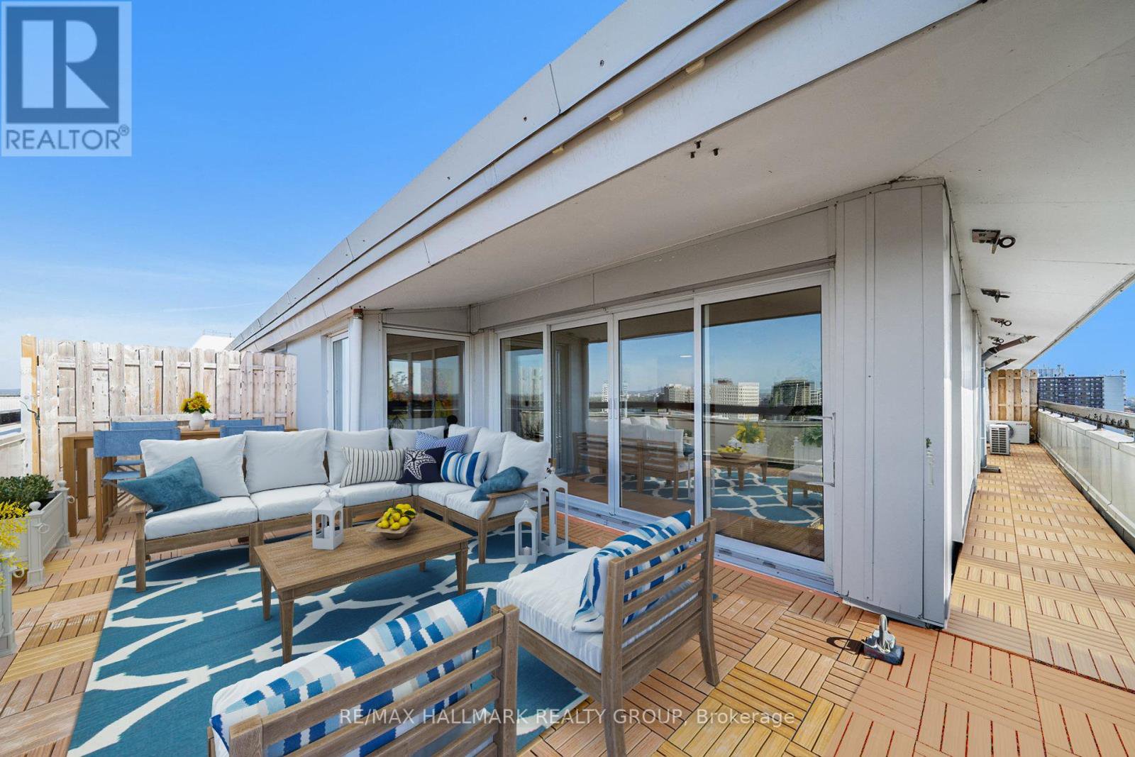 This remarkable condo will appeal to the Buyer who can really see its TRUE value. Just shy of 1000 "real" square feet, this Penthouse unit with kick-ass westerly views to downtown's skyline and the lazy Rideau River, with a huge 400+ sq ft deck to entertain and relax on as well as unique vaulted ceilings throughout the interior spaces making this light filled apartment just shine! This unit has 2 full bathrooms ( only the penthouses do in this entire complex of three towers), both have been updated. The kitchen was also upgraded and is very functional now but it could we really "wow" if you knocked down the wall to the living space. We've combined the living and dining room spaces and created a home-office/den area off the kitchen. There is a handy storage closet IN the unit as well as your own exclusive use locker just a few steps up from your apartment, not in the common basement area. The only modern convenience missing in the unit is laundry but this building has a very pleasant ground floor laundry room for residents to use. As well, you've got one assigned parking spot at your disposal. Don't own a car? (you really don't need one living here!), rent it out to a fellow resident. Reasonable condo fees with excellent amenities. Super well managed complex with onsite office. Bus to Parliament Hill in 20, bike in 15, walk in under 45.... the Rideau River bike and ski paths are practically at your door. Loblaws and the Green Fresh grocer are across the street as is Louis Pizza: an Ottawa classic! don't let the Brutalist architecture of the tower dissuade you form looking at this incredibly unique and super affordable condo. Cats and birds permitted but not dogs. No smoking. Status Certificate package on file. Rooms listed as "Other": first one is the in suite storage and the second is the patio