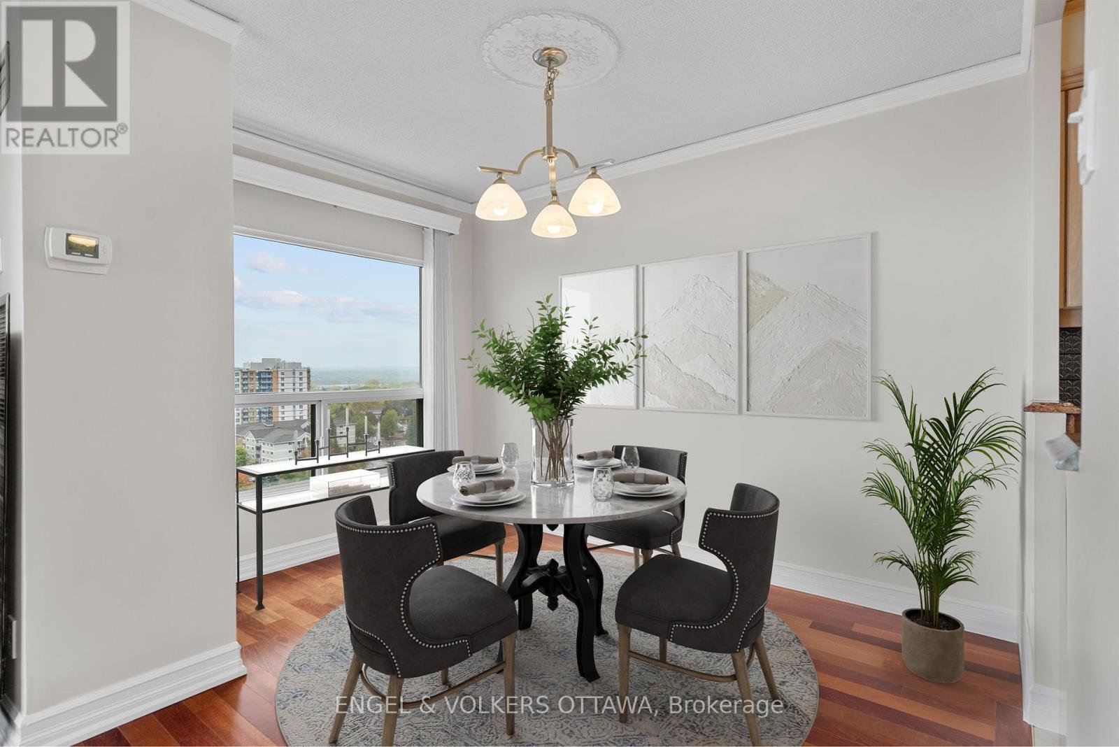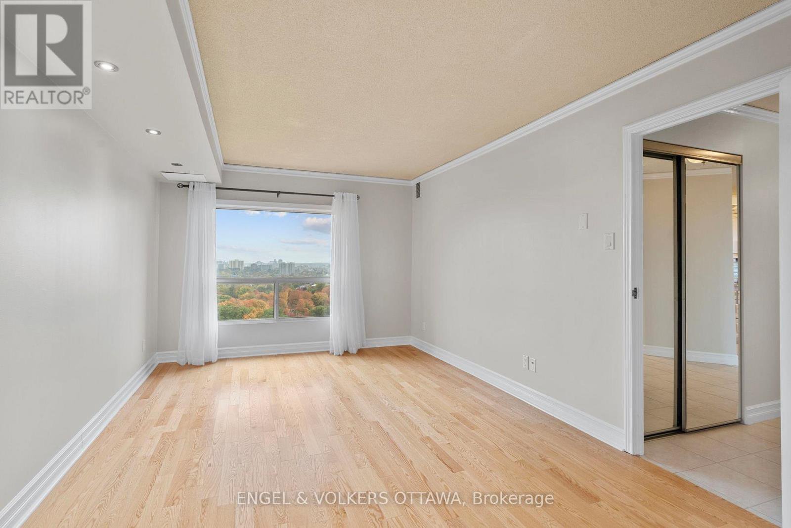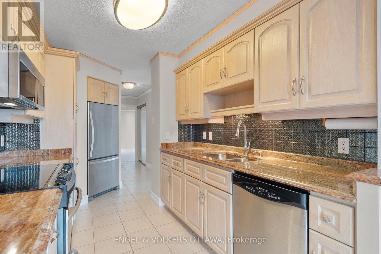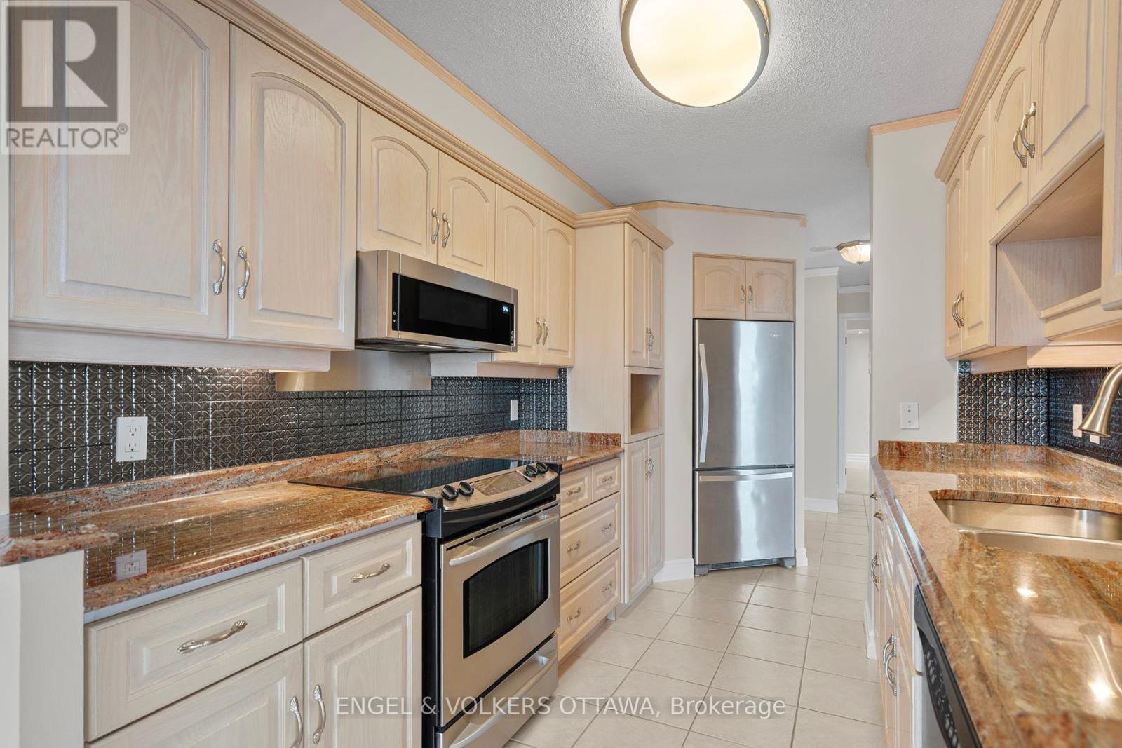 Welcome to unit 1604 at 545 St. Laurent Blvd, an elegant and spacious 2 bedroom, 2 bathroom condo offering elevated living with panoramic views and resort style amenities, in a convenient and well connected location. This beautifully maintained unit features a bright open-concept layout with soaring windows and rich hardwood floors throughout. The kitchen is equipped with sleek cabinetry, high end appliances, and plenty of counter space ideal for both everyday living and entertaining. The living and dining spaces flow seamlessly to a private balcony where you can enjoy expansive views to the west and north and fresh air. The generously sized primary bedroom offers a walk in closet and private and renovated 4 piece ensuite, while the second bedroom is perfect for guests, a home office, or both. The unit also features a second 3 piece, renovated bathroom with gorgeous tiled walk in shower, and convenient in unit laundry. Underground parking and a dedicated storage locker are included for added convenience. Residents of this building enjoy an impressive list of amenities: an exclusive private park with an outdoor pool and tennis courts, a recreation centre with an indoor pool, gym, squash court, and sauna, a party room for entertaining, secure bike storage, and 24-hour security. Ideally located near shops, restaurants, transit, parks, and the Rideau River, this is a rare opportunity to enjoy space, comfort, and lifestyle in a truly complete package.