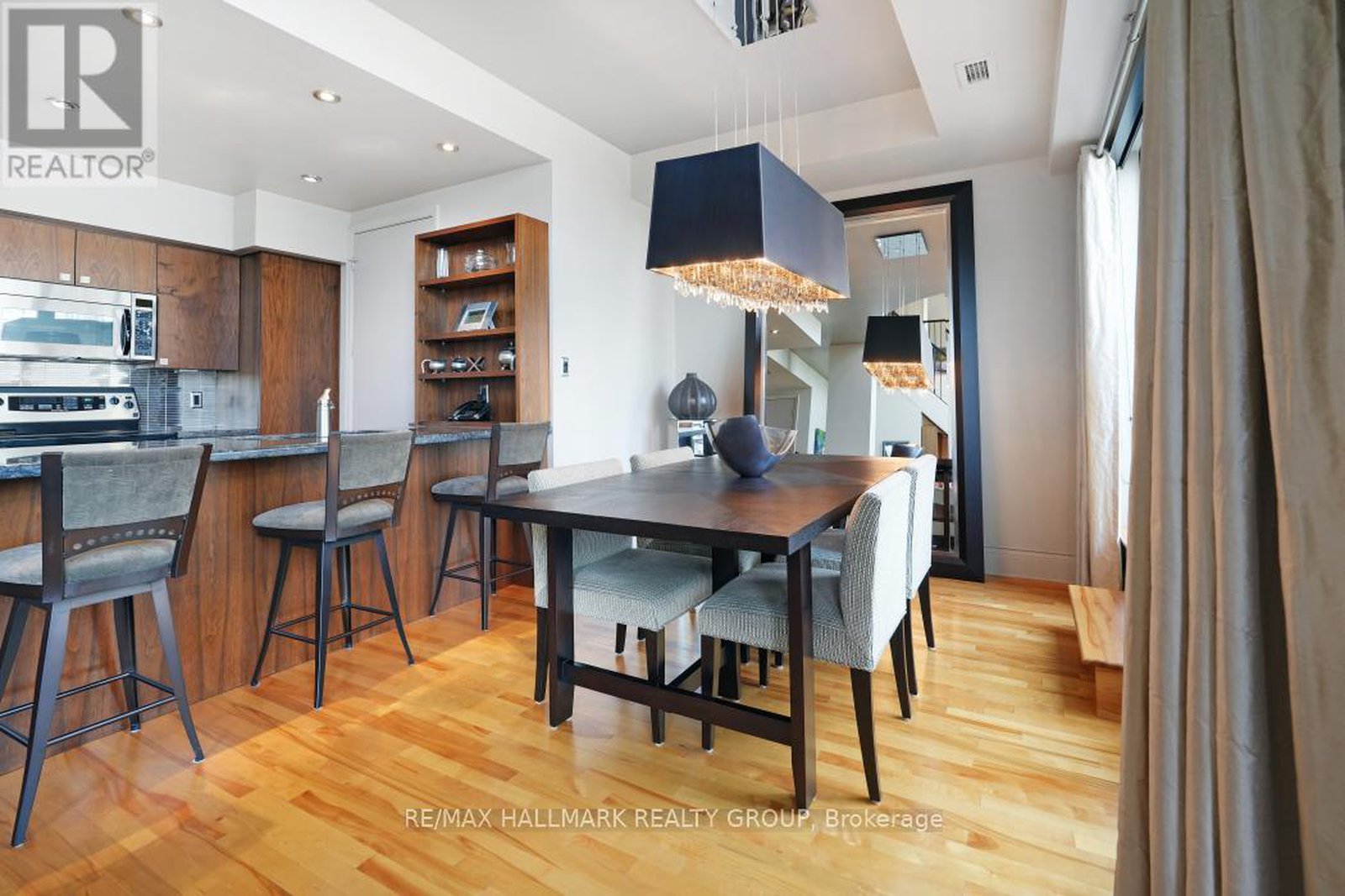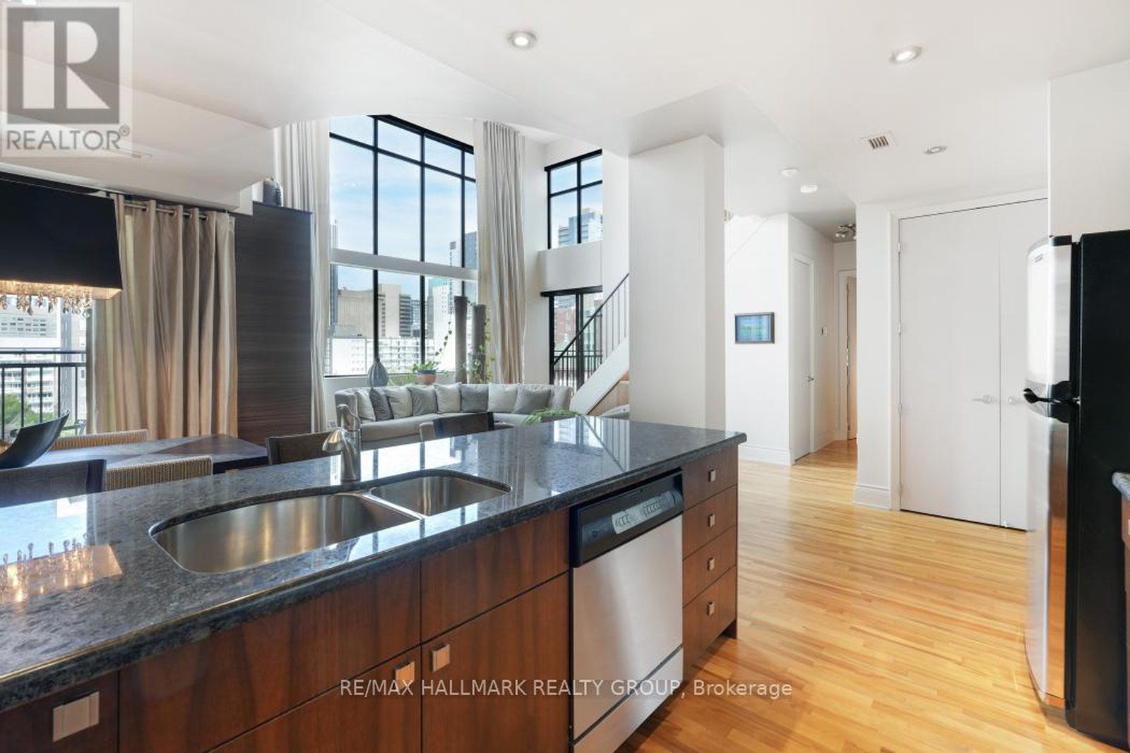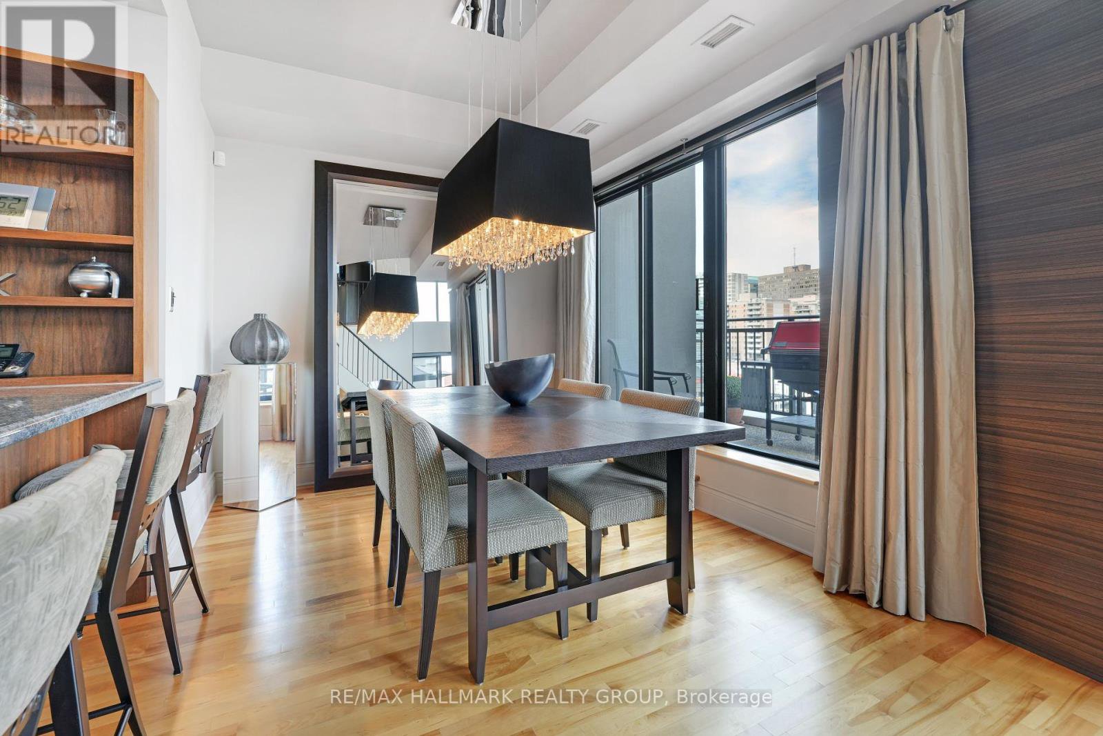 Stunning two storey penthouse apartment exemplifying modern luxury and sophisticated urban living. 1760 square feet of exceptional living space distinguished by a striking design with soaring ceilings and expansive two storey windows. Open concept living and dining rooms featuring a natural gas fireplace with custom built surround and access to a private terrace framed by open views and designed to elevate both everyday living and entertaining. Beautifully updated chefs kitchen with custom cabinets, granite countertops, sleek stainless steel backsplash and large breakfast bar. Conveniently situated main floor bedroom with direct access to a private terrace for a secluded outdoor retreat. The second floor features a spacious primary bedroom suite and an amazing loft inspired entertainment room highlighted with wall to wall windows and picturesque cityscape views. This fabulous penthouse offers an ideal blend of style, comfort and functionality making it a truly remarkable place to call home. Enjoy the best of downtown living within walking distance to Parliament Hill, the Rideau Centre, Rideau Canal, National Arts Centre and an array of restaurants, cafés, boutiques, and everyday conveniences.