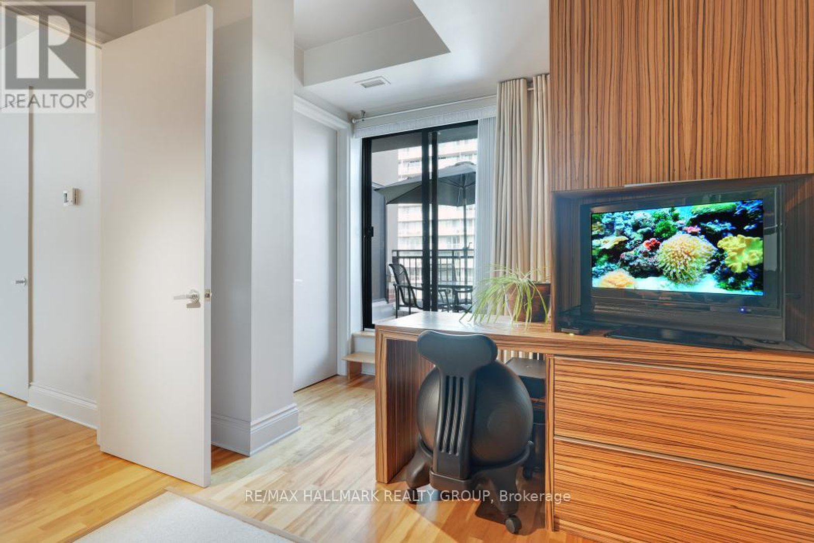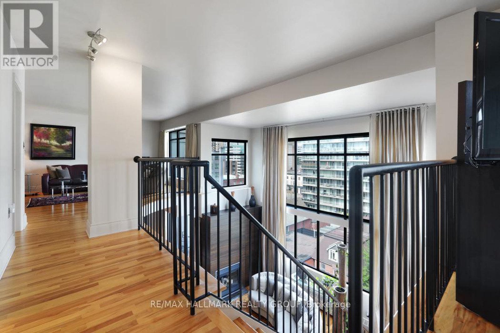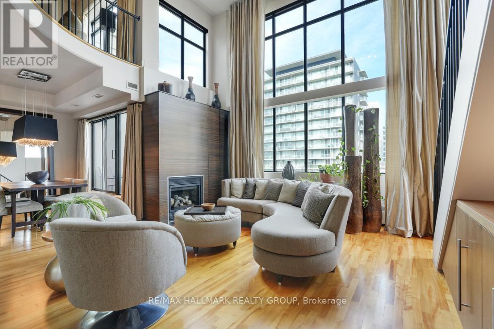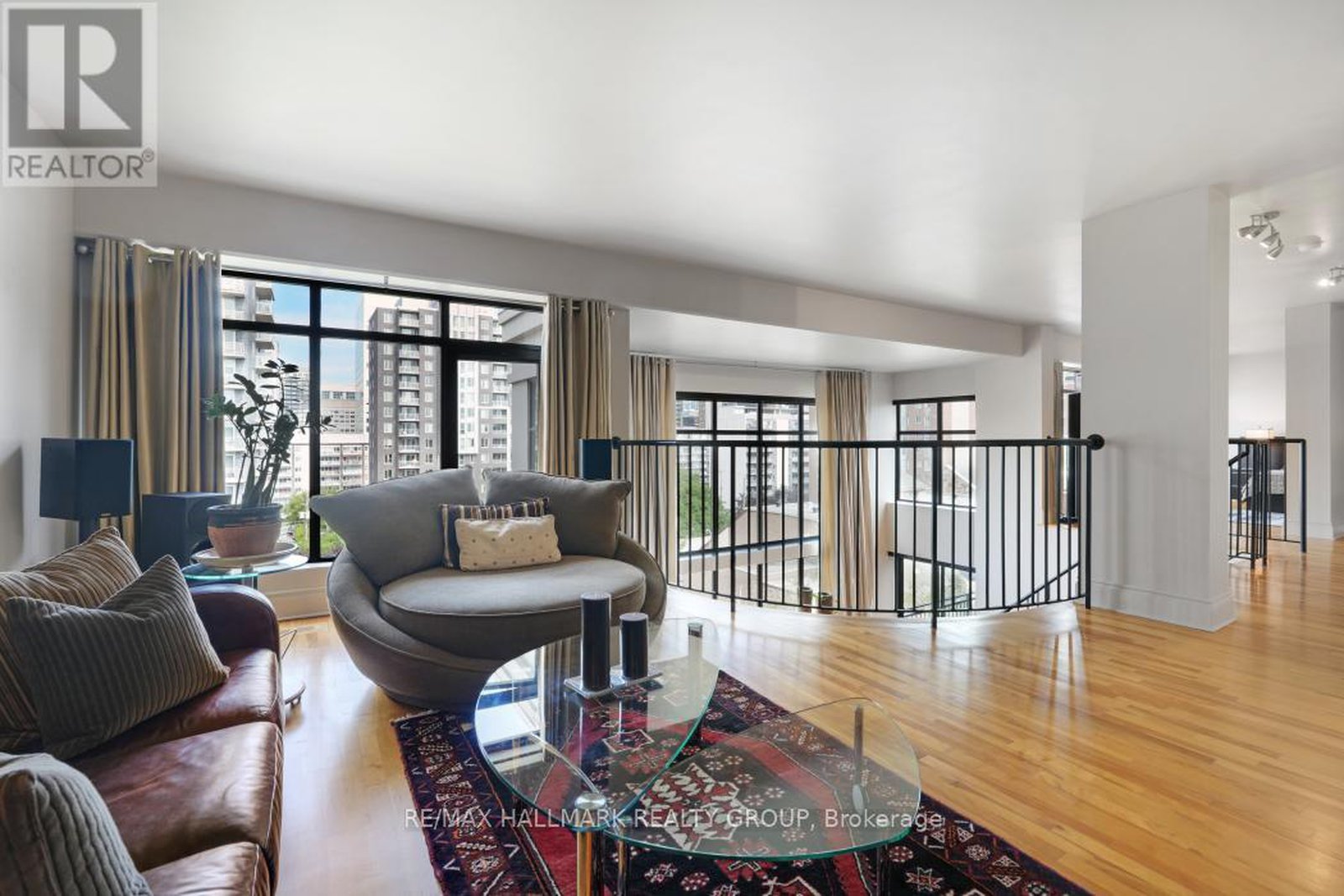 Stunning two storey penthouse apartment exemplifying modern luxury and sophisticated urban living. 1760 square feet of exceptional living space distinguished by a striking design with soaring ceilings and expansive two storey windows. Open concept living and dining rooms featuring a natural gas fireplace with custom built surround and access to a private terrace framed by open views and designed to elevate both everyday living and entertaining. Beautifully updated chefs kitchen with custom cabinets, granite countertops, sleek stainless steel backsplash and large breakfast bar. Conveniently situated main floor bedroom with direct access to a private terrace for a secluded outdoor retreat. The second floor features a spacious primary bedroom suite and an amazing loft inspired entertainment room highlighted with wall to wall windows and picturesque cityscape views. This fabulous penthouse offers an ideal blend of style, comfort and functionality making it a truly remarkable place to call home. Enjoy the best of downtown living within walking distance to Parliament Hill, the Rideau Centre, Rideau Canal, National Arts Centre and an array of restaurants, cafés, boutiques, and everyday conveniences.