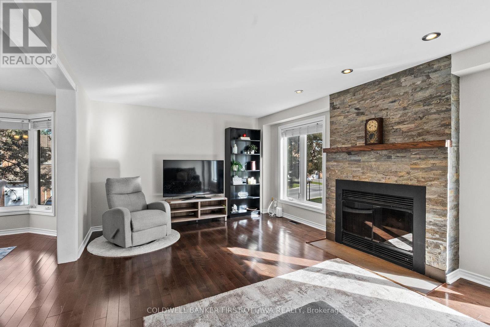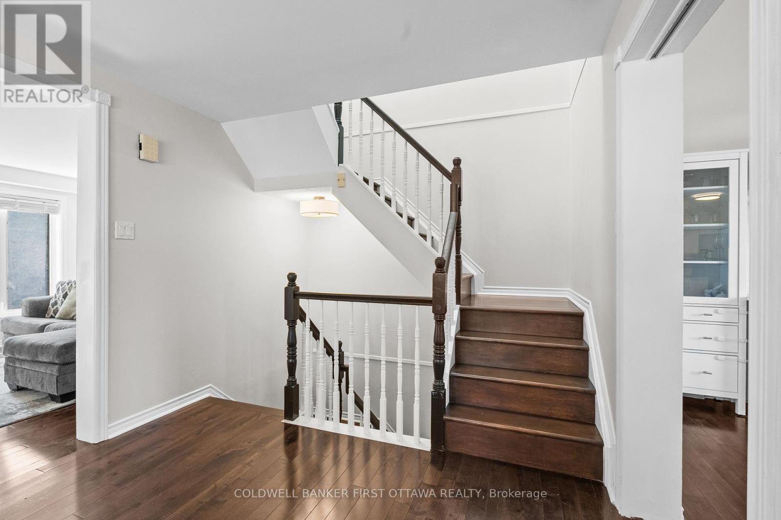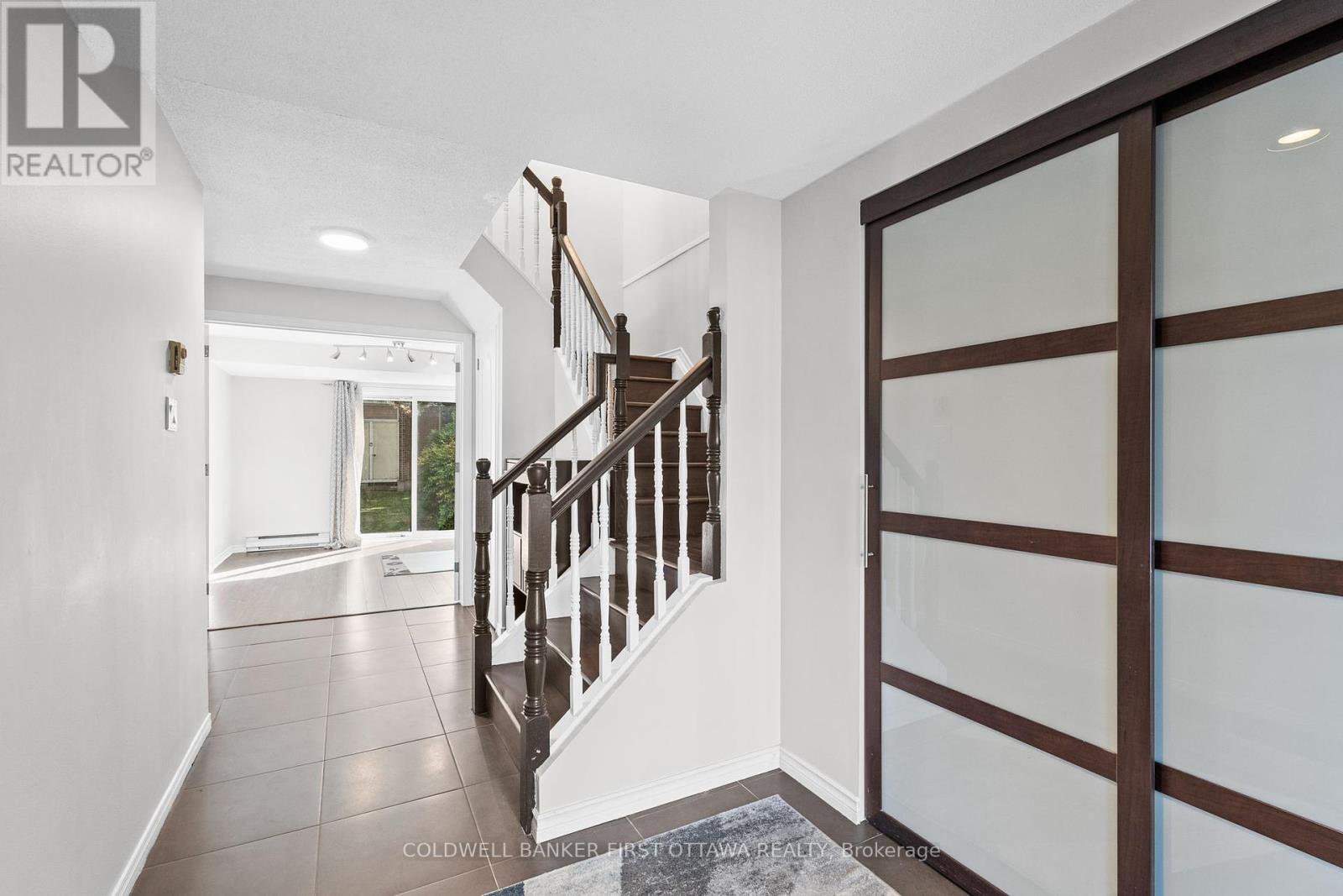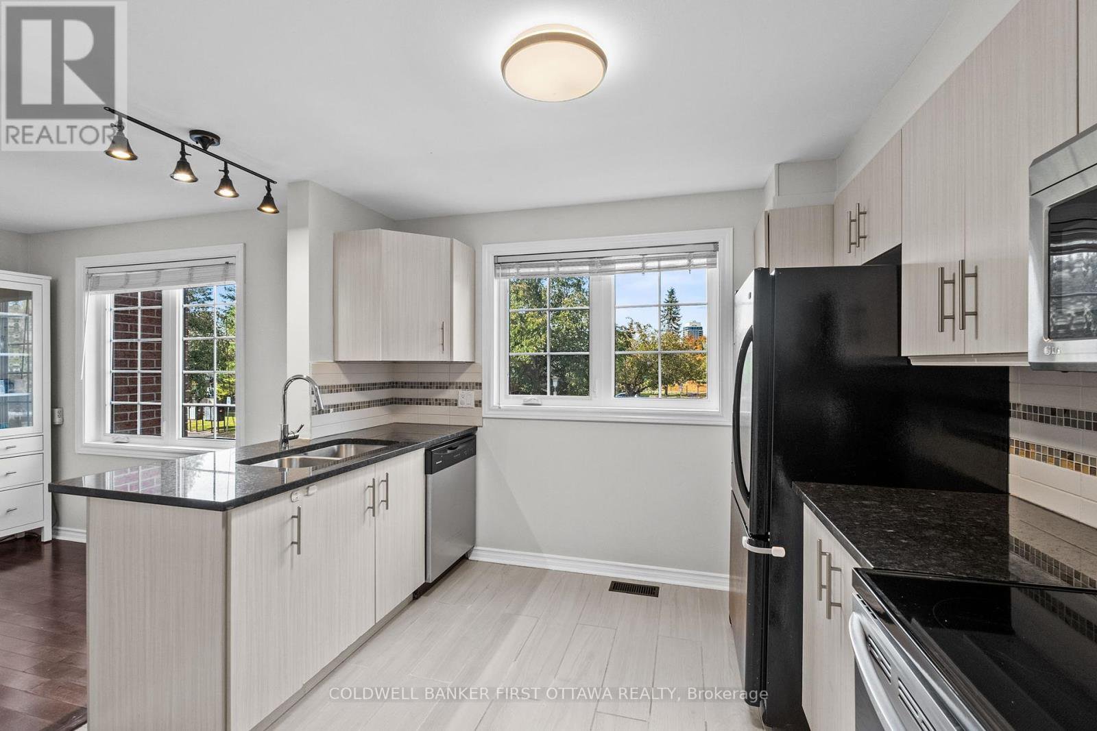 Welcome to this bright and beautifully maintained 3-bed, 3-bath condo townhouse located in the very central and always popular Centrepointe area! Tucked in on a quiet crescent, this END UNIT offers the perfect blend of comfort, convenience, and value, and is located close to Algonquin College, all the amenities of College Square, transit, and parks - including one just steps from the front door! The ground level has a big tiled foyer with an equally large closet, inside access to the garage, a convenient powder room and a den with french doors which works perfectly as a home office. You'll also find the furnace room with ample storage space and access to the tree covered yard space, perfect for entertaining and enjoying the seasons as they change. The hardwood stairs lead to the second level with a great open-concept living and dining area, also with hardwood floors, and filled with natural light from the big bay window. The updated eat-in kitchen features granite counters, SS appliances, convenient laundry closet, and a cozy breakfast nook with added storage. Upstairs, you'll find three spacious bedrooms (also with hwd floors - NO carpet anywhere here!), including a primary with a walk-in closet and 3pc ensuite with glass shower, and an updated full main bath. Not only will you enjoy the space and finishes offered inside, you'll love the location with everything you need just minutes away from your front step!
