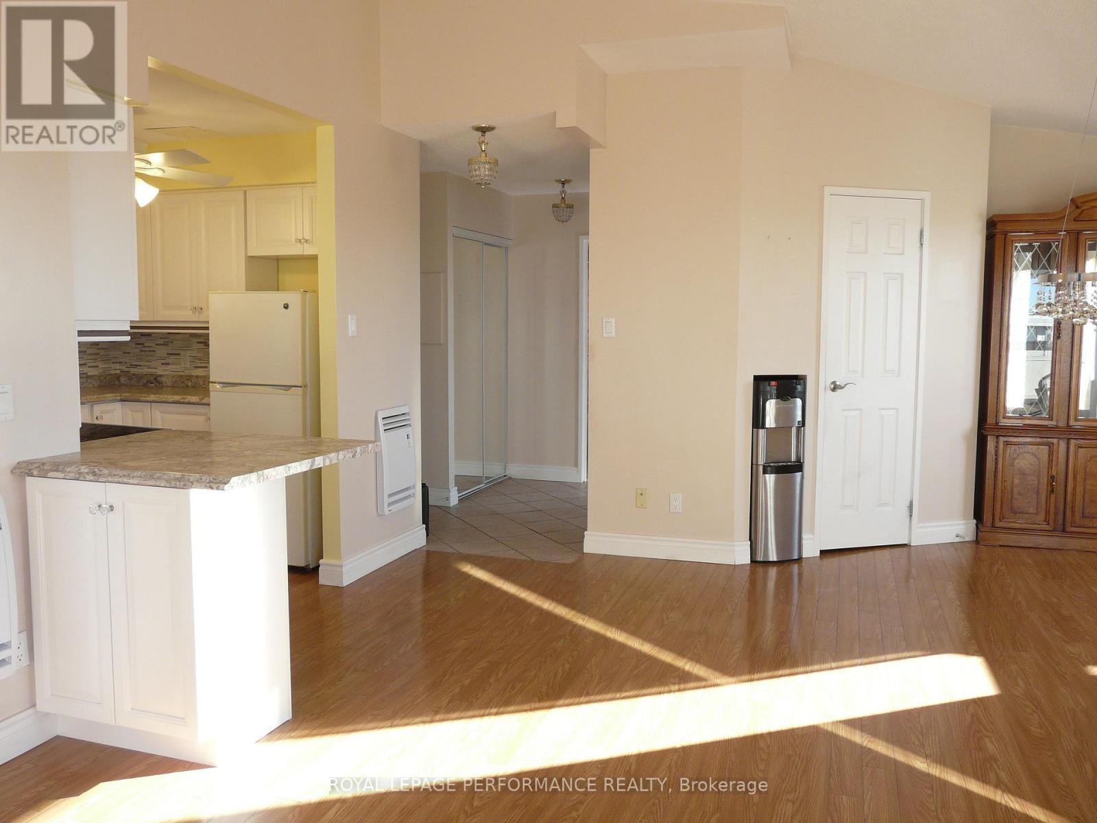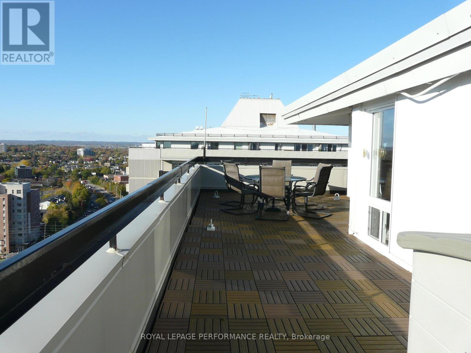 Rarely offered Penthouse in best location with unobstructed stunning views from south west to north west of the city. Beautiful 2 bedroom penthouse featuring vaulted ceilings in living room and bedrooms. All windows and patio door have been upgraded to high quality windows flooding the unit with natural light. this unit has a spacious 3 piece ensuite with walk in shower and the main bathroom has 4 piece upgraded two years ago. Upgraded galley kitchen with accent LED lighting under cabinetry. Laminate and ceramic floors throughout. Small storage area in the unit and also an external locker one level up from the unit . Includes fridge, stove, water cooler, all existing window coverings and 2 ceiling fans. There is an assigned parking spot to be determined by the Corporation at the time of the sale. Well managed corporation with Apollo Management on site office. Located within walking distance to 2 grocery stores, Rideau river, bicycle paths. Amenities include indoor pool, sauna, exercise room, wood working shop, bicycle storage, car charging stations, car wash bay and much more. Dont miss this opportunity to own a million dollar view of our city on a 500 square feet rooftop terrace.