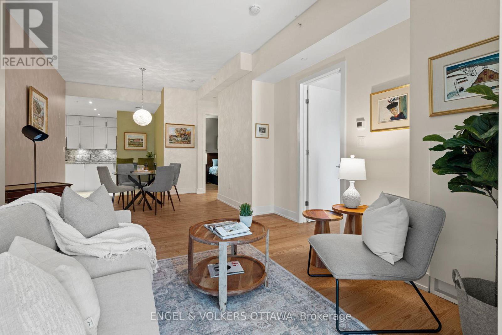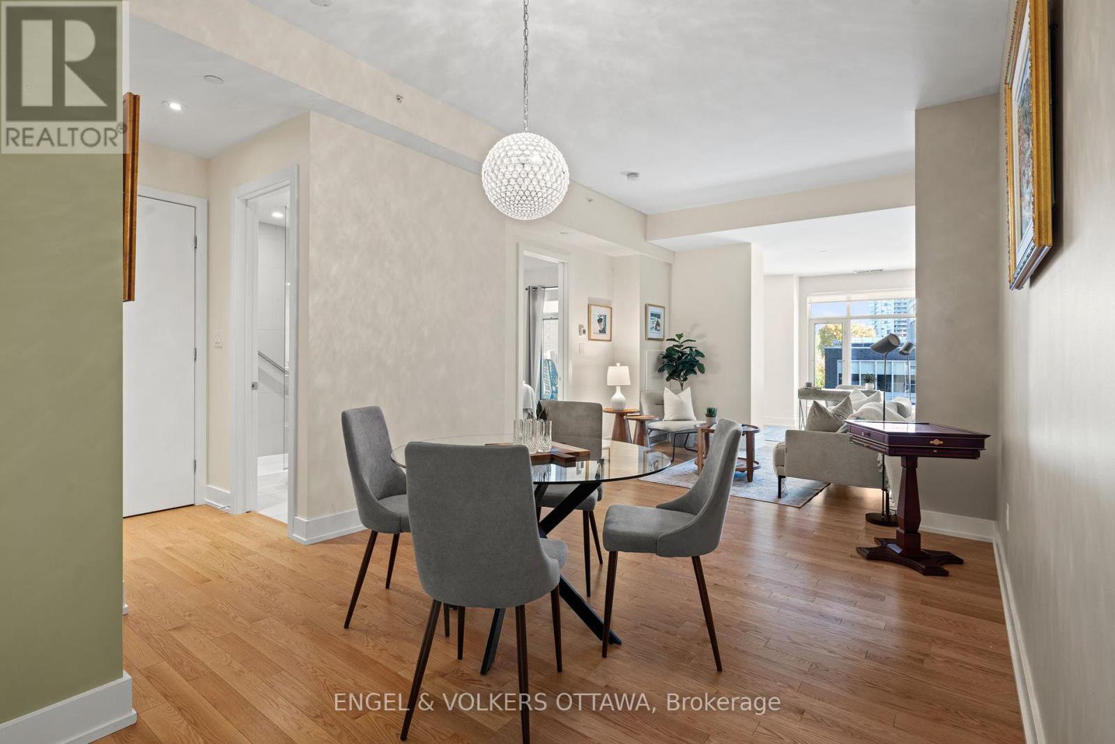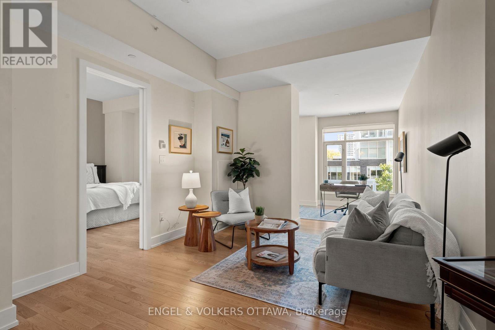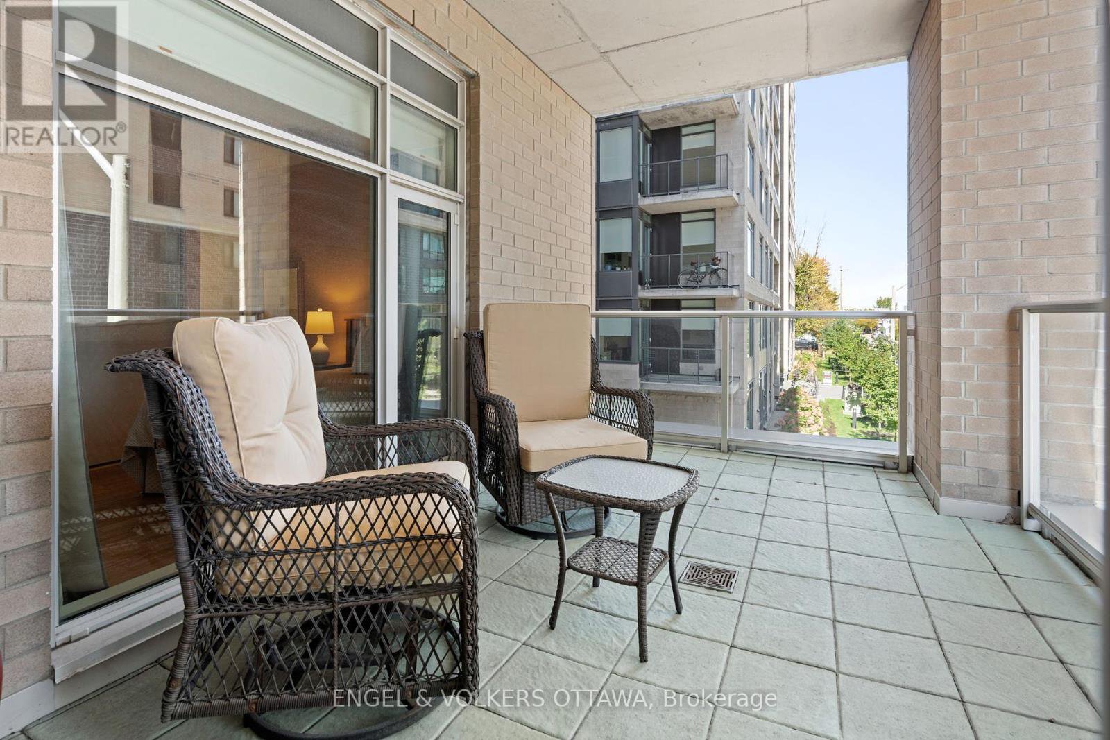 Experience upscale urban living in one of the largest suites in the building. This stunning 2-bedroom plus den, 2-bath residence combines generous proportions with 10-foot ceilings, two private balconies, and a coveted second-floor location offering convenient street access. Inside, the open-concept layout features a spacious kitchen with upgraded cabinetry, granite counters, stainless steel appliances, and a breakfast bar perfect for casual dining. The living and dining areas easily accommodate full-size furnishings, while the den offers an ideal home office or reading nook. Beautiful hardwood flooring flows throughout, complemented by upgraded tile in the foyer. The bedrooms are thoughtfully separated for privacy, and both bathrooms showcase classic contemporary finishes. Offering two balconies, the larger balcony featuring a gas line for BBQ. Located in one of Ottawa's most sought-after urban neighbourhoods, steps from Dows Lake and the Rideau Canal, residents enjoy easy access to scenic walking and cycling paths, paddle and skate rentals, and year-round recreation. The Civic Hospital and Carleton University are minutes away, making this an ideal location for professionals, medical staff, or academics seeking convenience without compromise. Stroll to Preston Street, the heart of Little Italy, and experience some of Ottawa's best restaurants, cafés, and boutiques. The O-Train station nearby ensures quick access to downtown, Lansdowne, and beyond, while nearby green spaces and the Experimental Farm provide a serene contrast to urban life. A rare opportunity to enjoy refined condo living with exceptional walkability and modern convenience.
