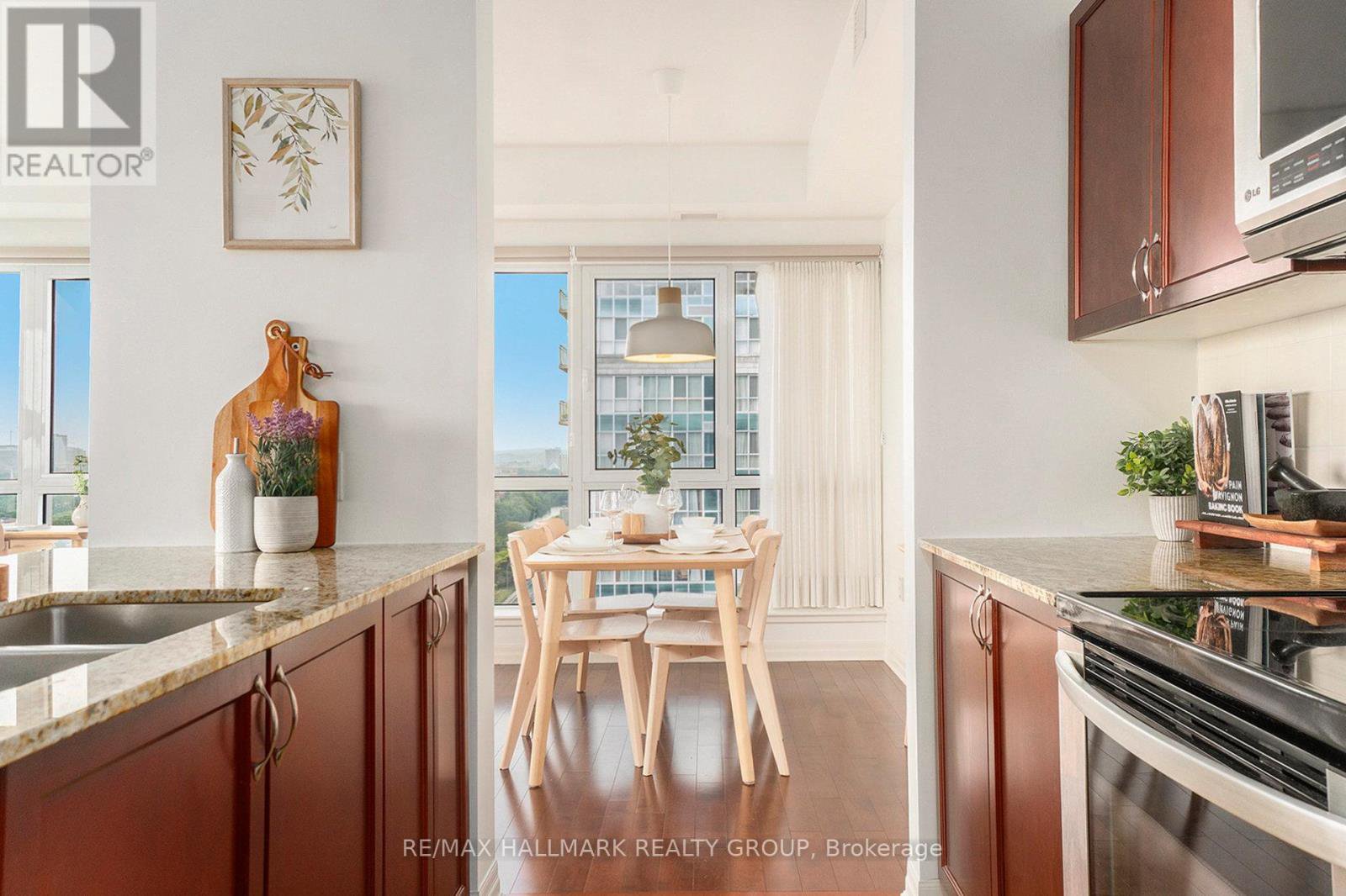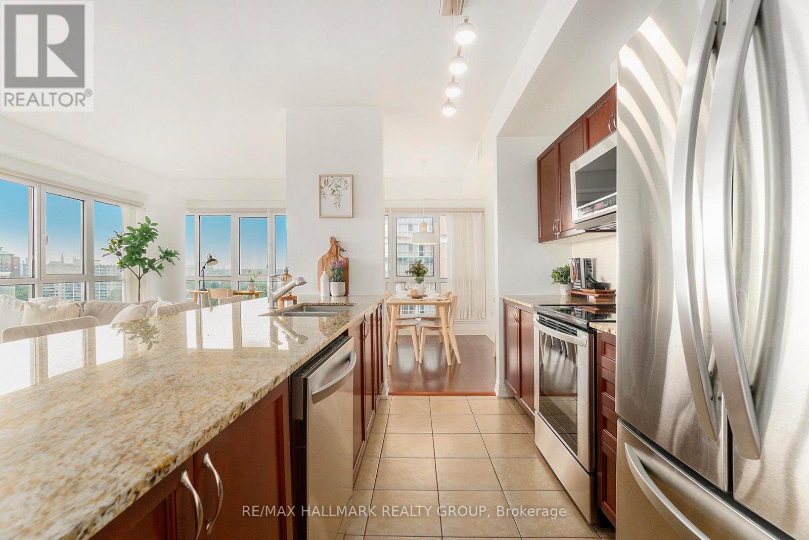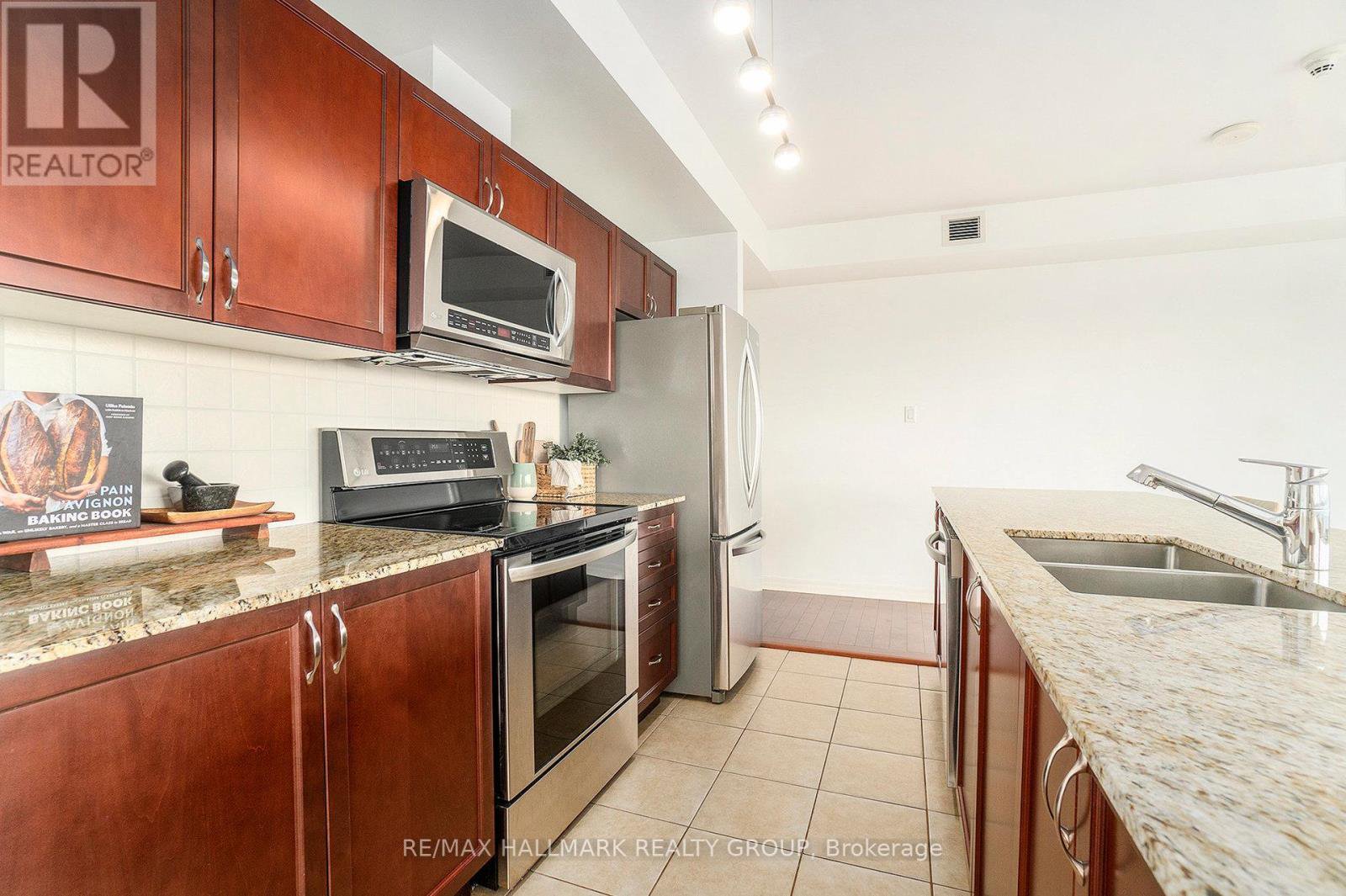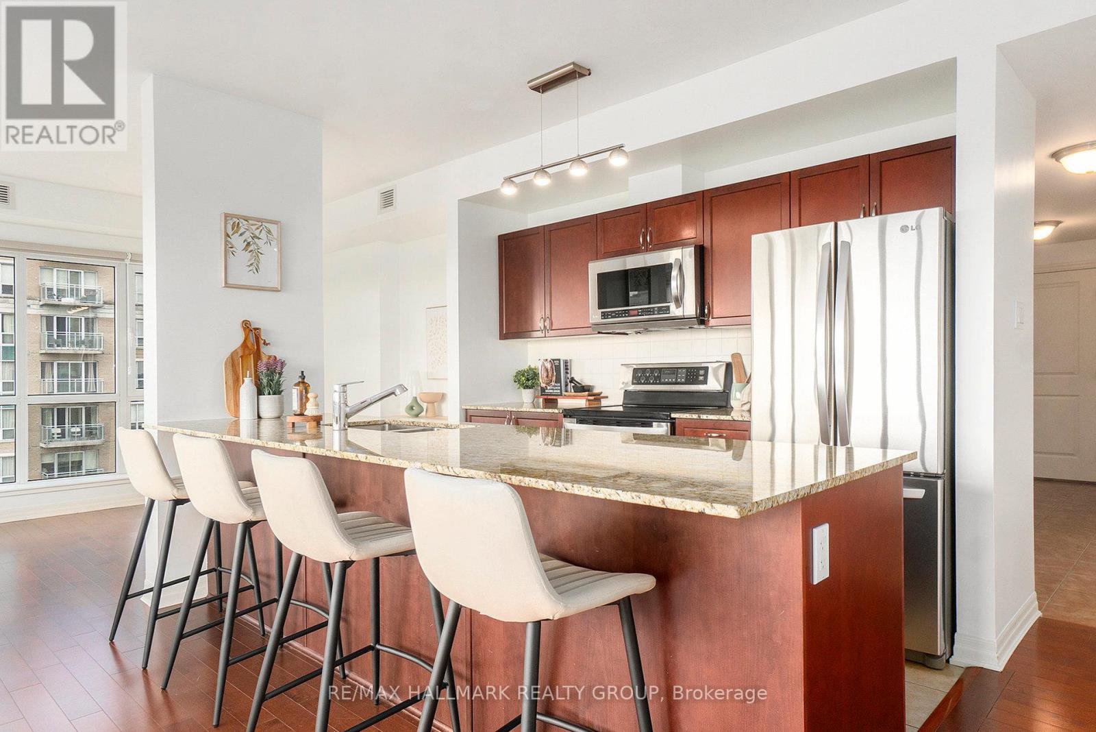 OPEN HOUSE - SUNDAY, OCTOBER 19th, 2 to 4pm. Welcome to 1602-90 Landry Street - a bright and spacious corner-unit condo boasting panoramic views of the Rideau River and downtown Ottawa. This 2-bedroom, 2-bathroom suite offers 1,185 sq ft (per MPAC) of thoughtfully designed living space with hardwood and tile flooring throughout. The open-concept kitchen features granite countertops, stainless steel appliances, and a peninsula perfect for casual dining or entertaining. Floor-to-ceiling windows flood the living/dining area with natural light, while the large balcony invites you to enjoy stunning city and river views. The primary bedroom includes a walk-in closet and a private ensuite, while the second bedroom is served by a full bathroom. Added conveniences include in-unit laundry, underground parking with a Level 2 EV charger, and a storage locker. Enjoy access to premium amenities including an indoor pool, fitness center, and recreation room. Ideally located in a walkable, amenity-rich neighborhood - just 400m to Metro, with Beechwood/MacKay and Vanier/Meilleur bus stops nearby. Kingsview Park and Ashbury College (1 km) add to the appeal of this exceptional location. Experience a perfect blend of comfort, lifestyle, and convenience in this sought-after Ottawa community. A rare opportunity not to be missed.