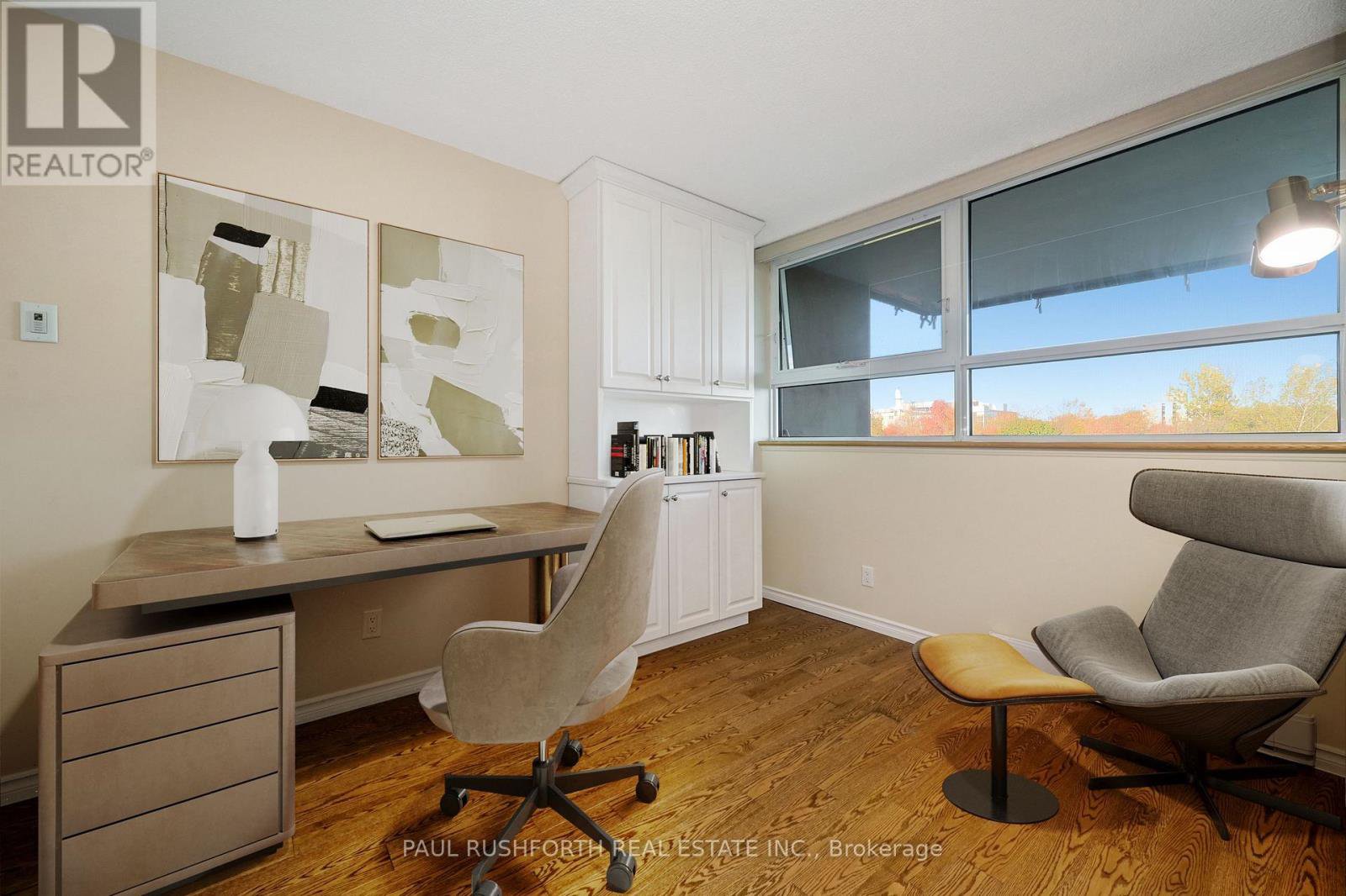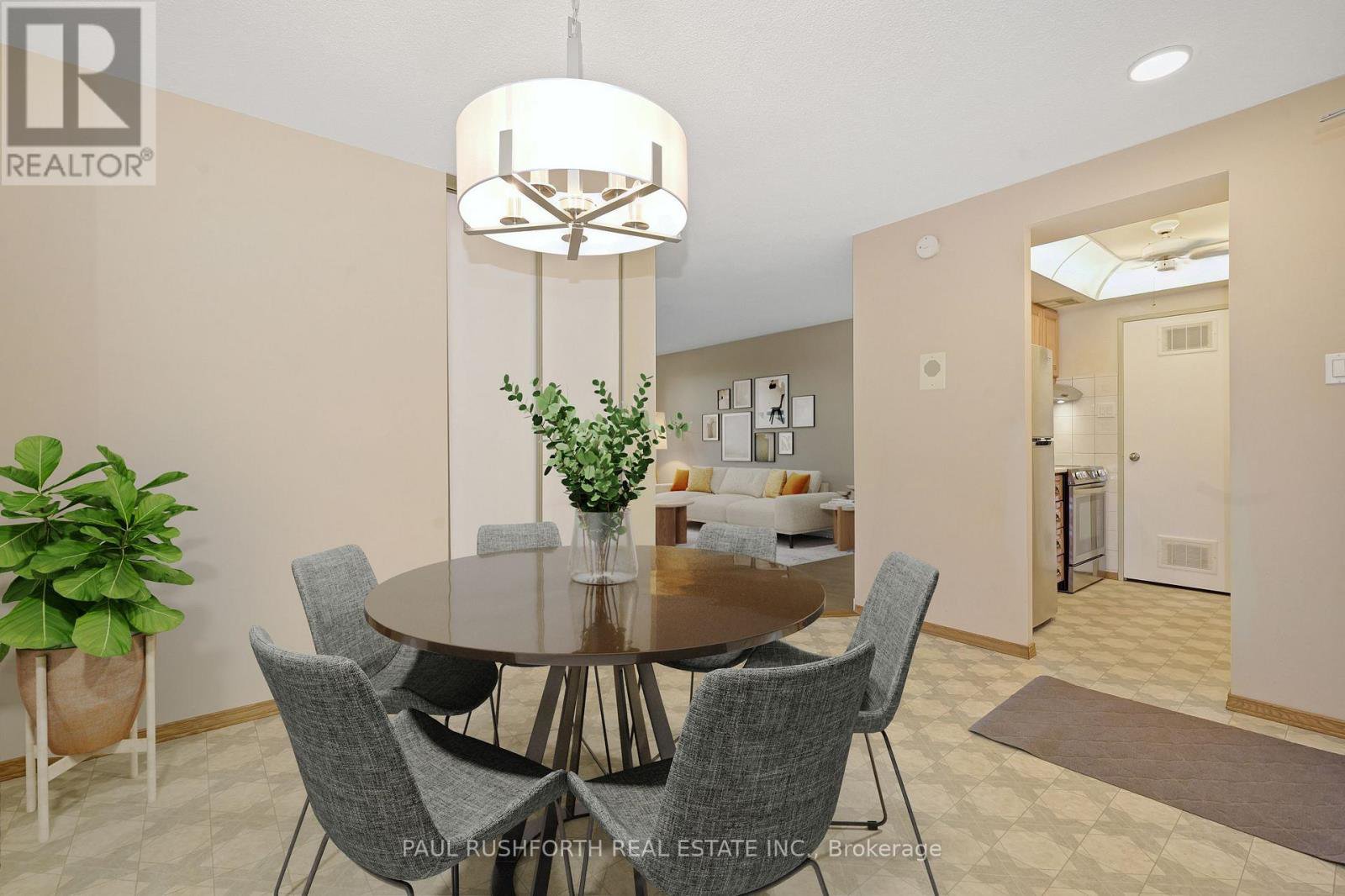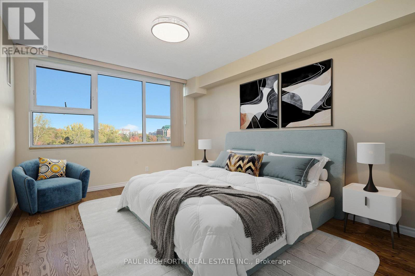 Welcome to this inviting two-bedroom, 1.5 bathroom condo offering comfort, functionality, and value in a well managed community. The layout is both bright and practical, featuring a generous living room with access to a private balcony, a separate dining area, and a galley style kitchen complete with a walk-in pantry. The second bedroom, currently used as a den or office, provides flexibility for your lifestyle. The spacious primary bedroom includes a walk in closet and a convenient two piece ensuite, complemented by a full main bathroom. Recent updates enhance both comfort and style, including new engineered oak hardwood flooring (Dec 2024), stainless steel fridge and range (Apr 2024), and an upgraded electrical breaker panel (Sep 2020). The unit is equipped with an HVAC system offering efficient heating and central air conditioning. Residents enjoy excellent amenities, including an outdoor pool, indoor sauna, gym, party room, library, modern laundry facilities, indoor garage parking, and ample visitor parking. This well cared for building offers the ideal balance of convenience, comfort, and community living. Condo fee includes all utilities. Some photos have been virtually staged