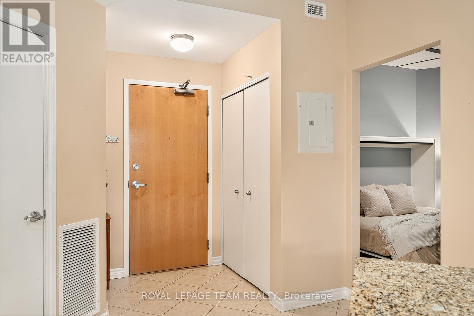 The ideal location: blissful Lowertown energy, near the ByWard Market and Rideau River trails. Sussex Square blends downtown energy with quiet elegance. This two-bedroom plus den condo overlooks a landscaped courtyard with a central fountain, creating a private, European-style retreat. A tiled foyer leads to a versatile den and an open living/dining space with warm hardwood floors. The granite kitchen offers a large L-shaped island, roll-out cabinetry, and a new induction range. Sunlight pours into the dining nook and onto one of the buildings largest private terraces perfect for al-fresco meals or container gardening. The primary suite features an immense walk-in closet and a spa-inspired ensuite with slate-tiled accessible shower, while the immense second bedroom sits beside a full bath. In-unit laundry adds convenience. Residents enjoy a fully equipped gym, spacious party room, a common rooftop patio with BBQ area with stunning panoramic views of the city and Gatineau. Includes a storage locker, and secure underground parking. Truly, urban living with comfort and style.