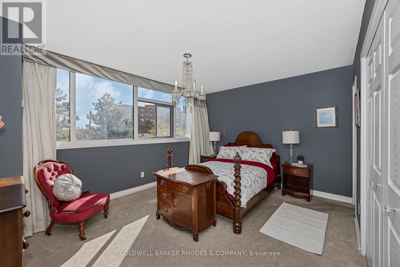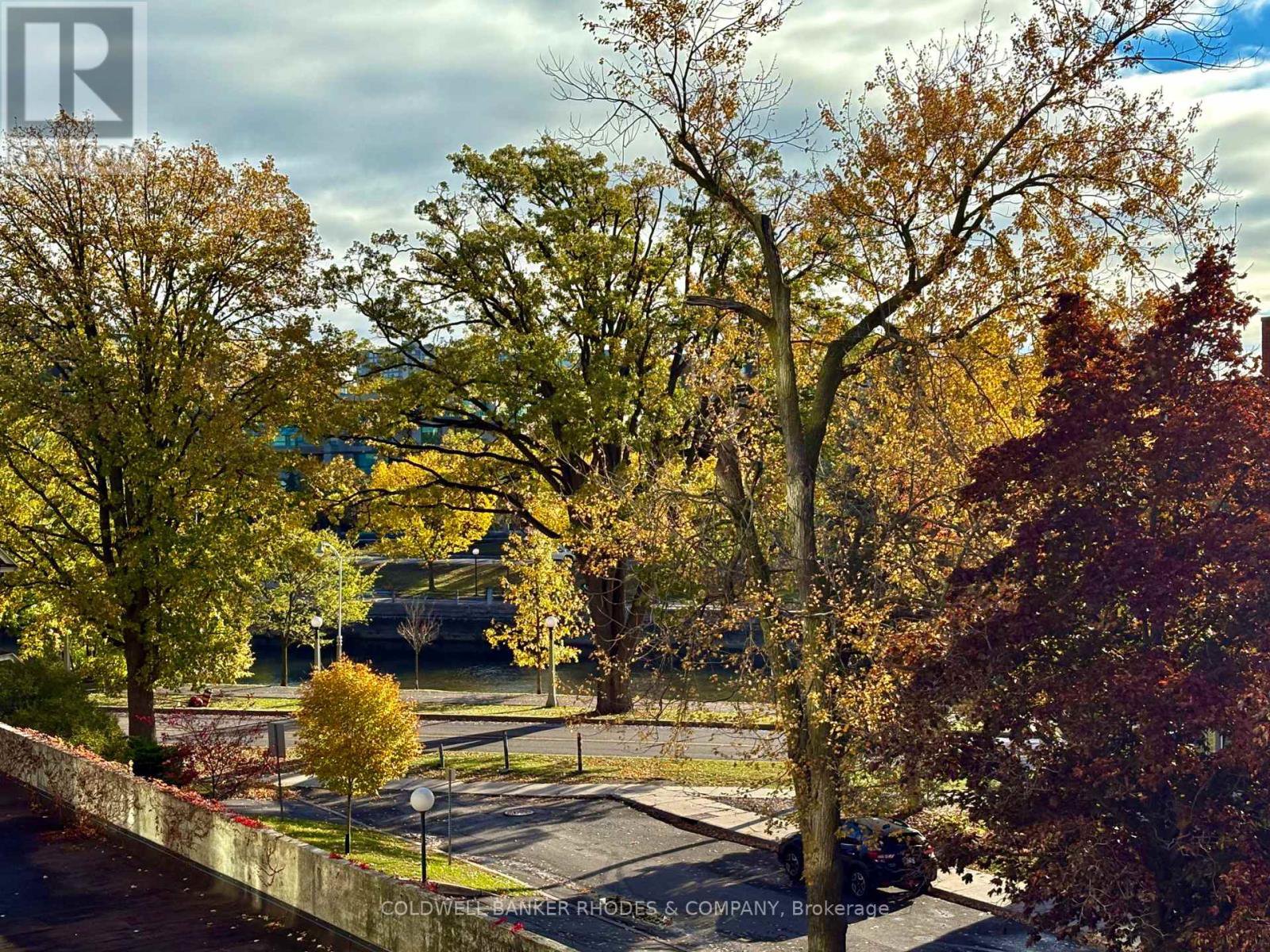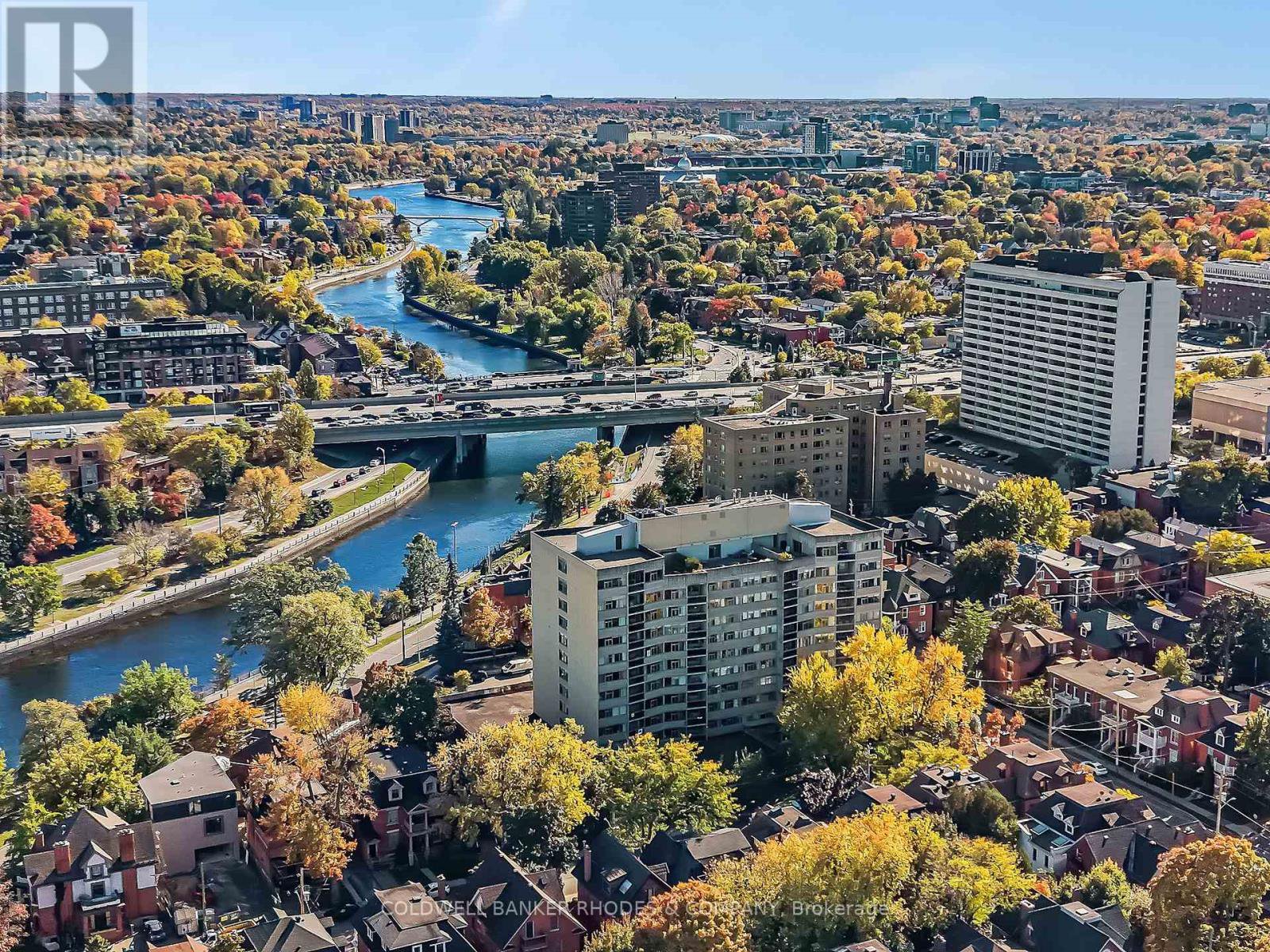 Welcome to Chateau Cartier - easy living in an established community just steps from the Canal! This beautifully updated, light-filled 2 bedroom, 2 full bathroom corner unit is perfectly positioned on the sunny south side of the building. Warm hardwood floors, elegant finishes, and expansive windows create an inviting atmosphere you'll love coming home to. The open-concept living and dining area offers generous space for entertaining family or enjoying peaceful afternoons surrounded by treetop views. The renovated kitchen features thoughtful touches including granite countertops, a double sink, a handy pantry, and plenty of storage. With a west-facing window, the spacious eating area or den space is appointed with a built-in desk and cabinetry, offering is an ideal space for hobbies, computer work or enjoying a cup of coffee. The roomy primary bedroom is adjacent to an 3-piece ensuite with walk-in shower as well as a double closet. A comfortable second bedroom and nicely updated main 4-piece bath are perfect for visiting family or guests. Additional conveniences include in-unit laundry and storage space, underground parking, and a private balcony where you can relax and take in views of the Canal. Enjoy resort-style amenities such as the outdoor pool, rooftop terrace, and community room with library. Located within an easy stroll of Elgin Street's charming restaurants, cafés, and shops, as well as nearby grocery stores, recreation facilities, and downtown amenities, you'll find everything you need close at hand. Enjoy the perfect blend of comfort, convenience, and picturesque Canal-side living!