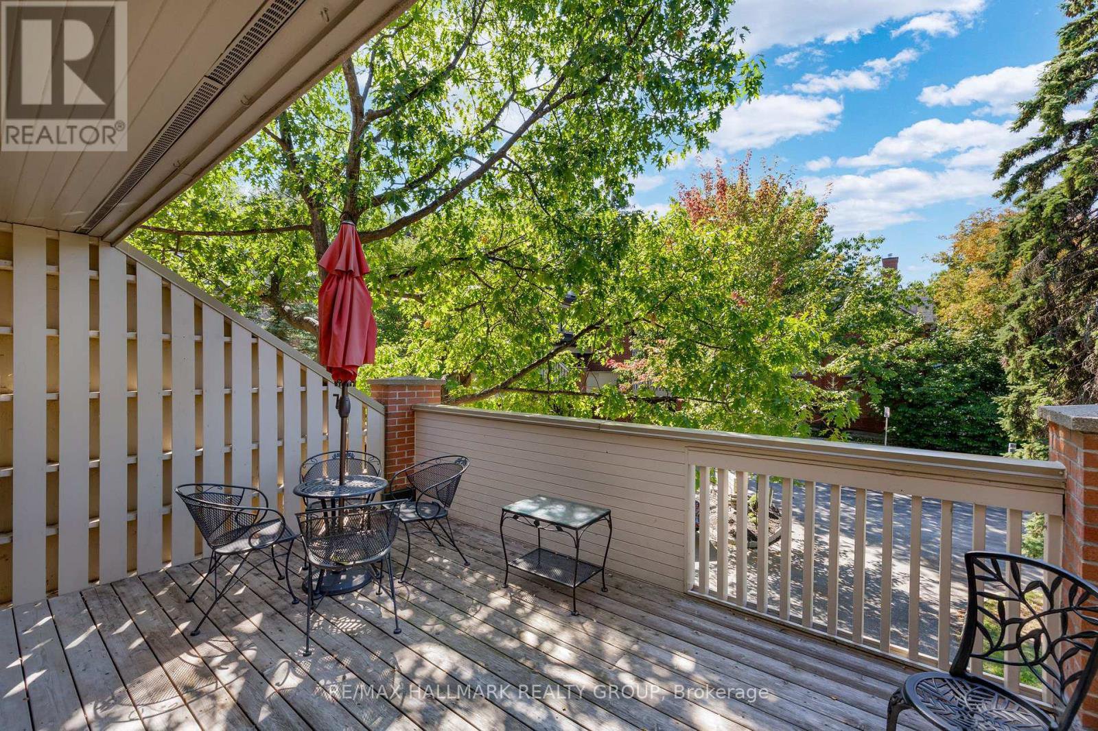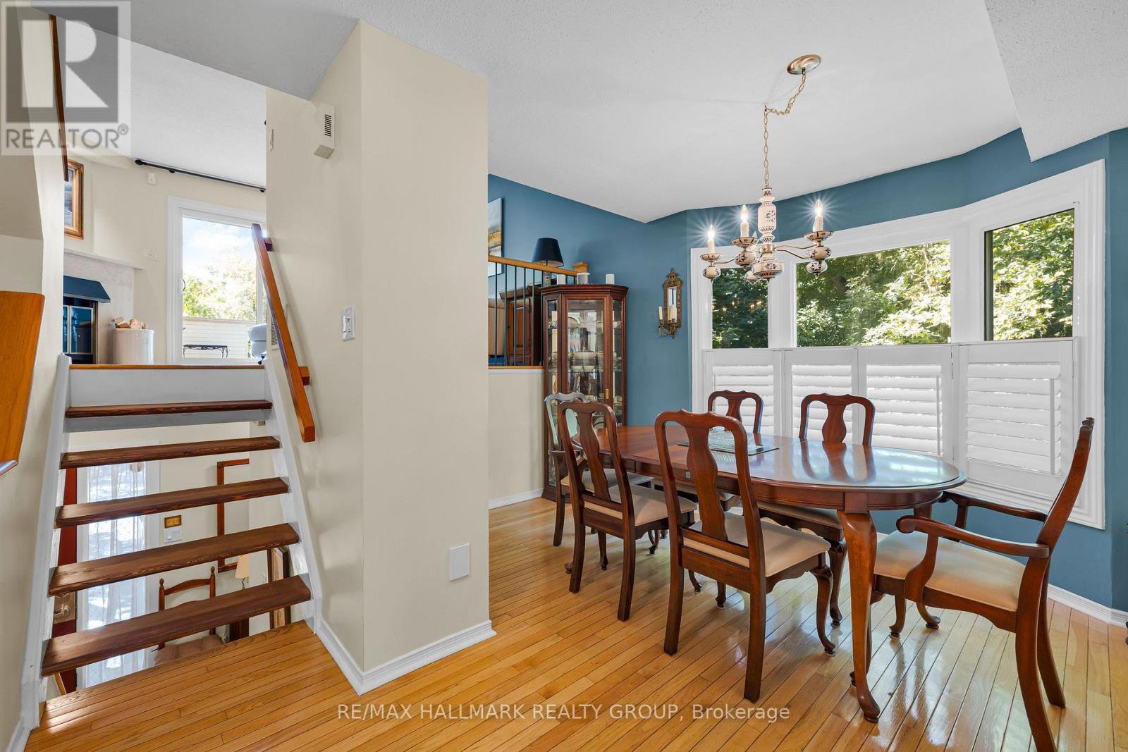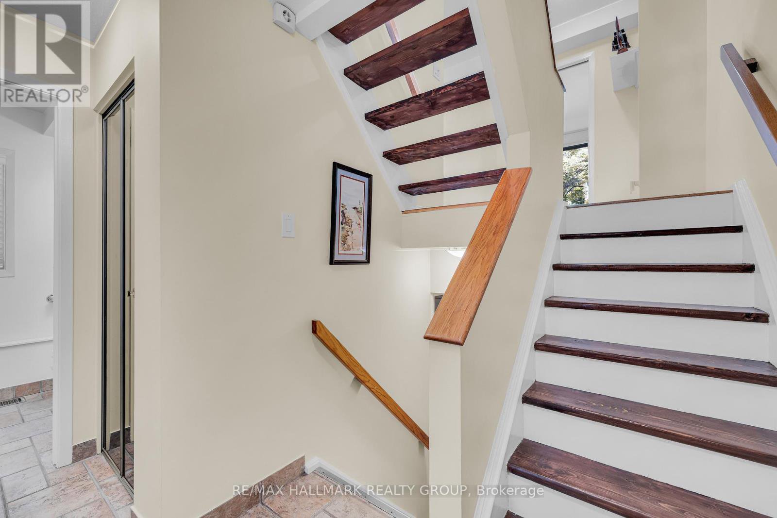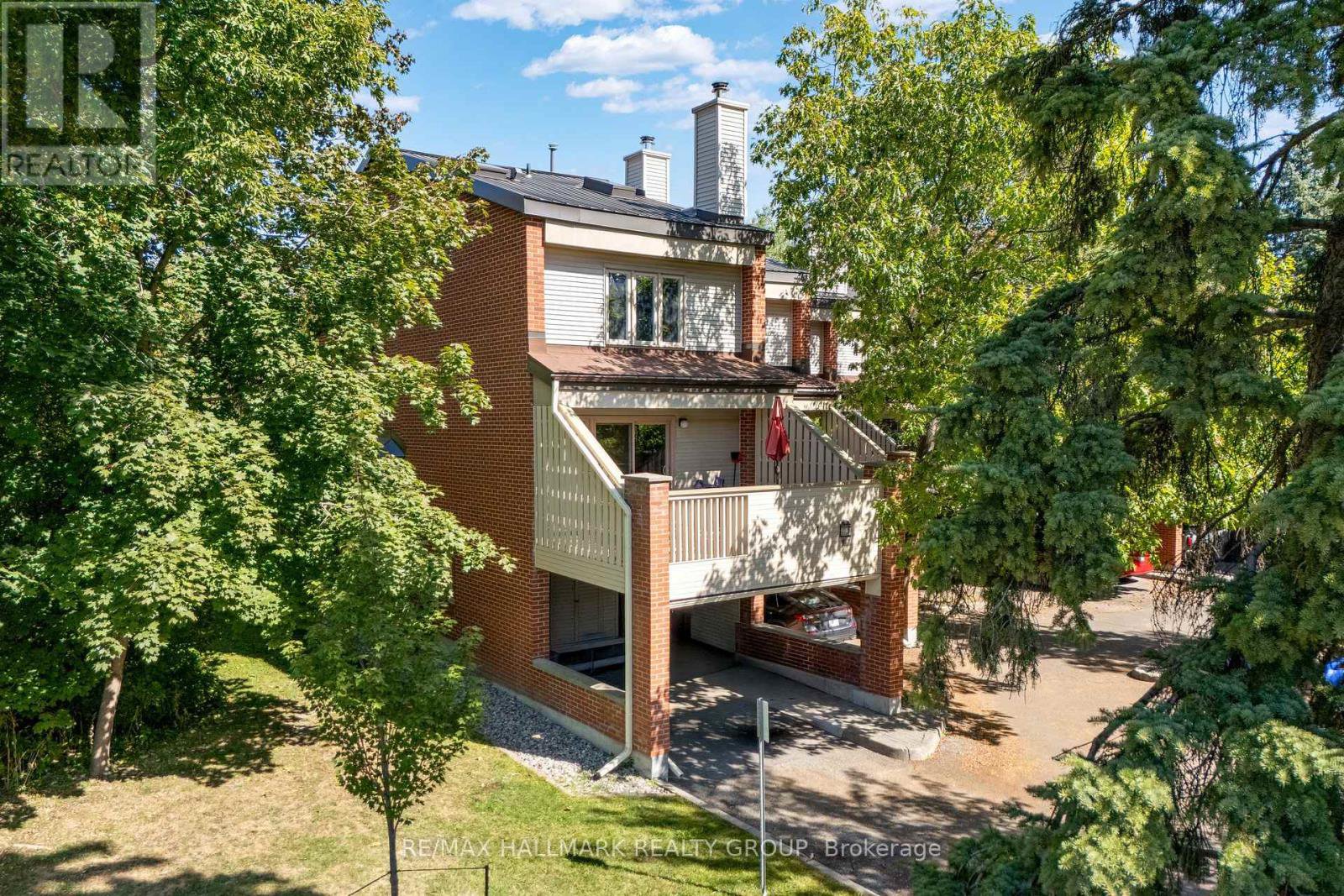 Welcome to 1-60 Greenfield -- Steps from the Rideau Canal and minutes to downtown, this 3-bed, 3-bath multi-level end-unit townhome blends city convenience with rare privacy, all while backing onto trees with no rear neighbours. Inside, the bright U-shaped kitchen boasts newer appliances (2022-2025), stone countertops and backsplash, an induction stove, a corner sink, and a large window overlooking the yard and trees. Natural hardwood runs through the dining and upper levels, complemented by shutters in the dining room. The living room features a fireplace and patio doors to a spacious terrace above the carport - perfect for hosting all season long. The private levels provide flexibility: a primary with an ensuite (corner shower), a skylit 4-piece bath with a jacuzzi tub and updated tile tub surround beside the second bedroom, and a third bedroom at the top, currently used as an additional lounge. The lower level expands the home with a full laundry room, walk-in workshop, storage, and a bonus room ideal as a gym, office, family room, or guest suite. Major systems are updated with a furnace & AC (2018). All this is just a stone's throw to the Canal, with quick in-and-out city access, and surrounded by shopping, dining, and recreation, a rare balance of downtown living and peaceful retreat.