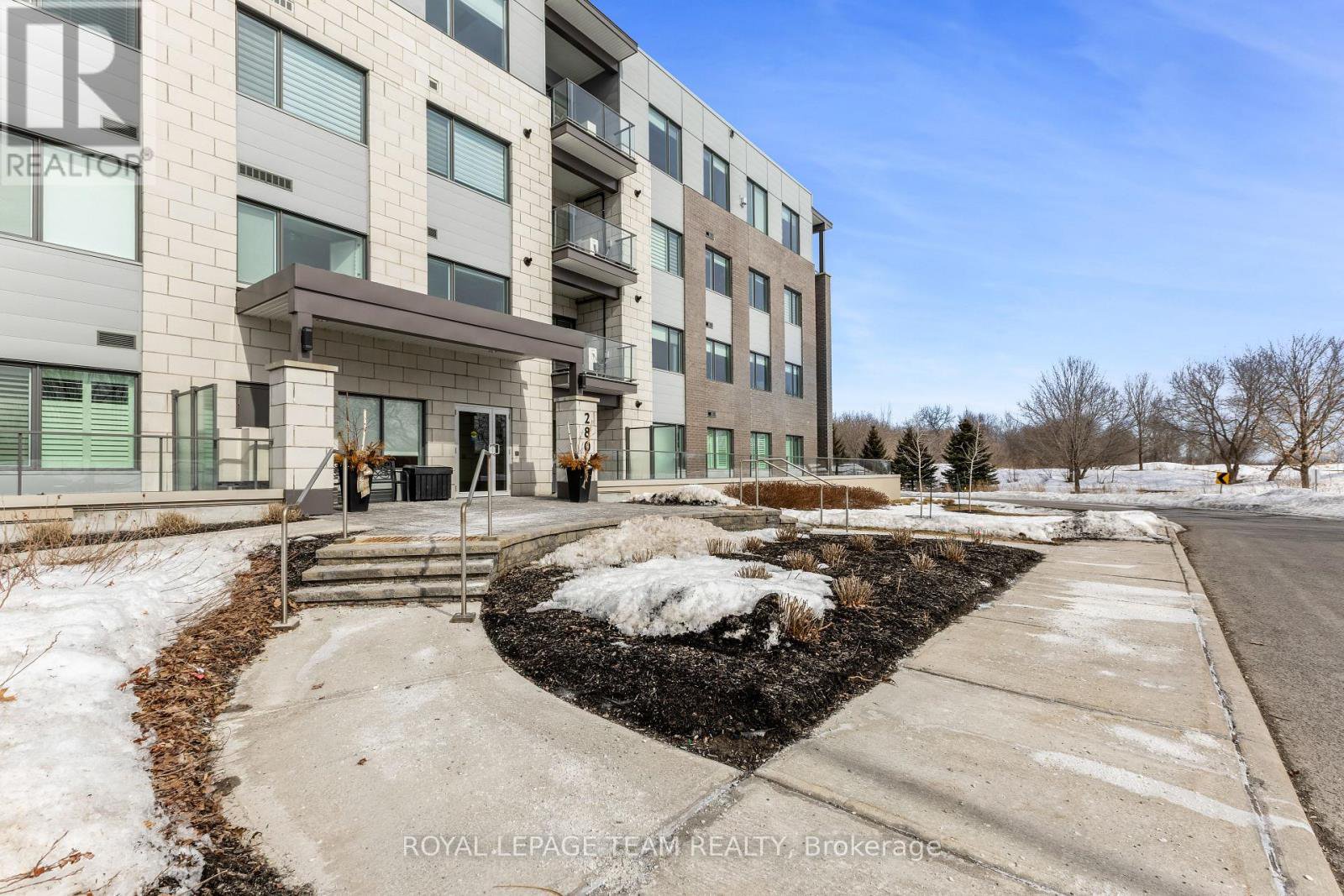 Boutique Living with Breathtaking Views! Welcome to Serenity in Kanata North, where luxury & lifestyle meet convenience & affordability. This 1-bedroom + den ground-floor condo offers a rare opportunity to live in an oasis of natural beauty while being steps from the heart of Canadas tech hub. Ideal for investors, single professionals or those seeking a low maintenance sophisticated space. Ditch the commute & embrace a lifestyle where everything is within reachwalk to work at the worlds leading tech companies or enjoy a round at The Marshes Golf Club. With easy access to public transit, Tanger Outlets & Kanata Centrum's dining & entertainment, youre perfectly positioned to live, work & playall without needing a vehicle! Inside, discover 5" luxury hardwood floors, quartz countertops, 9' smooth ceilings & in-suite laundry! Step outside to your spacious private patio, perfect for alfresco dining & lounging. Indulge in luxury amenities: sprawling rooftop patio w/ breathtaking golf course & lake views w/ the Gatineau Hills beyond, a fitness room & indoor bike storage. Explore bicycle pathways & winding hiking trails through NCC-protected forests, offering a perfect escape into nature right at your doorstep. Bonus: Comes w/ a storage locker, & water/sewer included in condo fee. Your serene escape awaits!