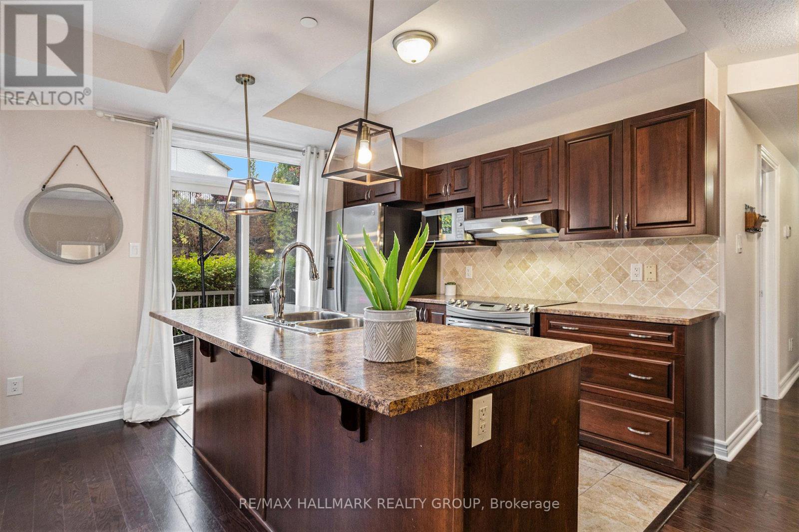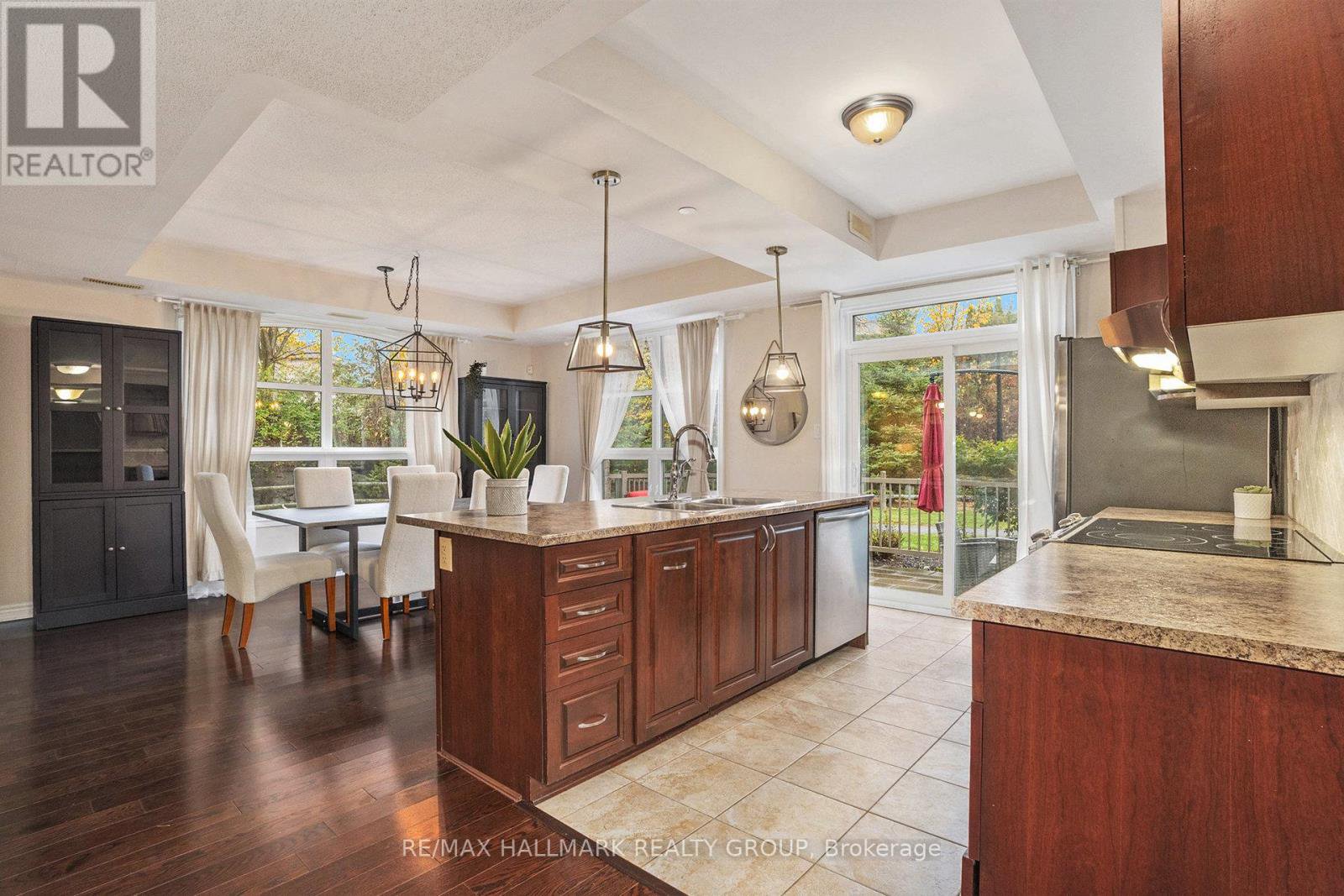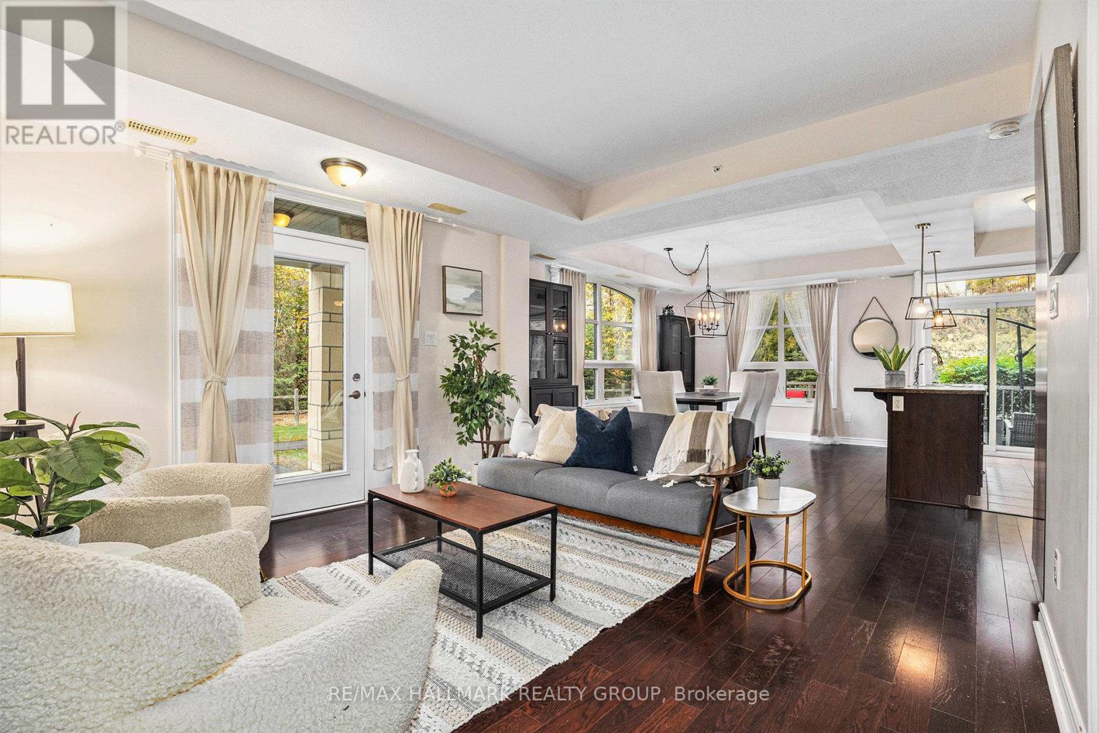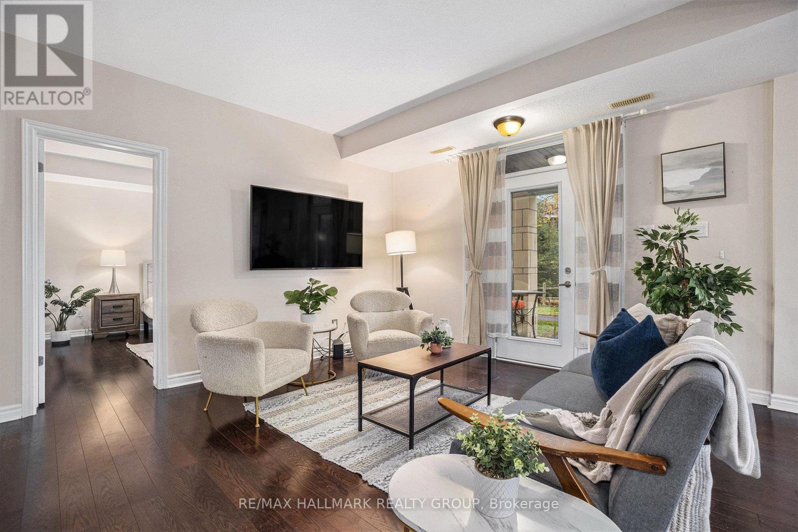 Stunning 2 bedroom plus den, ground level unit corner unit in the exclusive adult oriented community of Quarry Ridge in Orleans. These units are rarely offered and when they are, they go quick! Looking to downsize or simply get all your living onto one level, this is sure to impress as this unit offers approx.1326sqft of living space with 2 spacious patios surrounded by beautiful landscaping. The interior space is thoughtfully laid out with a great open concept kitchen, living and dining area with lots of natural light sitting in the heart of the home. While 2 spacious bedrooms are at separate ends of the unit. There is also a den that can be utilized as a 3rd bedroom/home office/guest room. The primary room can fit even the largest of bedroom sets and has vaulted ceilings, a walk-in closet, another closet, and an ensuite bathroom with spacious walk-in shower. The secondary bedroom is also a great size and has a full bathroom located just across the hall from it. Dining area is large enough to accommodate a large dining table. The chefs kitchen has a large island and loads of cabinet and counter space. The main patio is a great size which can fit a BBQ area, outdoor living space and dining area. Inside access to your own garage and storage locker, with a secondary parking space right there as well. If you're looking for convenience, space, low maintenance, and a scenic, quiet location to call home, look no further. Probate conditions apply, 24 hours irrevocable on all offers, schedule B to accompany all offers.