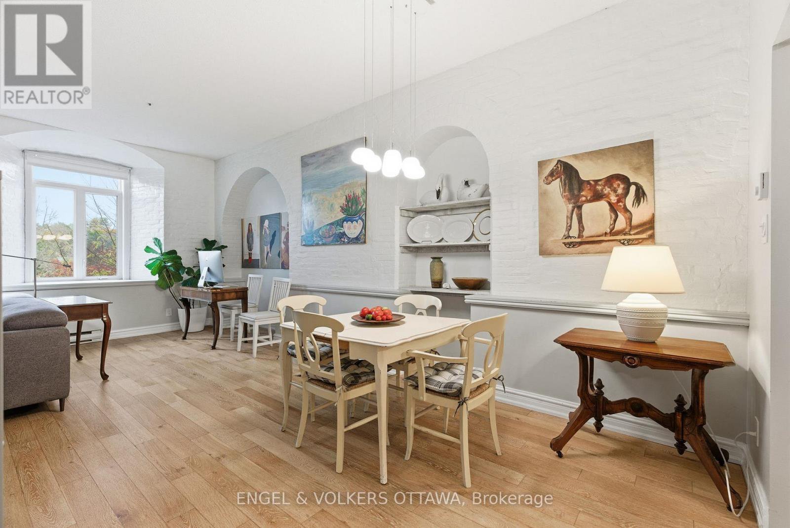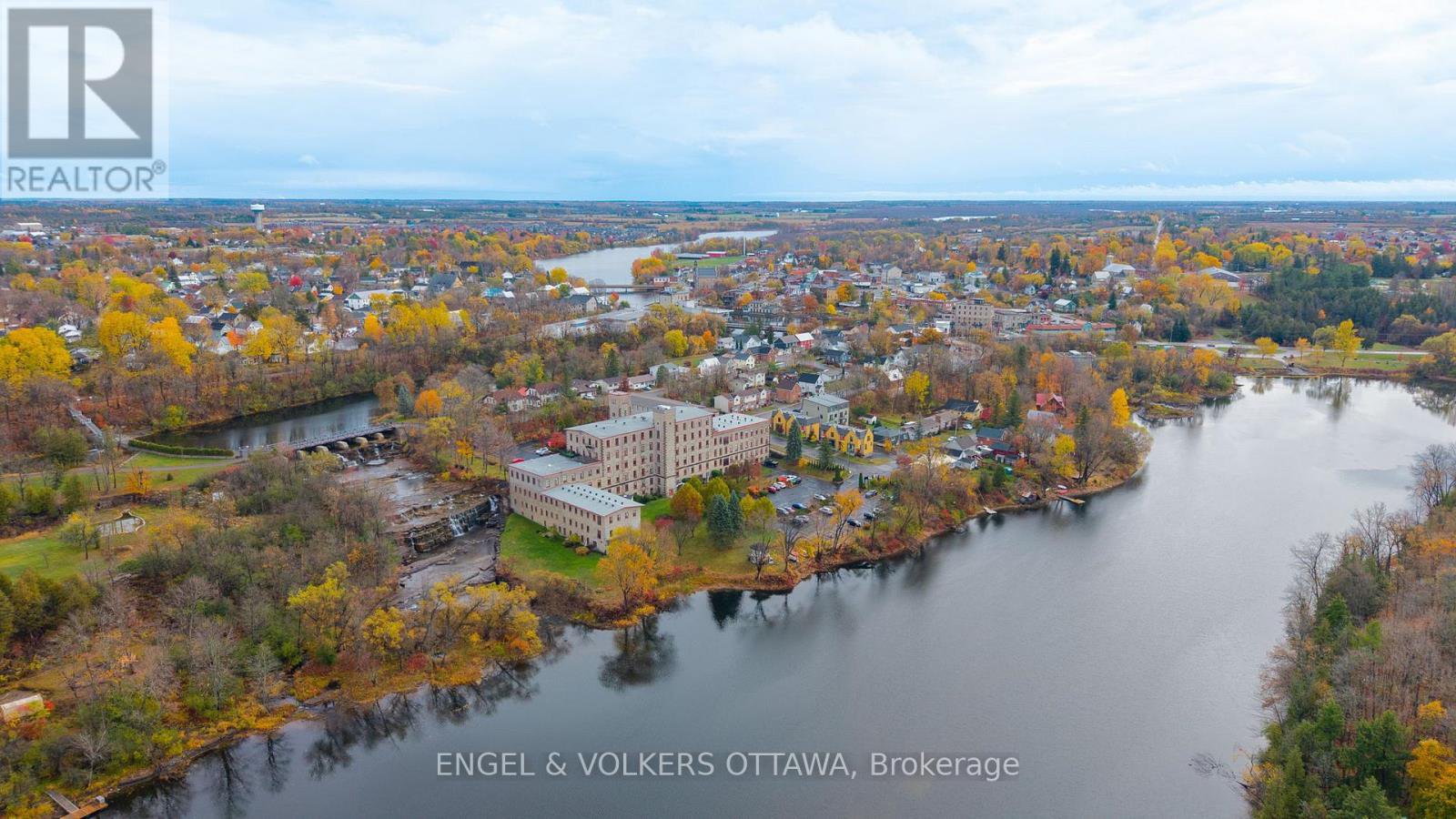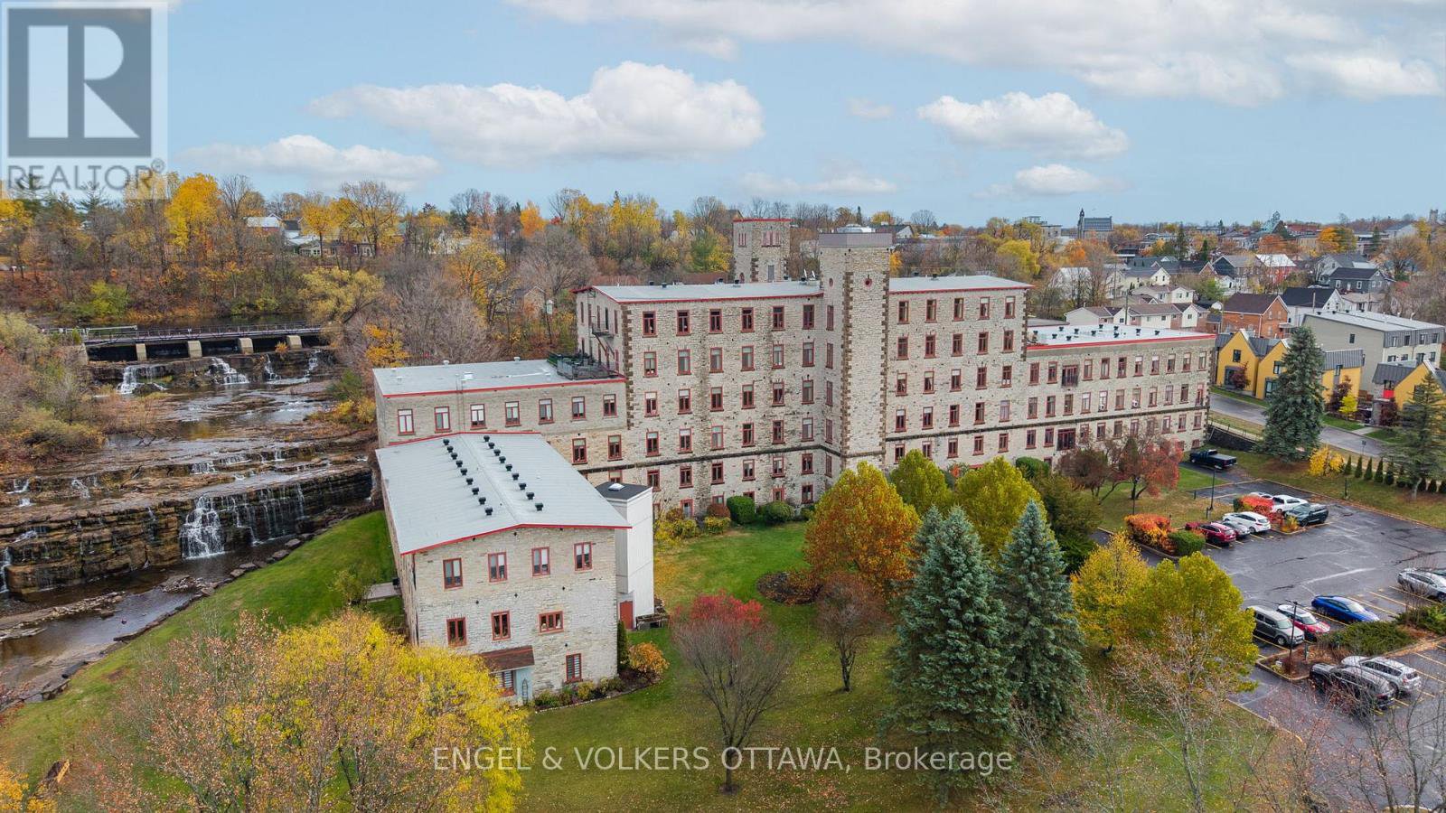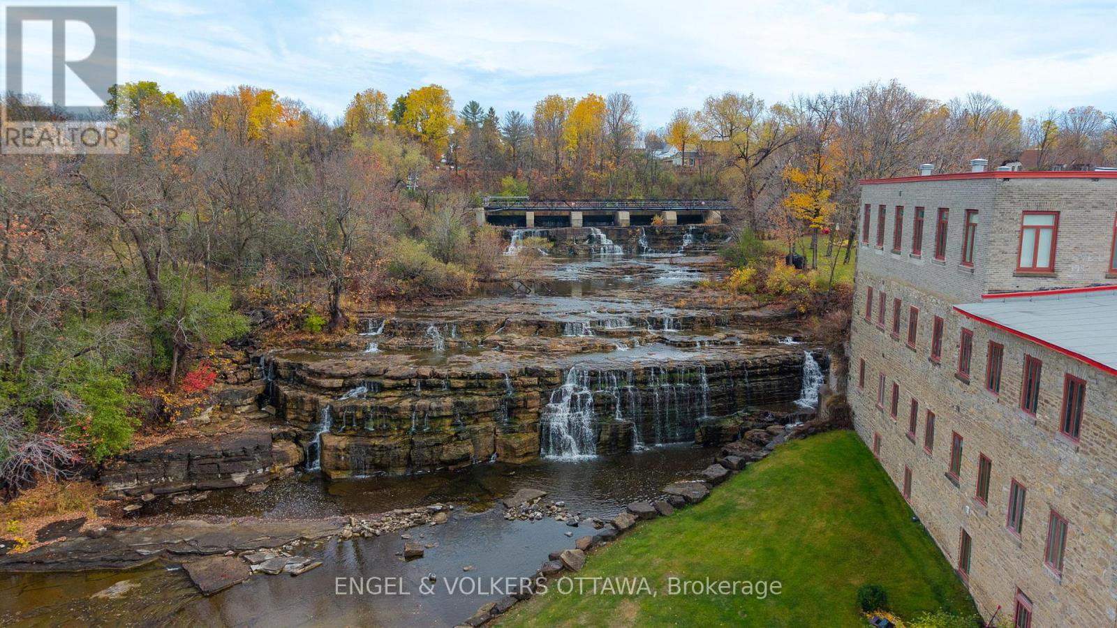 Set within a beautifully restored historic mill, this building is situated along the banks of the Mississippi River. With one bedroom, a den (being used as a bedroom), two bathrooms, and all-new windows (2022), it spans 1,173 sq. ft. and combines open-concept living with architectural detailing. The inviting main living area features rich engineered hardwood flooring (2017), whitewashed brick walls, and tall arched windows that fill the space with natural light while framing the unobstructed river views. The renovated kitchen (2017) offers quartz countertops, under-cabinet lighting, and stainless steel appliances, including a new fridge, stove, dishwasher, hood fan, and microwave. The adjoining dining area has a unique brick feature wall with arched niches and built-in shelving, creating a charming focal point for entertaining. The primary bedroom has an arched window, double-door closet, and an ensuite updated in 2017 with a walk-in shower, ceramic tile, and a new floating vanity. A second bedroom provides flexibility for guests or a home office, while the second bathroom, also updated in 2017, mirrors the same modern aesthetic as the ensuite. In-suite laundry, one parking space and an exclusive storage locker located on the same level as the unit make this home extremely convenient. Beautifully maintained common spaces and access to scenic outdoor areas overlooking the river and nearby waterfalls make this a wonderful place to live. The community fosters a welcoming atmosphere, offering weekly activities such as movie nights, exercise classes, and social gatherings, all while being just steps from Almonte's charming downtown with boutique shops, cafés, parks, and a vibrant cultural scene. With its rich history, modern updates, and riverside setting, this condo captures the essence of refined small-town living.