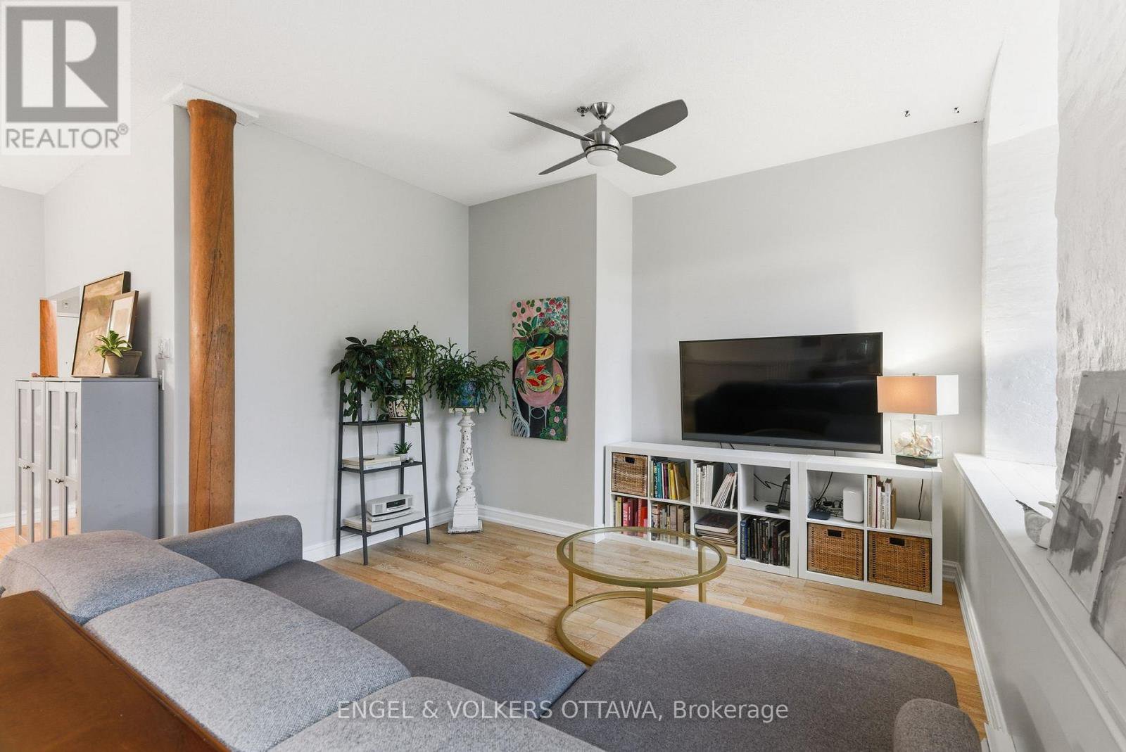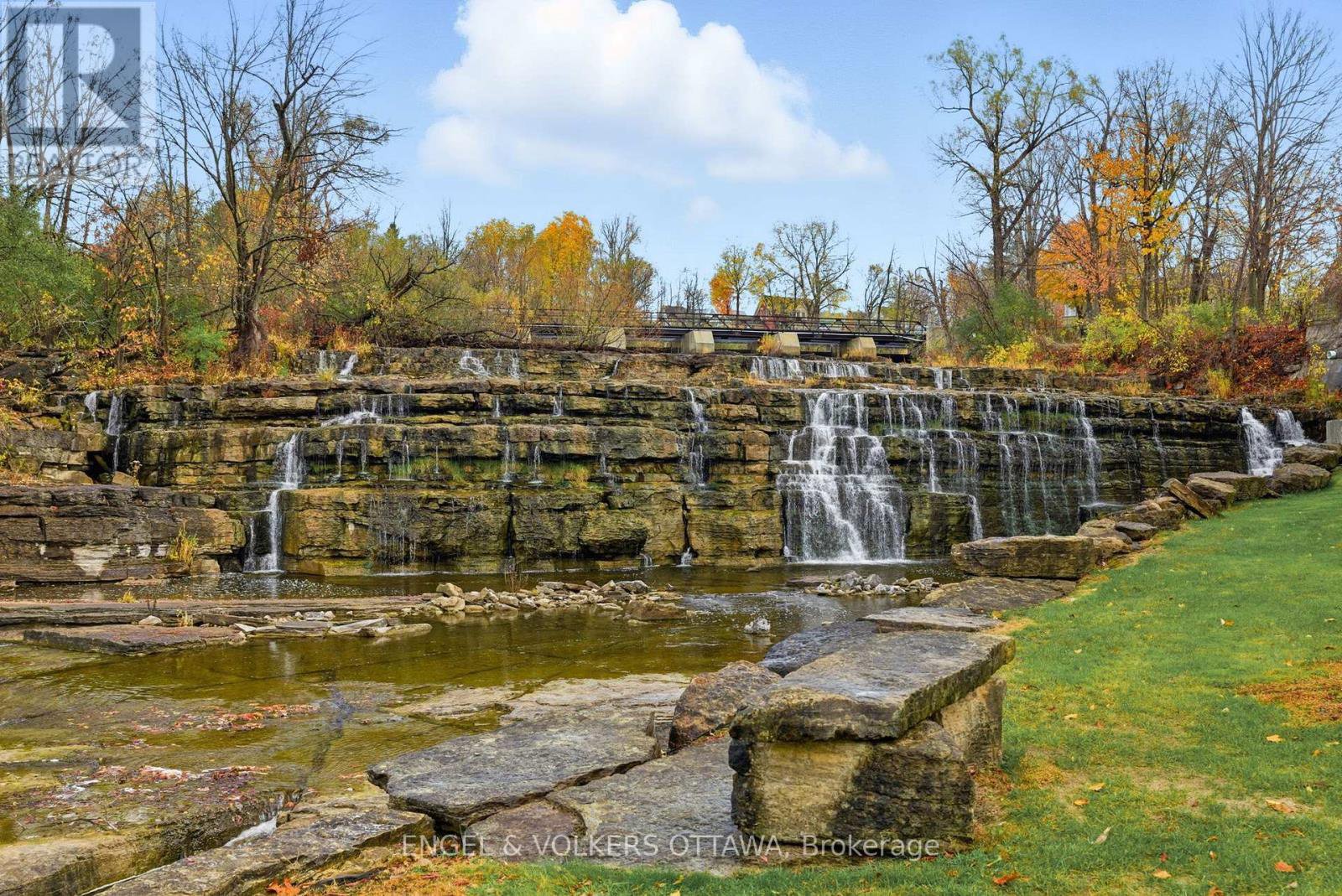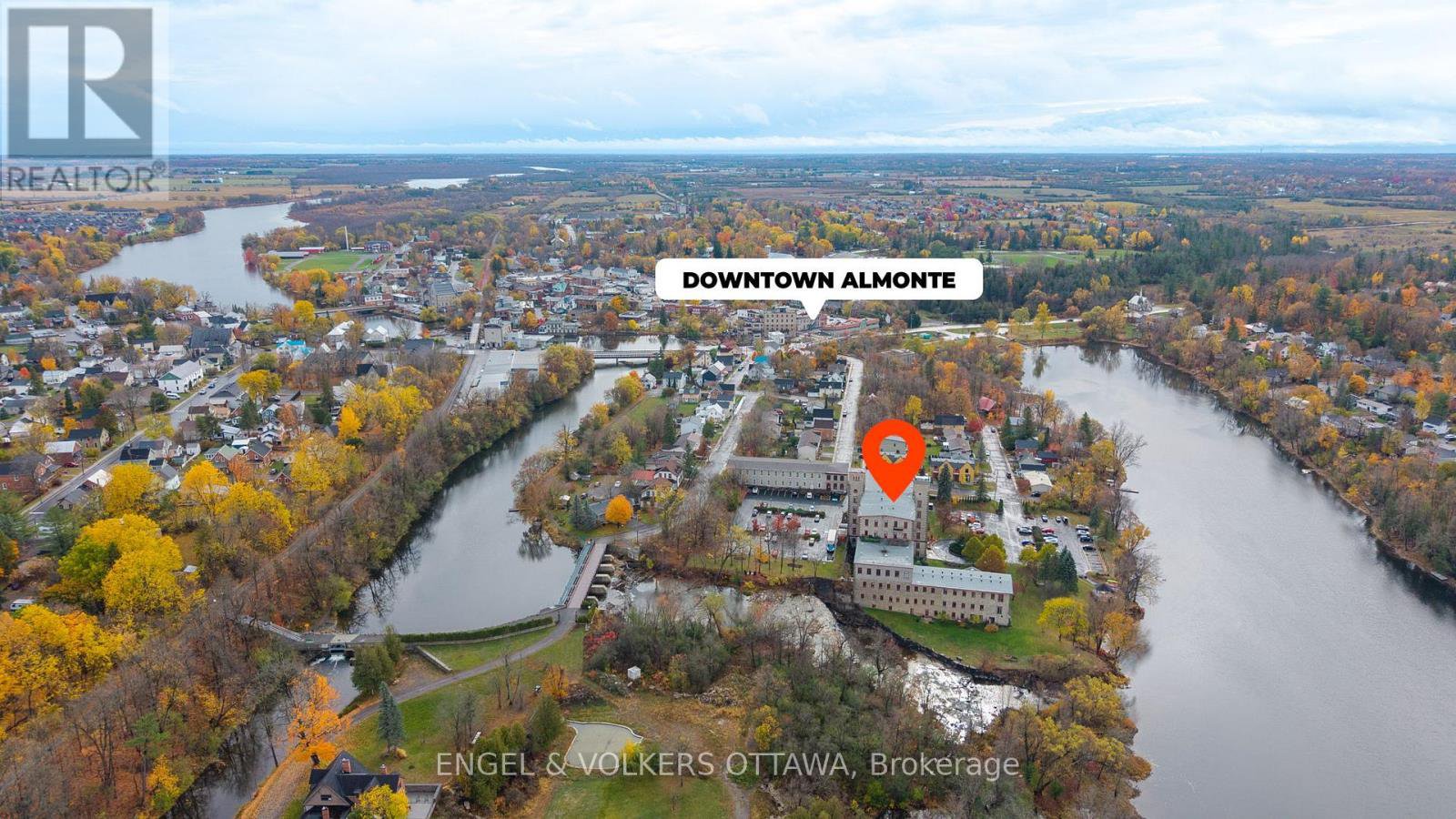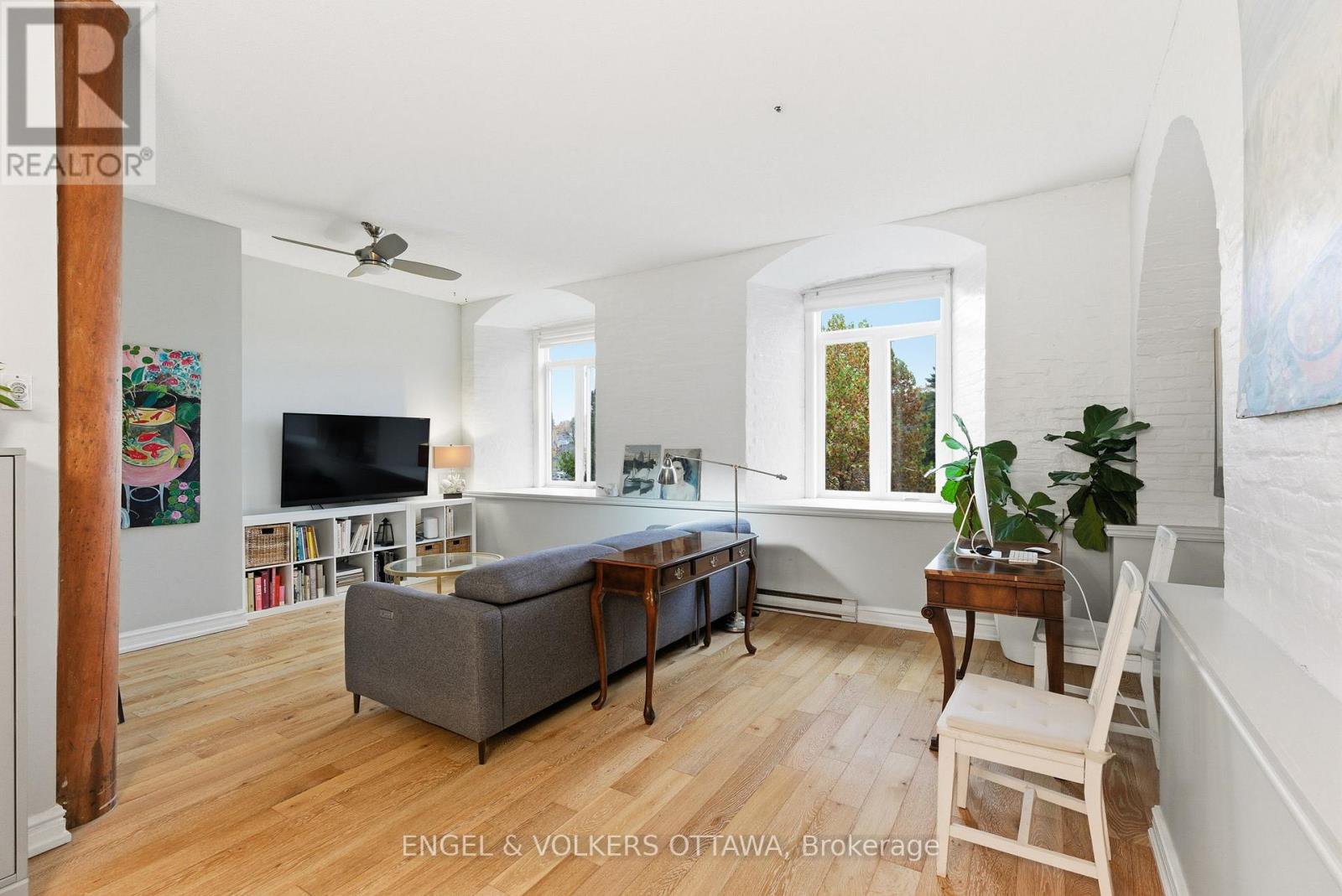 Set within a beautifully restored historic mill, this building is situated along the banks of the Mississippi River. With one bedroom, a den (being used as a bedroom), two bathrooms, and all-new windows (2022), it spans 1,173 sq. ft. and combines open-concept living with architectural detailing. The inviting main living area features rich engineered hardwood flooring (2017), whitewashed brick walls, and tall arched windows that fill the space with natural light while framing the unobstructed river views. The renovated kitchen (2017) offers quartz countertops, under-cabinet lighting, and stainless steel appliances, including a new fridge, stove, dishwasher, hood fan, and microwave. The adjoining dining area has a unique brick feature wall with arched niches and built-in shelving, creating a charming focal point for entertaining. The primary bedroom has an arched window, double-door closet, and an ensuite updated in 2017 with a walk-in shower, ceramic tile, and a new floating vanity. A second bedroom provides flexibility for guests or a home office, while the second bathroom, also updated in 2017, mirrors the same modern aesthetic as the ensuite. In-suite laundry, one parking space and an exclusive storage locker located on the same level as the unit make this home extremely convenient. Beautifully maintained common spaces and access to scenic outdoor areas overlooking the river and nearby waterfalls make this a wonderful place to live. The community fosters a welcoming atmosphere, offering weekly activities such as movie nights, exercise classes, and social gatherings, all while being just steps from Almonte's charming downtown with boutique shops, cafés, parks, and a vibrant cultural scene. With its rich history, modern updates, and riverside setting, this condo captures the essence of refined small-town living.