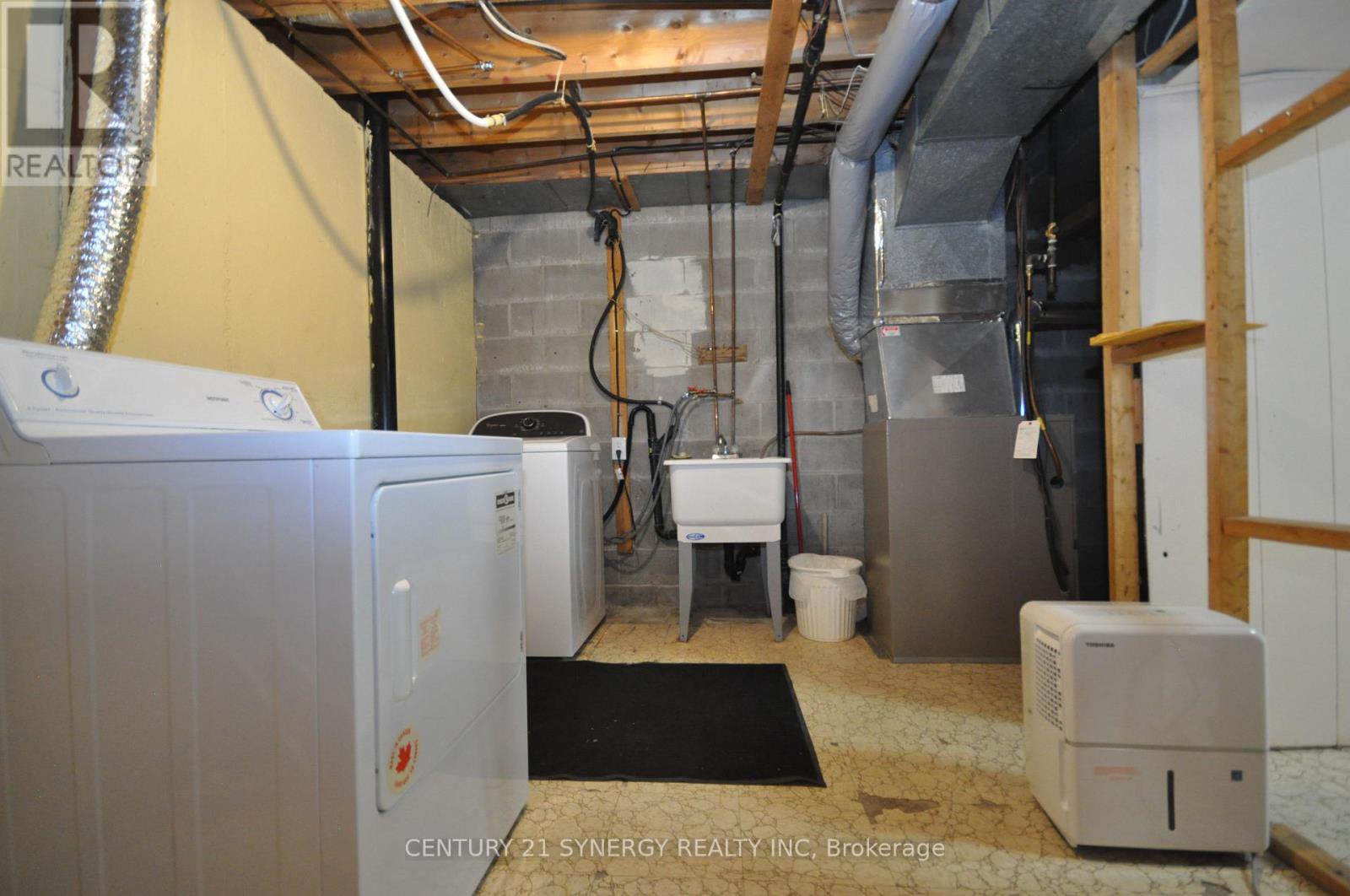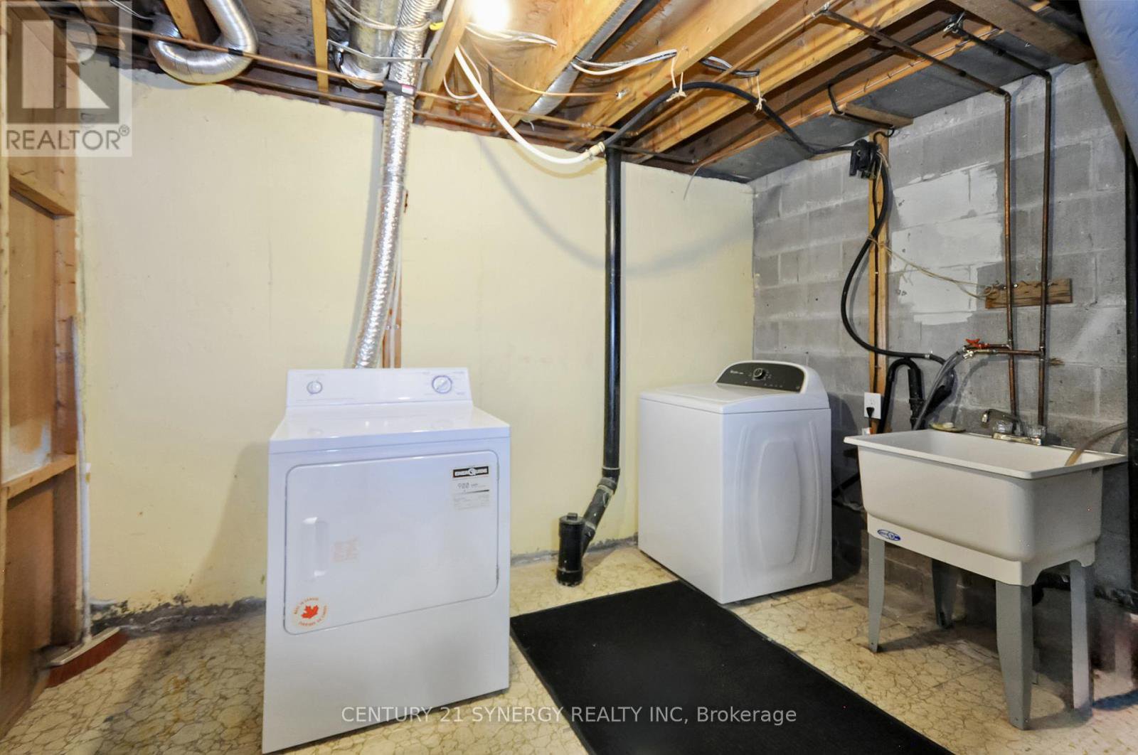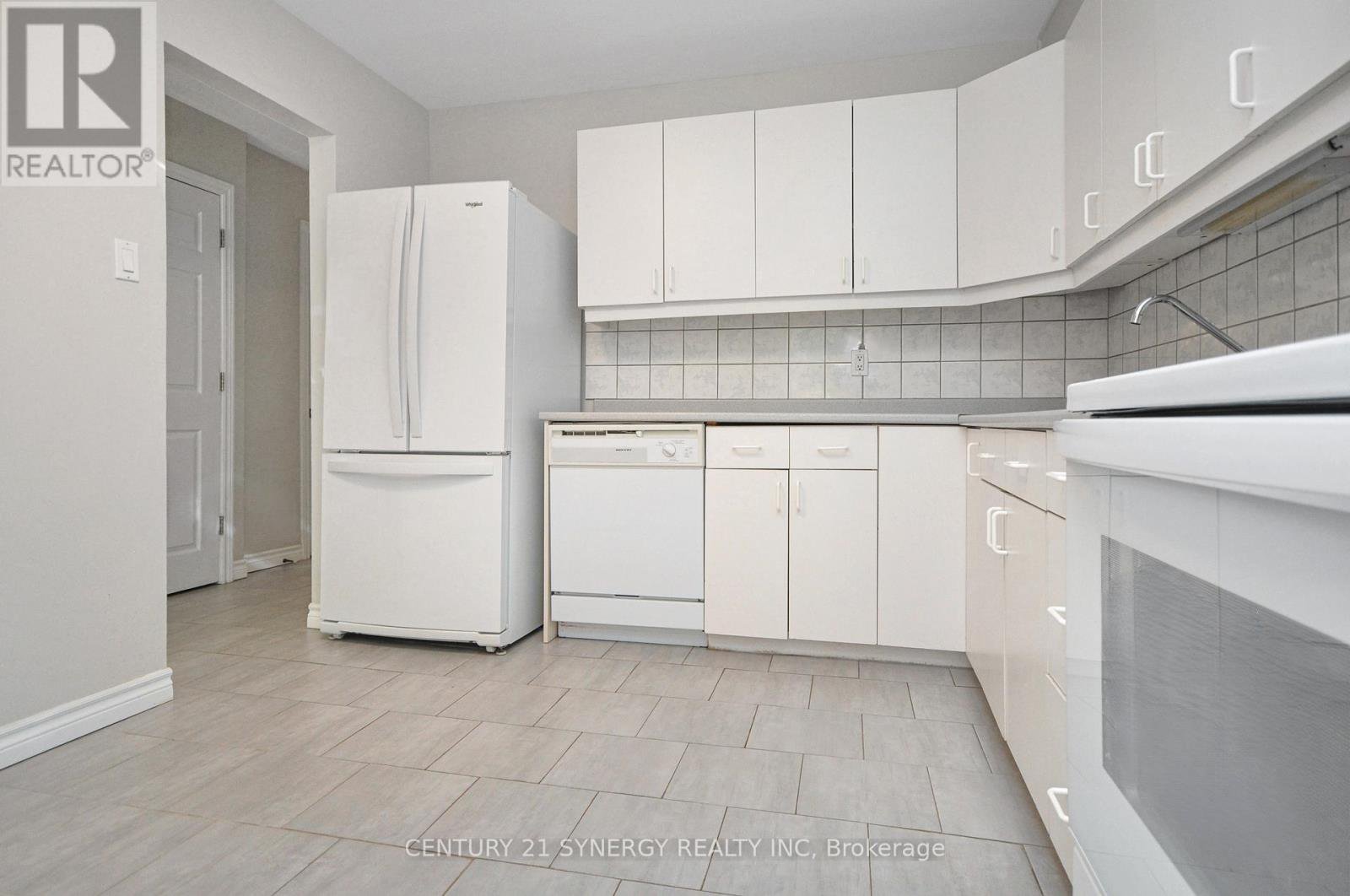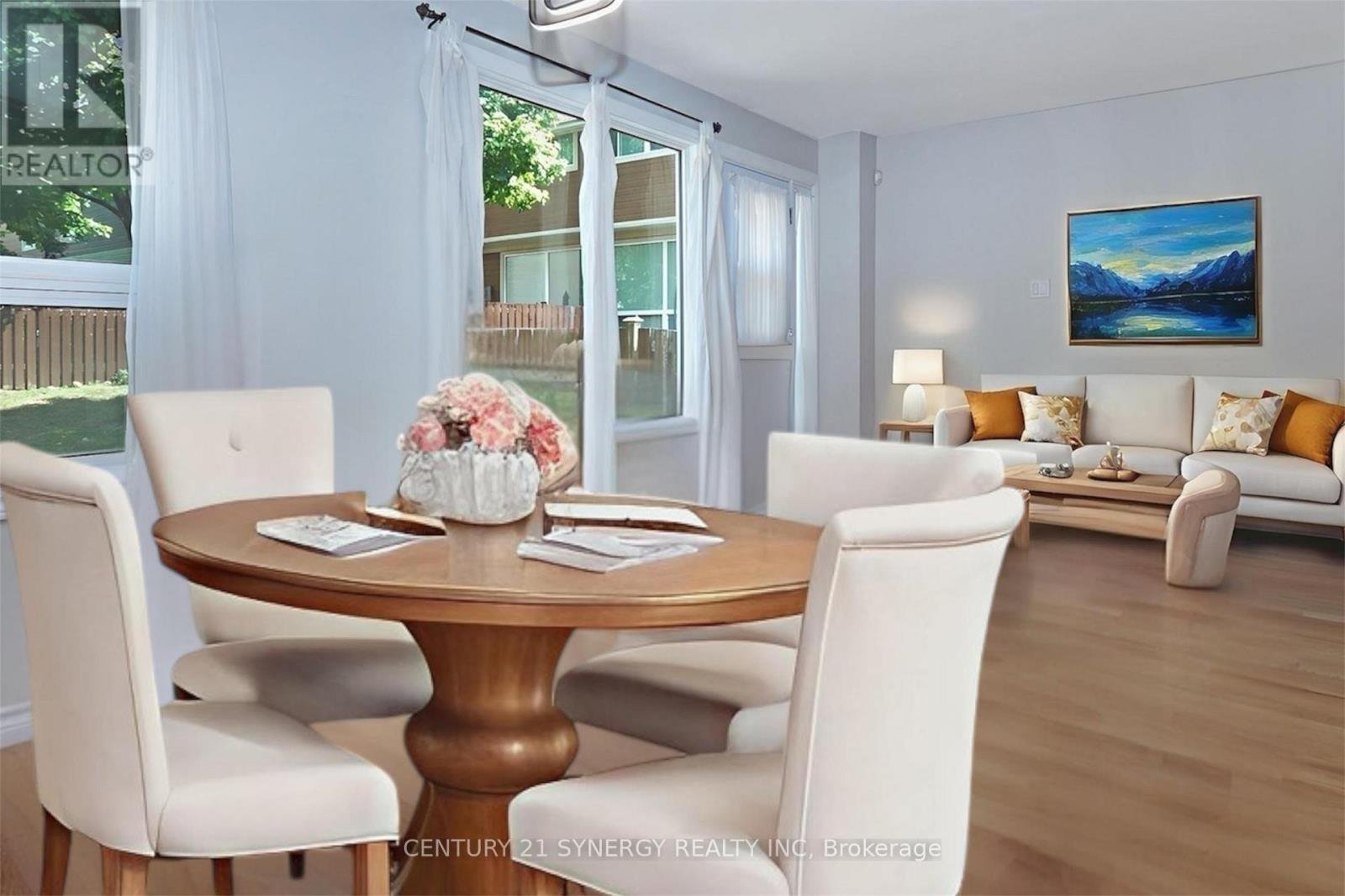 Some photos have been virtually staged. Move-in ready, end-unit townhome, has both garage and driveway parking. Step inside and find a spacious foyer with easy-maintenance tile flooring and a large double closet. The main level, stairs, and second floor all feature hardwood flooring in excellent condition. A spacious L-shaped living and dining room boasts large windows and a garden door leading to the rear yard. The eat-in kitchen offers ample counter and cupboard space and includes appliances. A two-piece bathroom completes this level. Upstairs, you will enjoy the space and comfort found in the primary bedroom, complete with a double closet and a two-piece ensuite bathroom. Two additional family-sized bedrooms and a renovated four-piece bathroom are also located on this floor. The basement includes a large recreation room area, ready for your personal redesign, and there is a combined laundry and utility room. Enjoy the peace and privacy of backing onto  treed green space. Located close to Blair LRT Station, schools, parks, groceries, restaurants, theatres, Pineview Golf Course, & more!