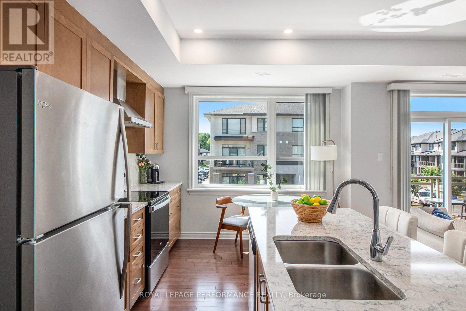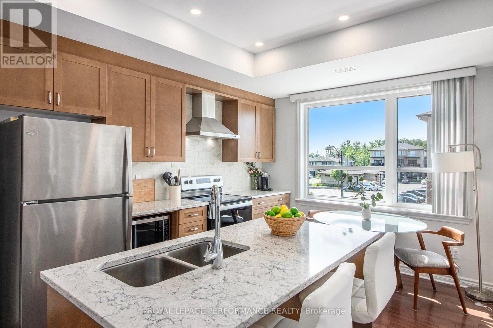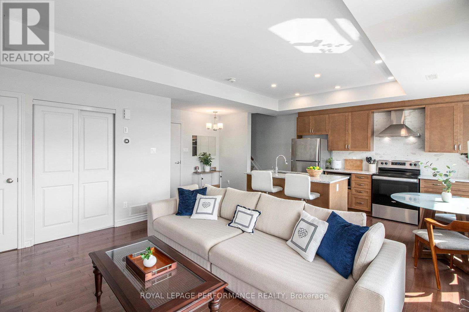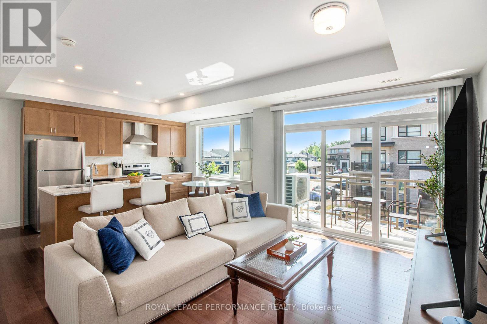 Spectacular Upper-Level 2-Storey Condo Top Floor with Premium Finishes! Welcome to this rarely available upper-level stacked 2-storey condo unit offering 1,196 sq ft of luxurious living space built in 2020! Boasting 2 spacious bedrooms, 2.5 beautifully appointed bathrooms, and impressive upgrades throughout, this sun-drenched home is a true gem. Step inside and be captivated by the stunning open-concept second level, featuring rich hardwood flooring and a dramatic wall of windows that floods the space with natural light. The stylish living room opens to a private balcony through sliding patio doors, creating a seamless indoor-outdoor flow, perfect for morning coffee or evening relaxation. The modern kitchen is a chefs dream, complete with sleek granite countertops, a designer tile backsplash, pot lights, stainless steel appliances, a breakfast bar, and a bright eat-in area ideal for casual dining. A chic 2-piece powder room completes this level, perfect for guests. Upstairs, the third level offers a tranquil retreat. The generously sized primary bedroom features a walk-in closet and a gorgeous 3-piece ensuite with an oversized glass shower and granite vanity. A bright and spacious second bedroom and a modern 4-piece main bathroom provide comfort and convenience for family or guests. Additional features include in-suite laundry, one parking space, and low-maintenance condo living at its finest. Located in a vibrant community just steps from parks, schools, walking paths by the pond, and all major amenities, this spectacular unit offers style, space, and unbeatable convenience. Don't miss your chance to call this exceptional property home!