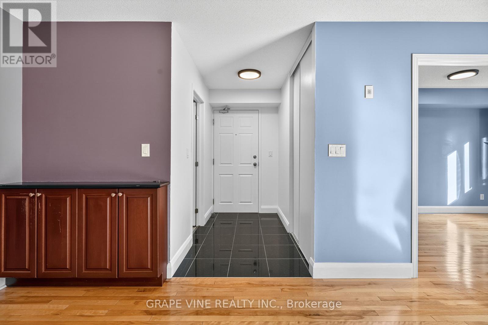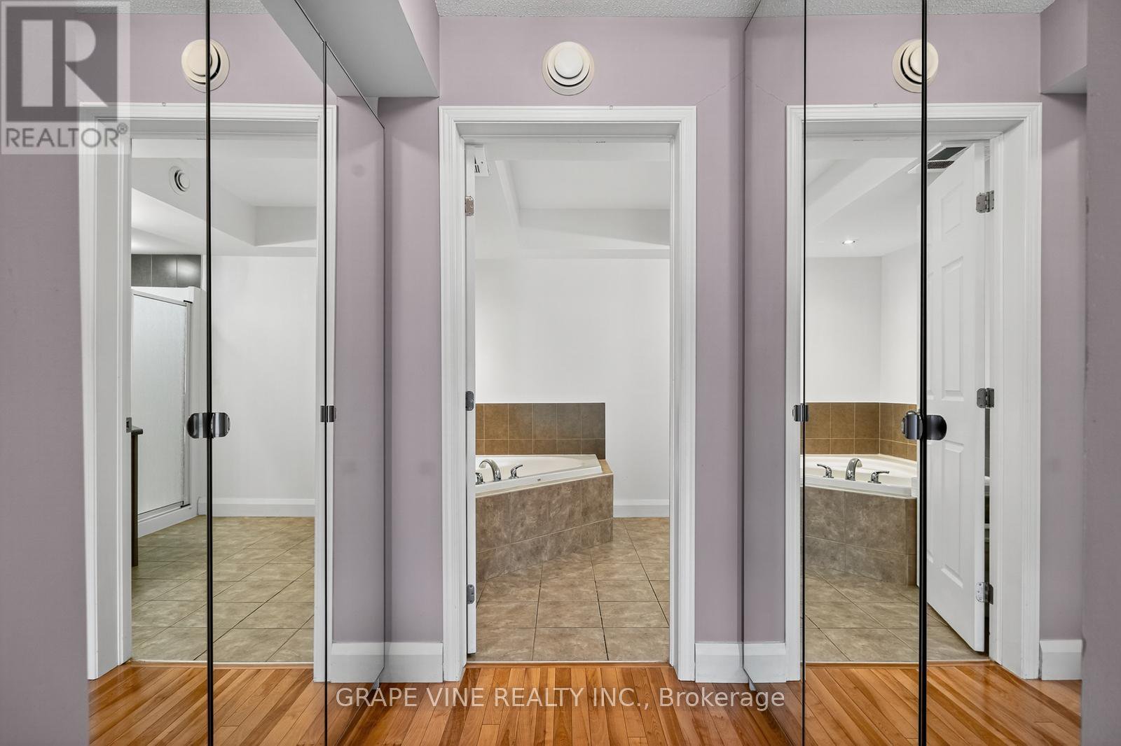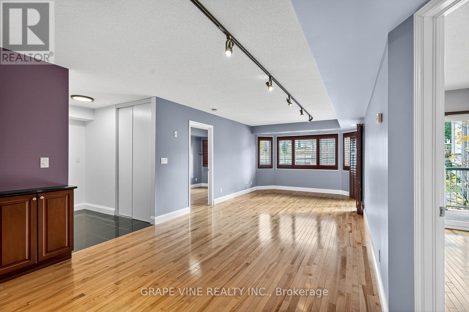 Executive living at it's best in this 1138 sq ft spacious and bright corner unit. Building features only 2 units per level! Convenient access to highway 174 and LRT and right down the street from the White Sands Golf Course. Carpet-free with gleaming hardwood and tiling throughout with upgraded baseboards. The spacious foyer with marble tile flooring features a large closet and a full 4 piece bathroom. The kitchen includes granite countertops, rich, dark wood cabinetry, stainless steel appliances (new dishwasher 2024), and an island with breakfast bar overlooking the dining and living area. Enjoy the large south-facing covered balcony accessible from the patio doors in the living room, or the Primary bedroom - a perfect place to enjoy your morning coffee, or unwind at the end of the day. The large Primary bedroom features separate his and hers closets with upgraded built-in cabinetry, a 4-piece ensuite including a separate shower and soaker tub. Spacious secondary bedroom also with upgraded built-in cabinetry. Custom shutters in living room and both bedroom windows. Convenient in-unit stacked washer/dryer (purchased in Sept. 2025), 1 owned parking space (#27 - close to the main door), and 1 storage locker (#10). Amenities include visitor parking, water, and an elevator.