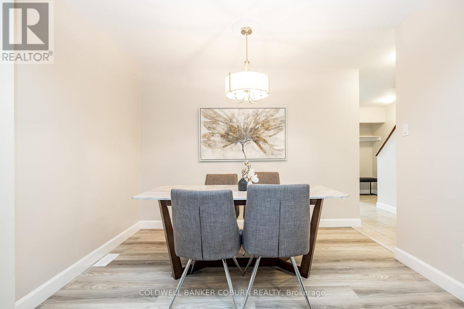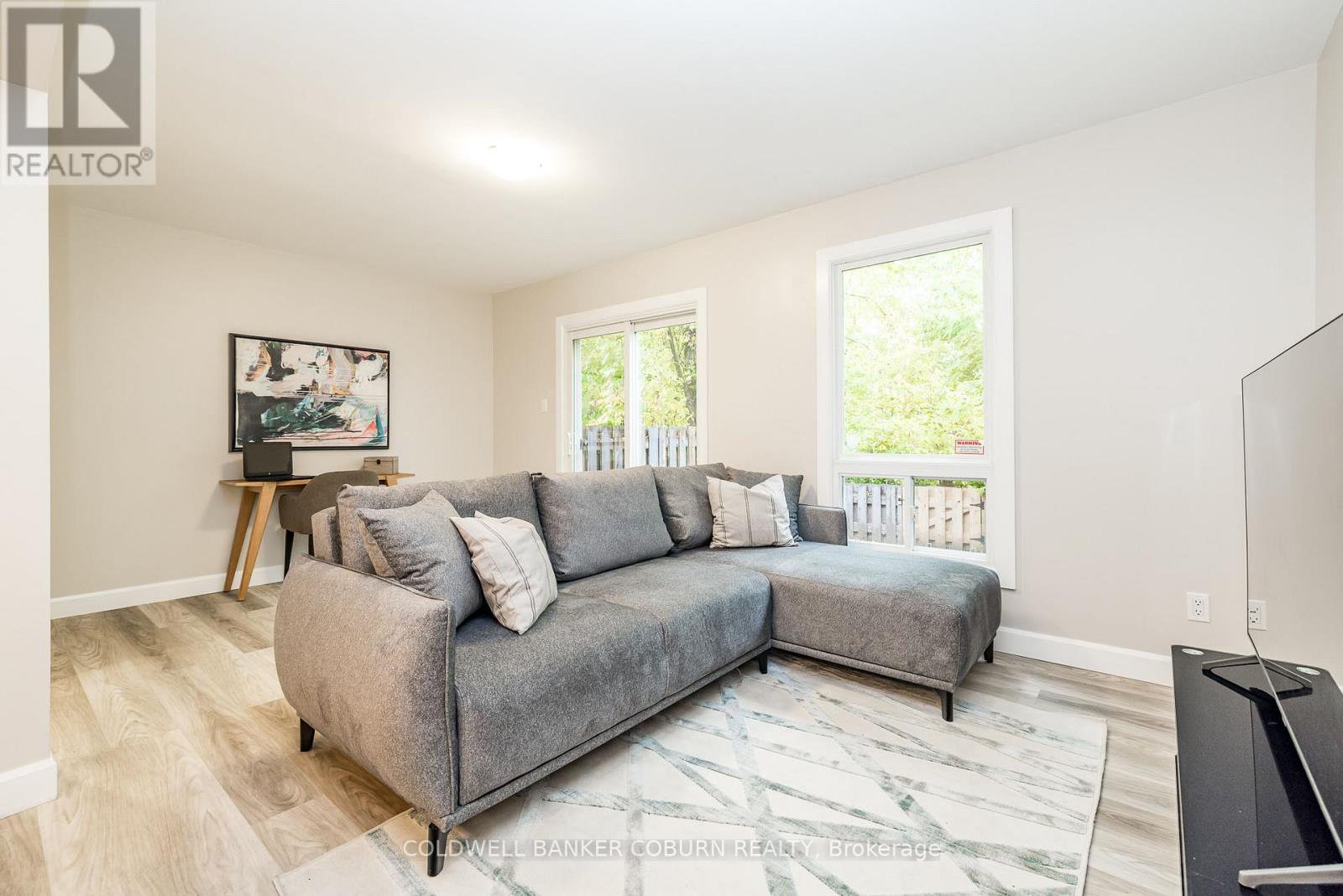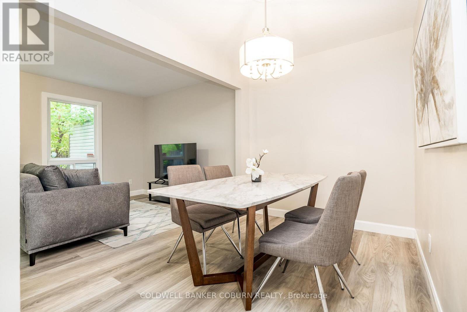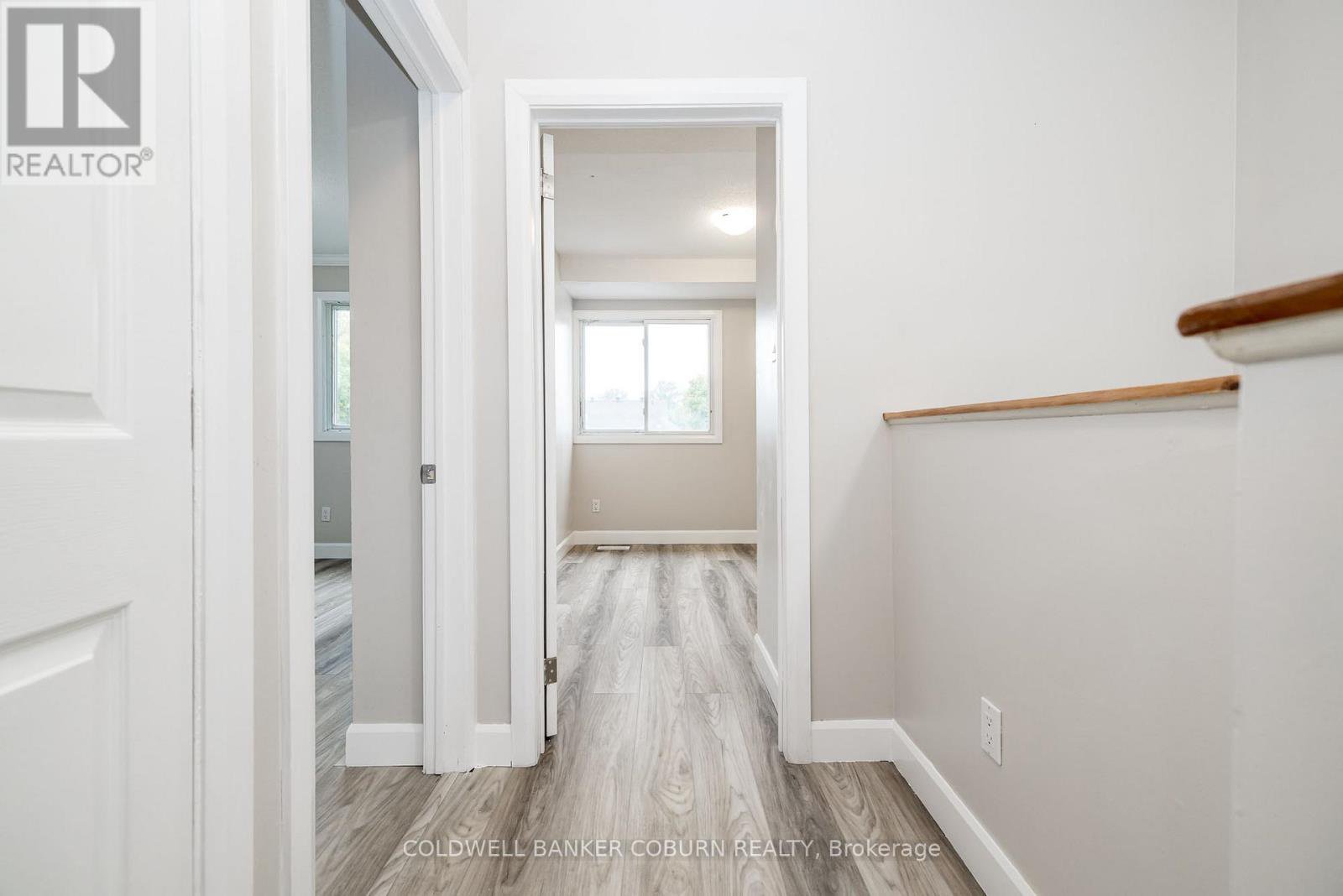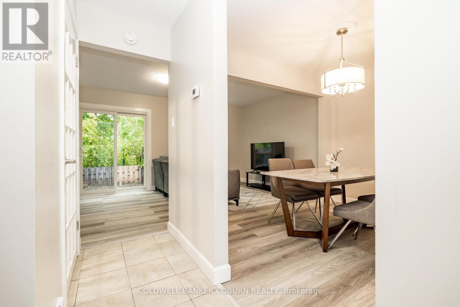 FULLY RENOVATED townhouse condo in Blossom Park with NO REAR NEIGHBOURS! Welcome to this beautifully renovated row unit offering privacy, style, and modern updates throughout. Backing onto a peaceful treed area with a bike path and no rear neighbours, this home is the perfect blend of nature and convenience. Step inside to find a freshly painted interior, luxury vinyl flooring throughout, flat ceilings on main and lower, and contemporary light fixtures that elevate the bright, airy feel of the space. The white kitchen has been fully updated with new appliances, modern countertop, double sink with new faucet, and space for additional storage or a cozy breakfast table. The open-concept dining and living area features chic ceiling lights and offers versatile space to include a TV lounge and home office setup. From here, step out to your private back patio, surrounded by mature trees - a tranquil retreat right at home. You'll find brand-new carpeting heading upstairs, and vinyl flooring throughout the second level. The bright primary bedroom overlooks the private back patio with a beautiful tree line, and has extra wide closet. Adjacent is the beautifully renovated 4pc main bathroom with oak vanity, ceramic tile flooring, luxury subway tile in shower and stylish finishes. Two spacious bedrooms complete the second floor, both freshly painted with newly added ceiling lights for a bright and welcoming feel. The finished lower level includes a renovated 2-piece bathroom, matching vinyl flooring, modern pot lights, and a laundry room with plenty of storage space. This move-in-ready home is in a well-located community, 5 min walk to Aladdin park w/ tennis & basketball courts, close to airport, schools, shopping, and transit. Don't miss this turnkey gem in Blossom Park!