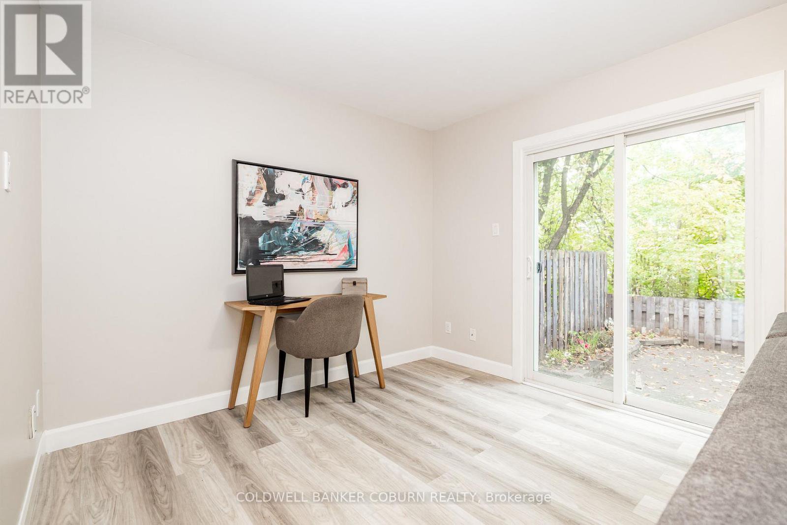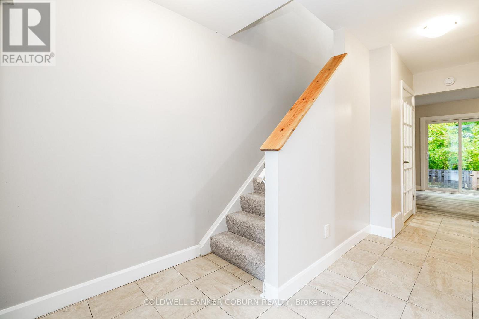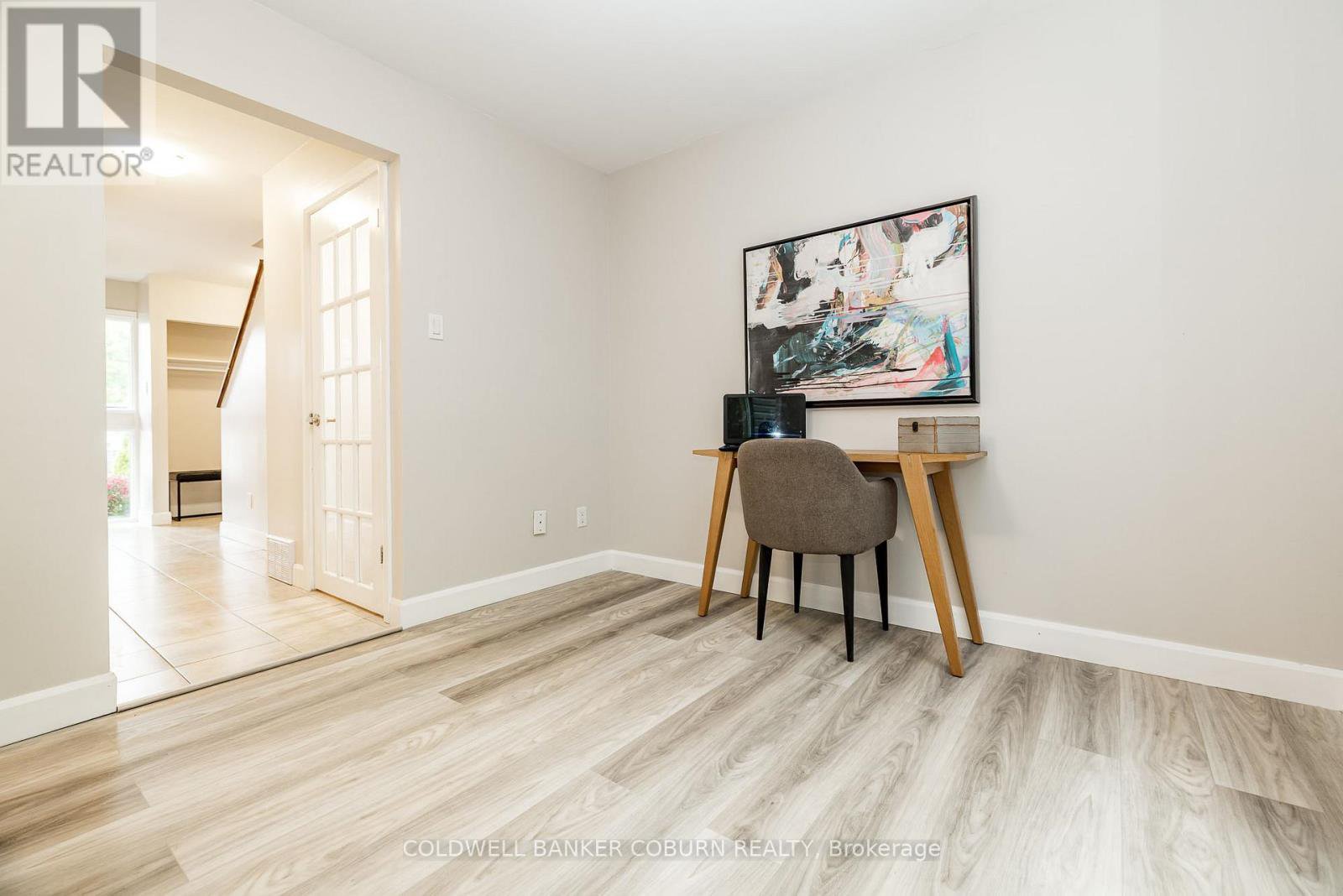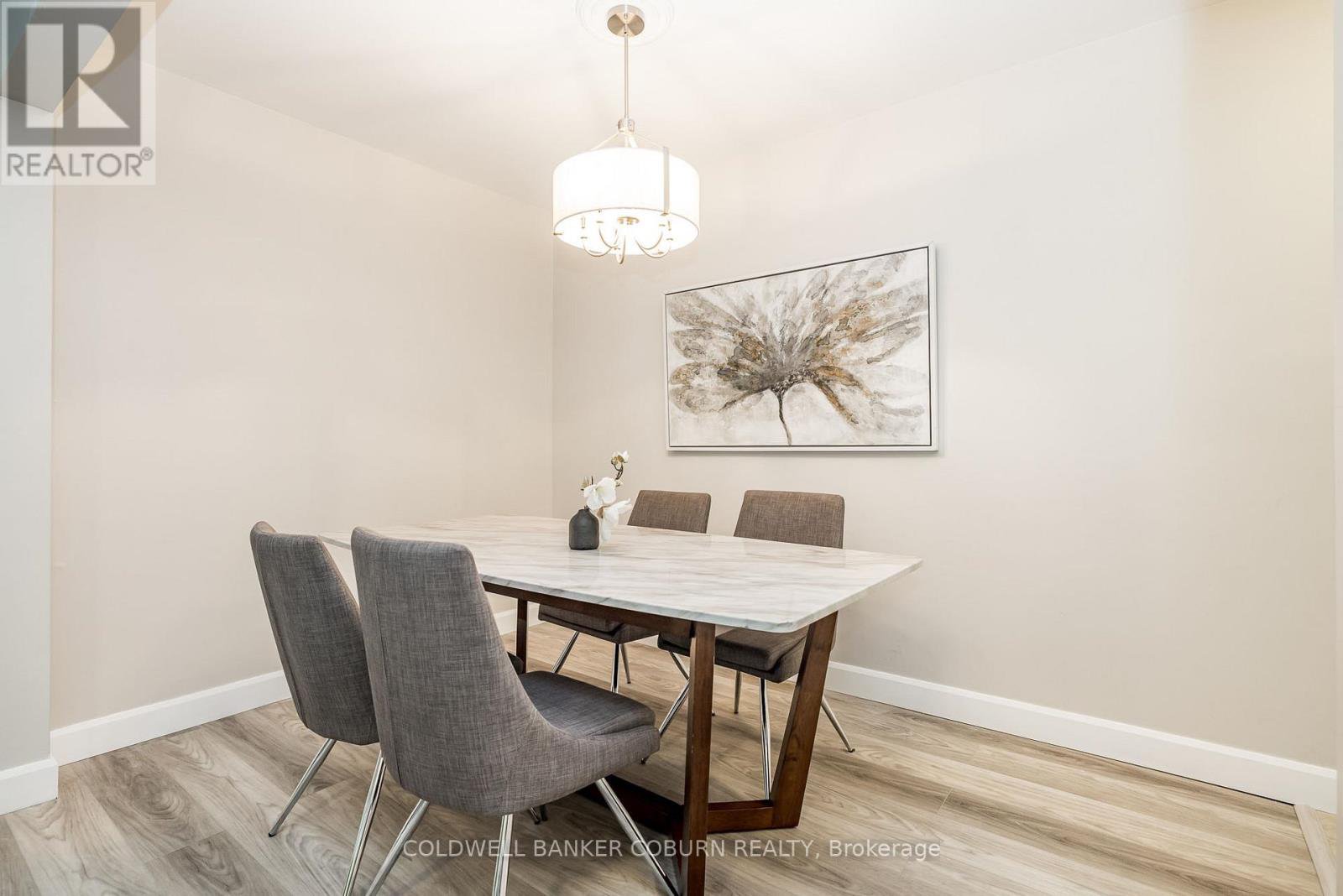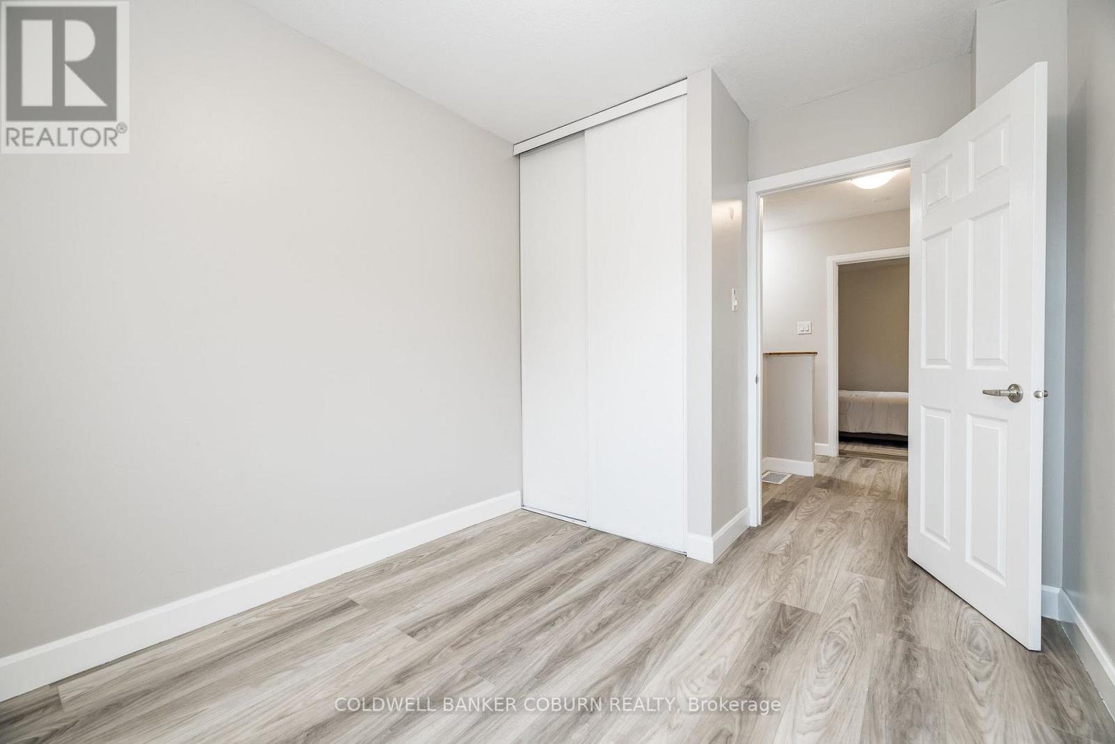 FULLY RENOVATED townhouse condo in Blossom Park with NO REAR NEIGHBOURS! Welcome to this beautifully renovated row unit offering privacy, style, and modern updates throughout. Backing onto a peaceful treed area with a bike path and no rear neighbours, this home is the perfect blend of nature and convenience. Step inside to find a freshly painted interior, luxury vinyl flooring throughout, flat ceilings on main and lower, and contemporary light fixtures that elevate the bright, airy feel of the space. The white kitchen has been fully updated with new appliances, modern countertop, double sink with new faucet, and space for additional storage or a cozy breakfast table. The open-concept dining and living area features chic ceiling lights and offers versatile space to include a TV lounge and home office setup. From here, step out to your private back patio, surrounded by mature trees - a tranquil retreat right at home. You'll find brand-new carpeting heading upstairs, and vinyl flooring throughout the second level. The bright primary bedroom overlooks the private back patio with a beautiful tree line, and has extra wide closet. Adjacent is the beautifully renovated 4pc main bathroom with oak vanity, ceramic tile flooring, luxury subway tile in shower and stylish finishes. Two spacious bedrooms complete the second floor, both freshly painted with newly added ceiling lights for a bright and welcoming feel. The finished lower level includes a renovated 2-piece bathroom, matching vinyl flooring, modern pot lights, and a laundry room with plenty of storage space. This move-in-ready home is in a well-located community, 5 min walk to Aladdin park w/ tennis & basketball courts, close to airport, schools, shopping, and transit. Don't miss this turnkey gem in Blossom Park!
