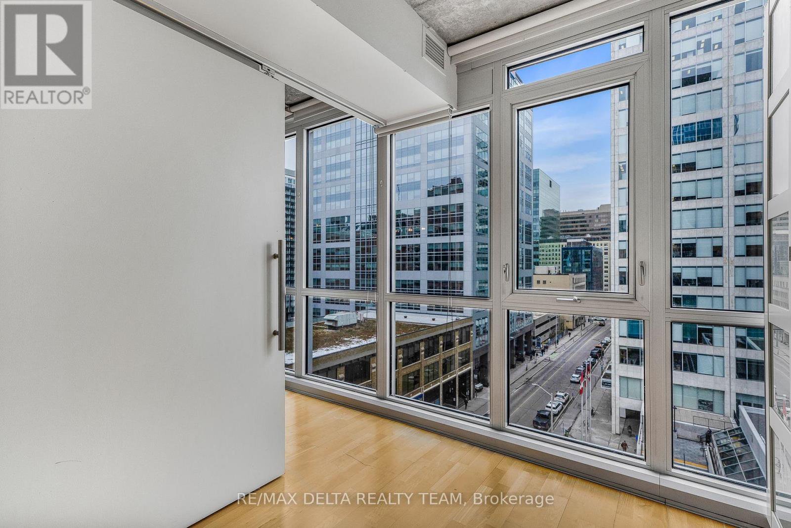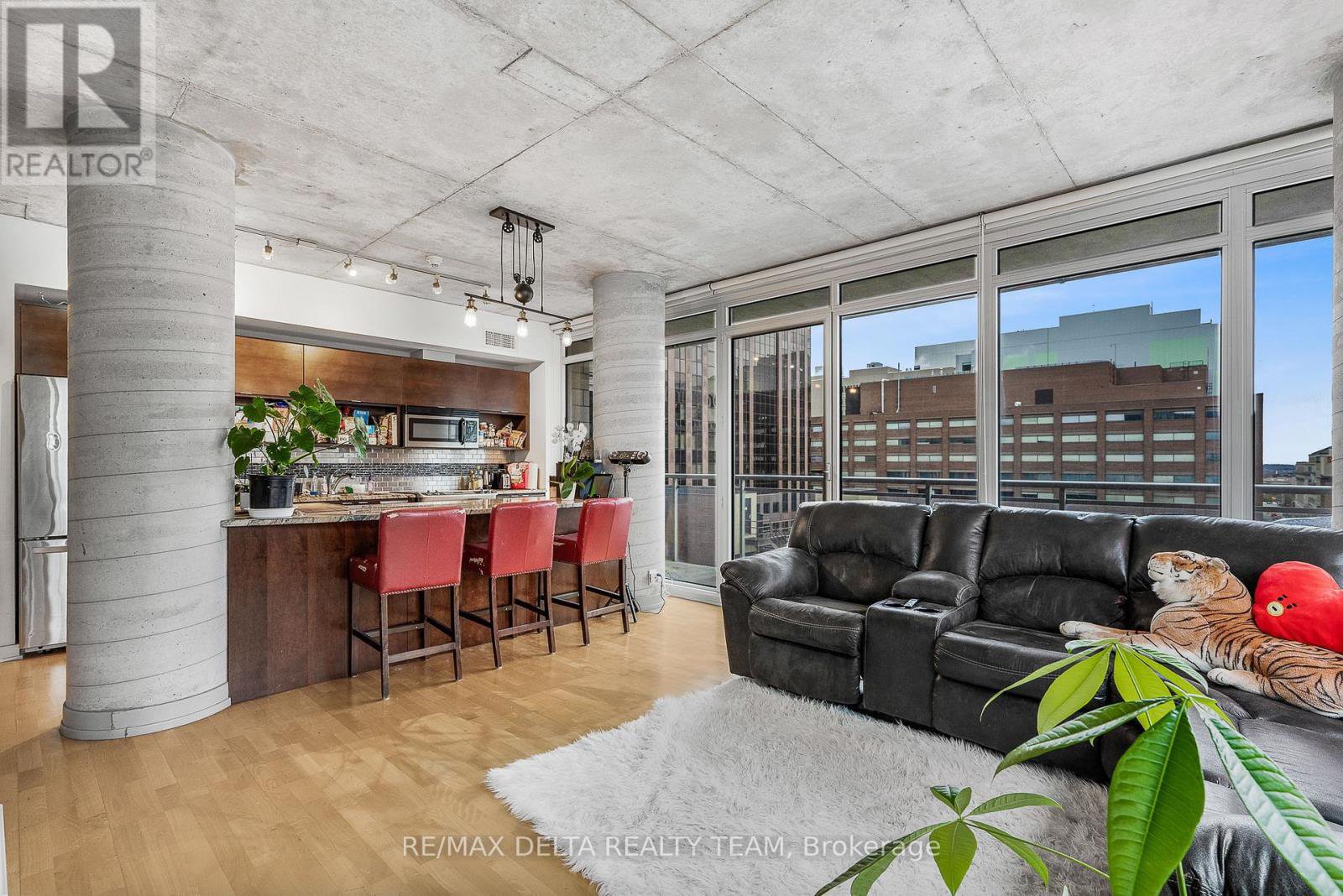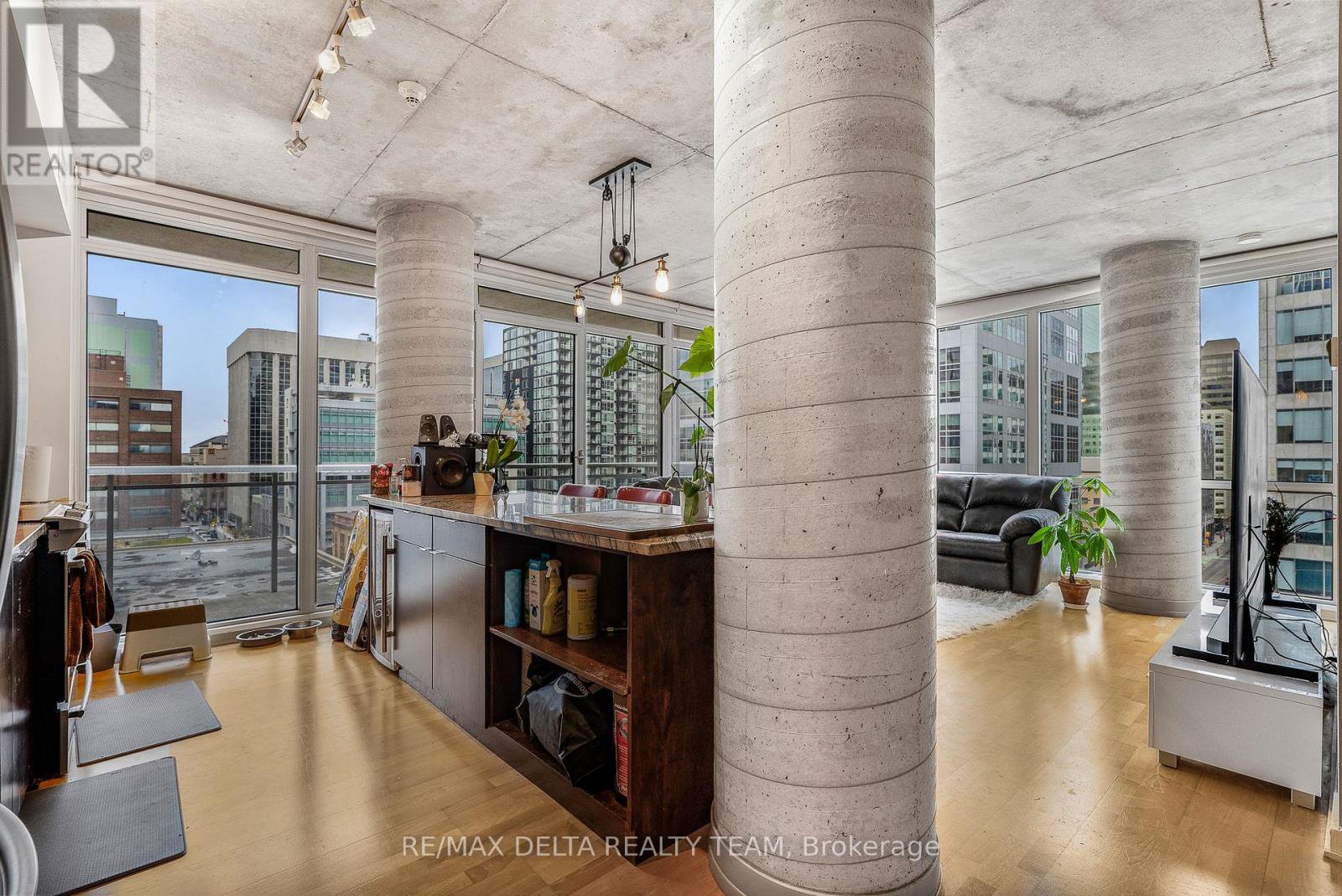 Welcome to 809-324 Laurier Ave W, an impeccable two bedroom, two bathroom corner condominium situated in the heart of downtown Ottawa. Featuring hardwood flooring throughout, this bright and airy unit is enhanced by two full walls of windows, offering exceptional natural light and sweeping views of the downtown core. The open-concept layout creates a seamless flow between the kitchen and living areas. The modern kitchen is equipped with a 10 ft. island, quartz countertops, and stainless steel appliances, combining both style and functionality. A separate open den/office area and 9 ft. ceilings further elevate the spacious feel of the home. The primary bedroom also showcases stunning city views, while the in-unit laundry ensures optimal convenience. Completing this impressive offering are one underground parking space and a dedicated storage locker. The building itself features a resort-style outdoor pool, BBQ terrace, concierge, gym, and party room. An unbeatable location-just steps to the LRT, Ottawa U, Rideau Centre, major transit routes, shopping, and restaurants. Parking Level A #28. Storage locker Level A #53.