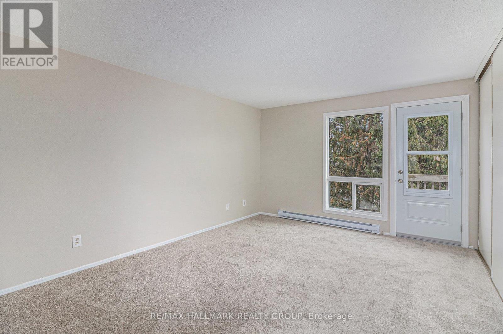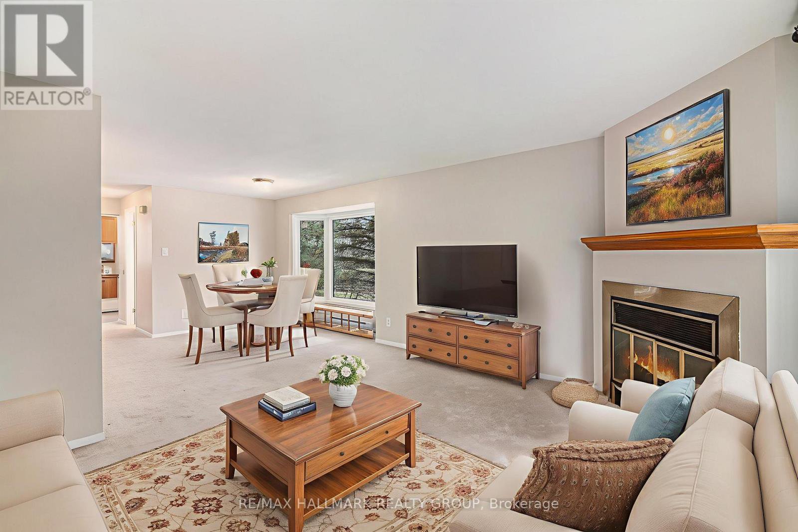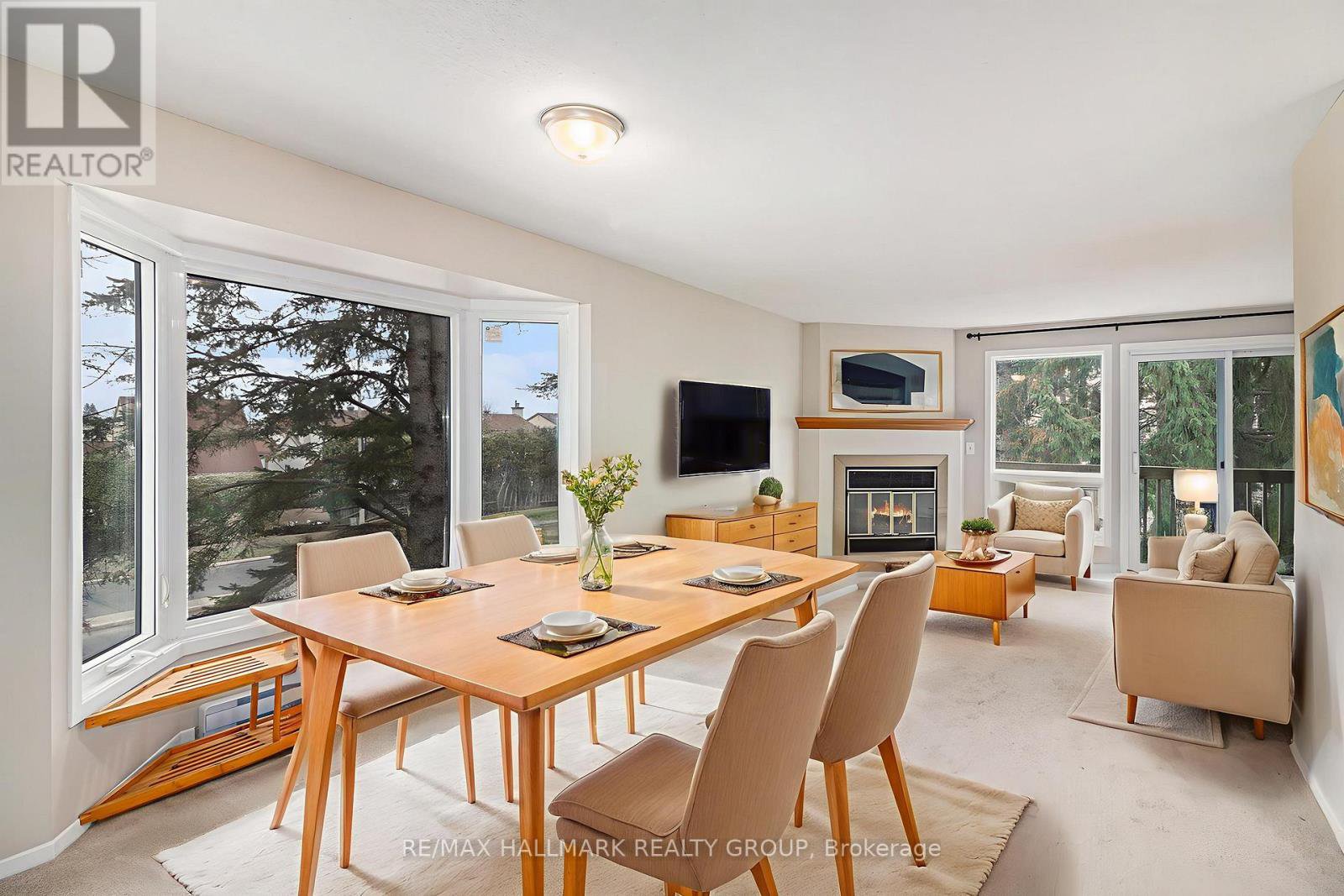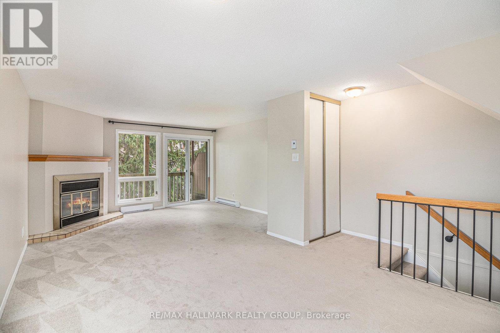 Well maintained, end-unit 2-bedroom, 2 bath upper terrace condo offering a bright interior in a peaceful, forest-backed setting of Convent Glen. The main level features an open-concept living/dining area with a cozy wood-burning fireplace and access to a private balcony with tranquil green-space views. A sun-filled eat-in kitchen and convenient powder room complete the main floor. Upstairs you'll find a sky light over the staircase & upper hallway, spacious primary bedroom with wall-to-wall closet space and its own private balcony, a bright second bedroom, full bathroom, and in-unit laundry/storage area. Newer carpets on the upper level, newer full sized washer/dryer and freshly painted throughout. Located steps from parks, playgrounds, transit, shops and the Ottawa River pathways, with easy access to Place d'Orléans, Petrie Island Beach and the LRT station. A perfect low-maintenance home in a highly desirable, nature-surrounded neighborhood.