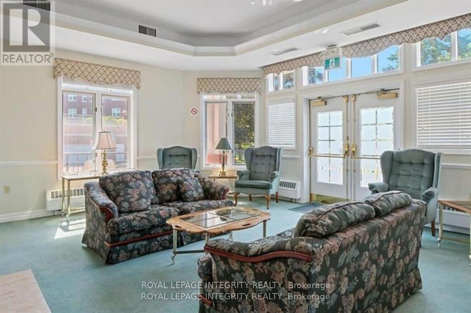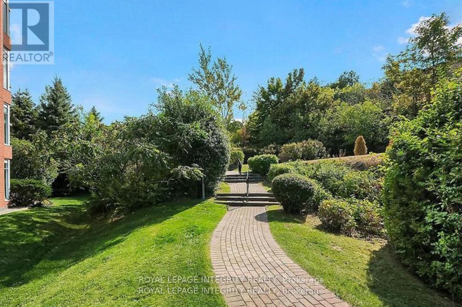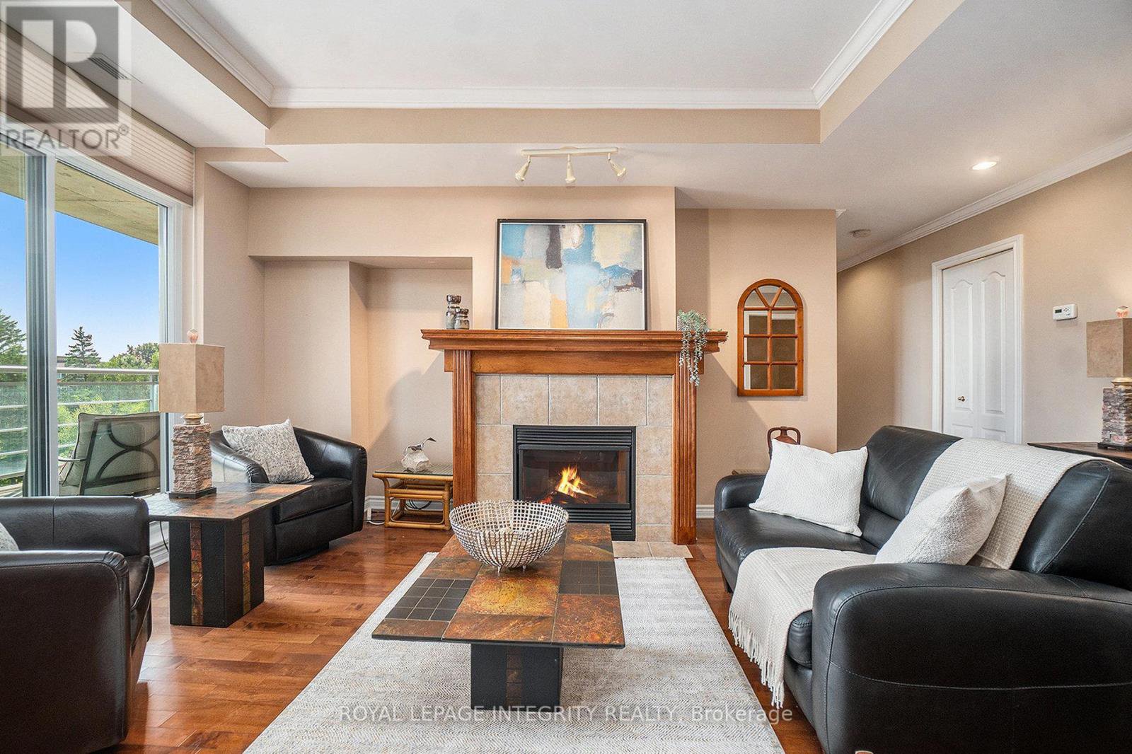 Experience the best of condo living at The Suites of Landmark, where this bright and spacious unit offers beautiful views and plenty of natural light. Thoughtfully designed and south-facing, this home offers incredible scenery in every season. It features 2 bedrooms, 2 full bathrooms, and a cozy sitting room/den with elegant French doors ideal for a home office, reading nook, or quiet retreat. The open-concept living and dining areas are enhanced by expansive picture windows, quality hardwood flooring, and a gas fireplace, creating a warm and inviting atmosphere. Step outside through triple patio doors to a large covered balcony, extending your living space outdoors for entertaining or simply relaxing with a view. The well-planned kitchen offers generous counter space and ample cabinetry. In-suite laundry adds effortless convenience to your daily routine. Residents enjoy an exceptional range of amenities: an indoor heated saltwater pool, fitness centre, workshop, party room with kitchen facilities, private library, sun room, and outdoor tennis court. Surrounded by landscaped gardens and steps from McCarthy Woods Trail, this community offers both tranquility and convenience, with shopping and public transit close at hand. Parking P31, locker conveniently located right near parking L20