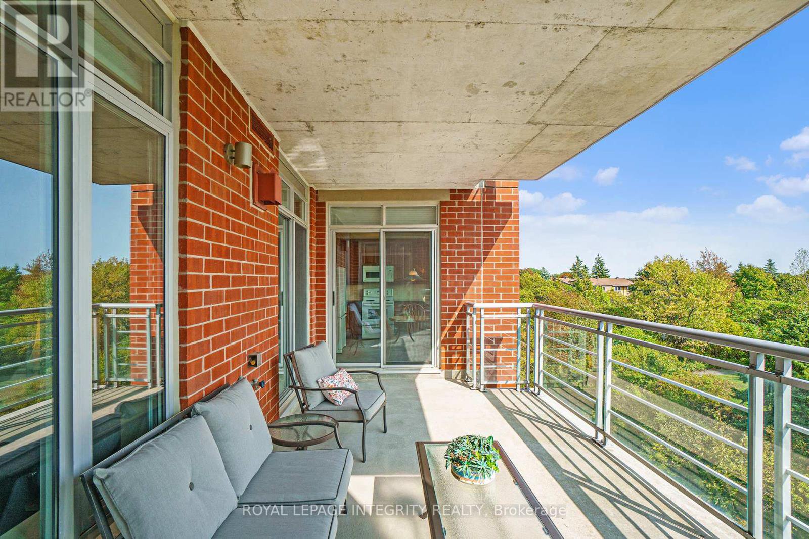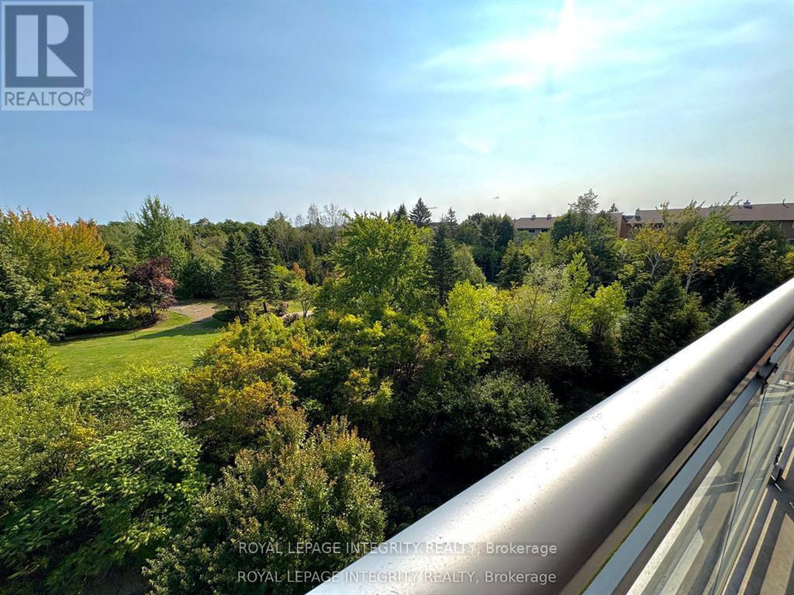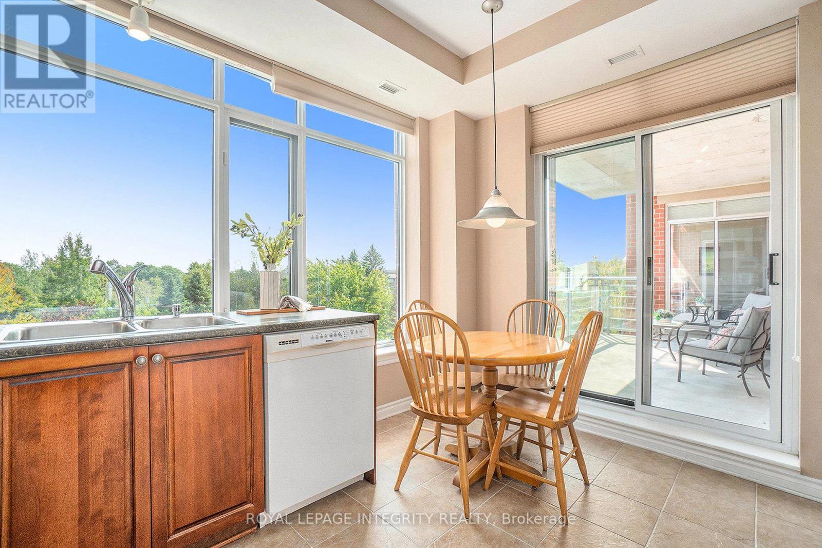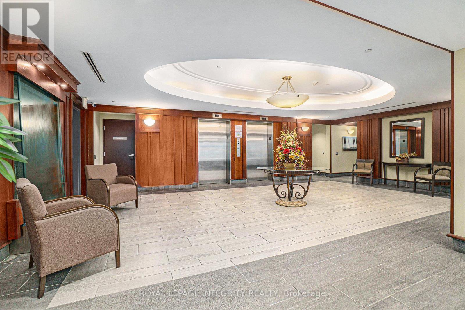 Experience the best of condo living at The Suites of Landmark, where this bright and spacious unit offers beautiful views and plenty of natural light. Thoughtfully designed and south-facing, this home offers incredible scenery in every season. It features 2 bedrooms, 2 full bathrooms, and a cozy sitting room/den with elegant French doors ideal for a home office, reading nook, or quiet retreat. The open-concept living and dining areas are enhanced by expansive picture windows, quality hardwood flooring, and a gas fireplace, creating a warm and inviting atmosphere. Step outside through triple patio doors to a large covered balcony, extending your living space outdoors for entertaining or simply relaxing with a view. The well-planned kitchen offers generous counter space and ample cabinetry. In-suite laundry adds effortless convenience to your daily routine. Residents enjoy an exceptional range of amenities: an indoor heated saltwater pool, fitness centre, workshop, party room with kitchen facilities, private library, sun room, and outdoor tennis court. Surrounded by landscaped gardens and steps from McCarthy Woods Trail, this community offers both tranquility and convenience, with shopping and public transit close at hand. Parking P31, locker conveniently located right near parking L20
