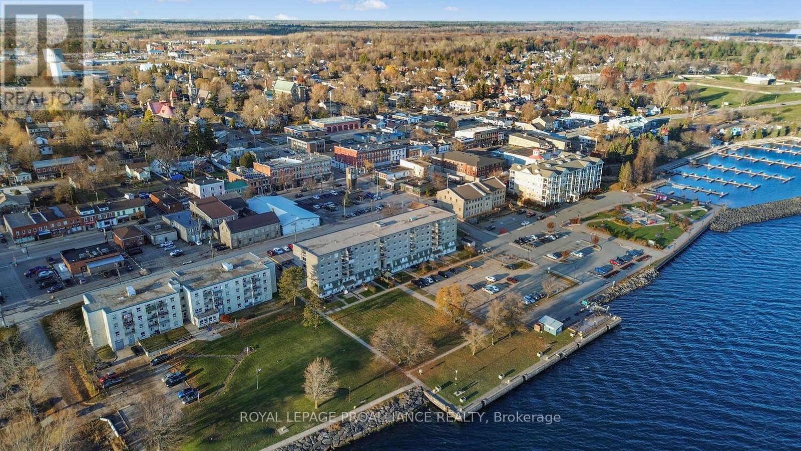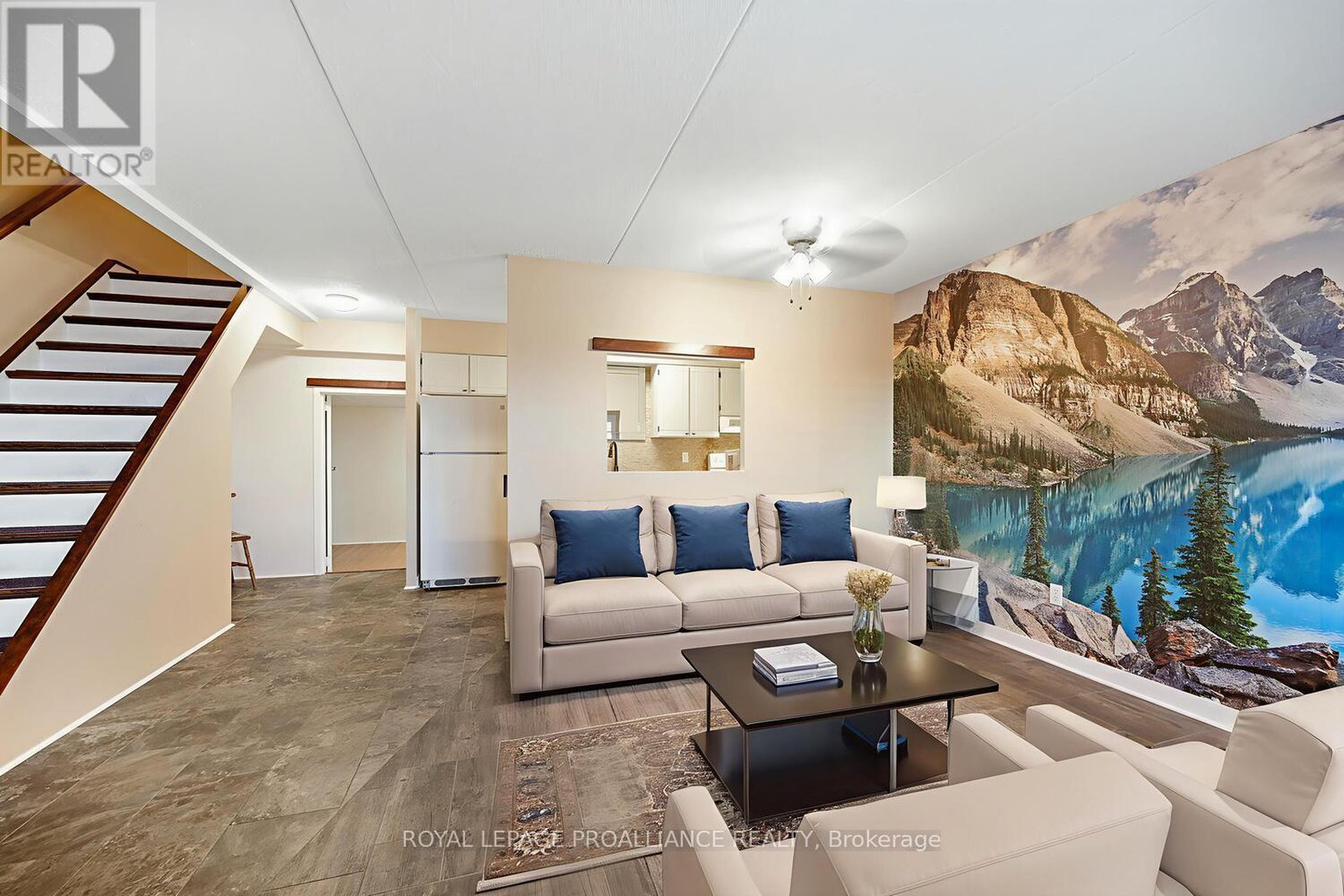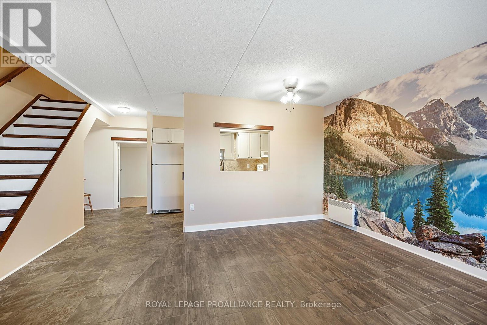 Imagine waking up each day to spectacular views of the majestic St. Lawrence River. A rare opportunity has become available in Prescott Place-a waterfront townhouse you simply won't find at this price again. This two-storey model offers approximately 820 sq. ft. of comfortable living space. The main level features a spacious living/dining area and a classic galley kitchen. Just beyond the kitchen is a bonus room that truly sets this unit apart. Unlike the apartment-style units, this space allows for in-suite laundry and even the option to add a 2-piece bathroom (with Condo approval and licensed trades). Unit 119 already includes its own washer and dryer. The entire lower level has been freshly repainted and is move-in ready.Upstairs, what was once two bedrooms has been opened into one large, bright primary suite. If a second bedroom is needed, a wall can easily be reinstalled. This level also includes a recently refreshed 4-piece bathroom. An assigned parking spot is directly outside your Unit. Step outside and you're just moments from the Sandra Lawn Marina, the Prescott Amphitheatre, and the scenic River Walk pathway. Enjoy quiet mornings watching ships glide along the St. Lawrence Seaway from one of the many waterfront benches. Recreation, leisure, and natural beauty are at your doorstep.Prescott's vibrant downtown-complete with shops, amenities, entertainment, and seasonal events-is just one street over. This is a lifestyle opportunity you won't want to miss. The special assessment will be fully paid by the Seller by December 1.Whether you're downsizing, beginning your real estate portfolio, or seeking a smart investment, this unit is an excellent choice. With quick access to Highways 401 and 416, commuting is simple and convenient. Prescott Place is also undergoing exciting updates-now is the perfect time to buy while it's still affordable.