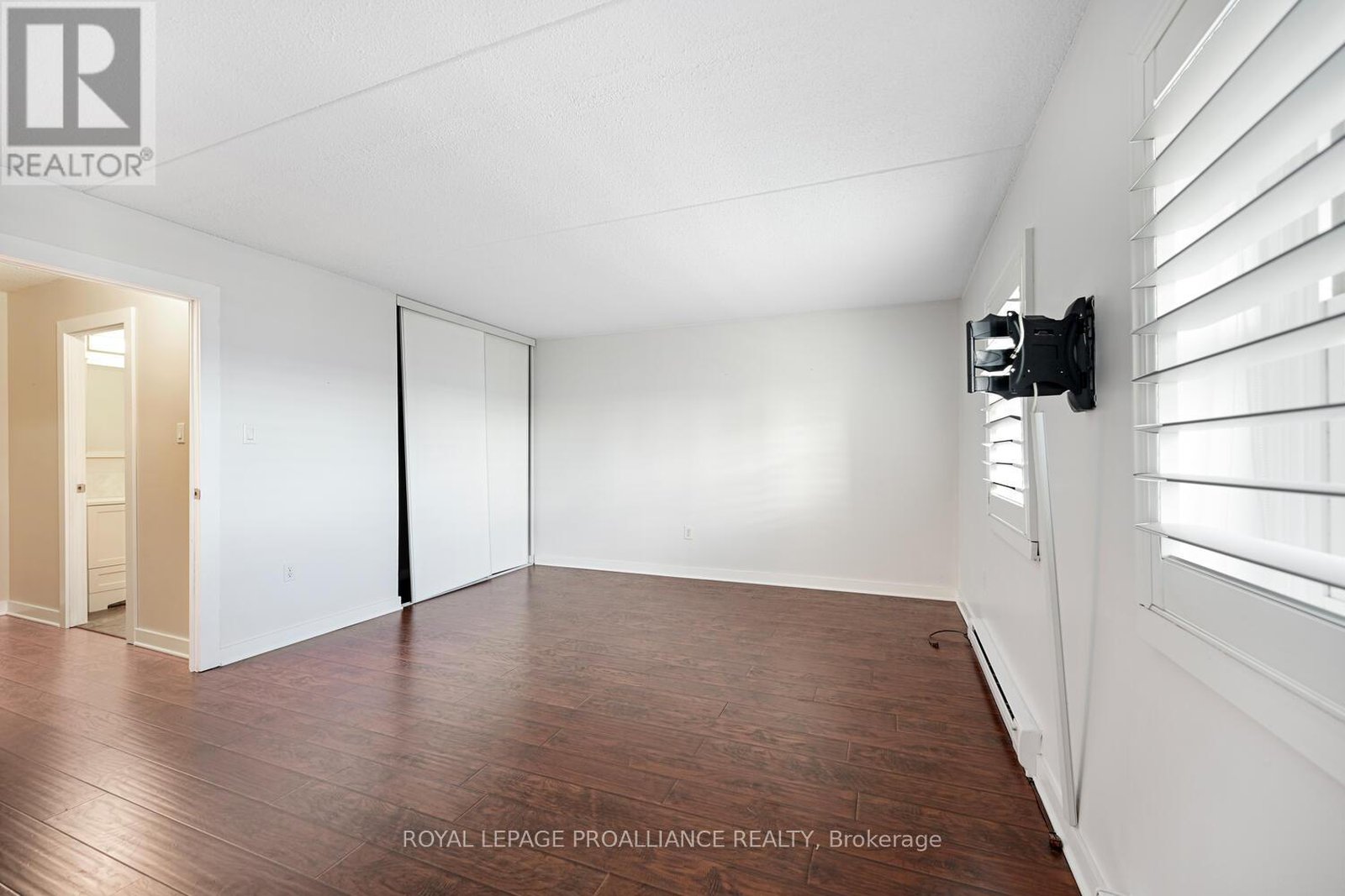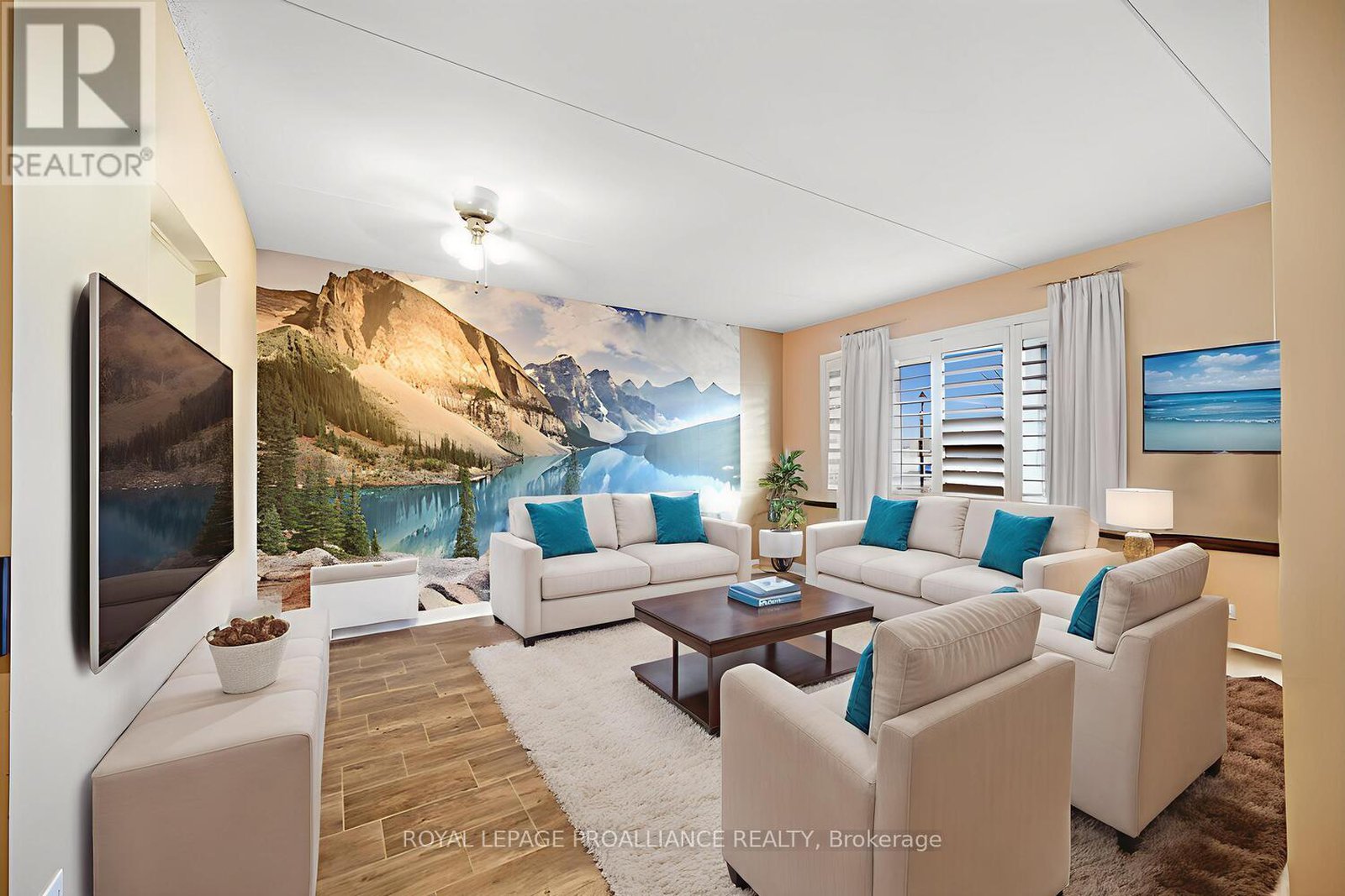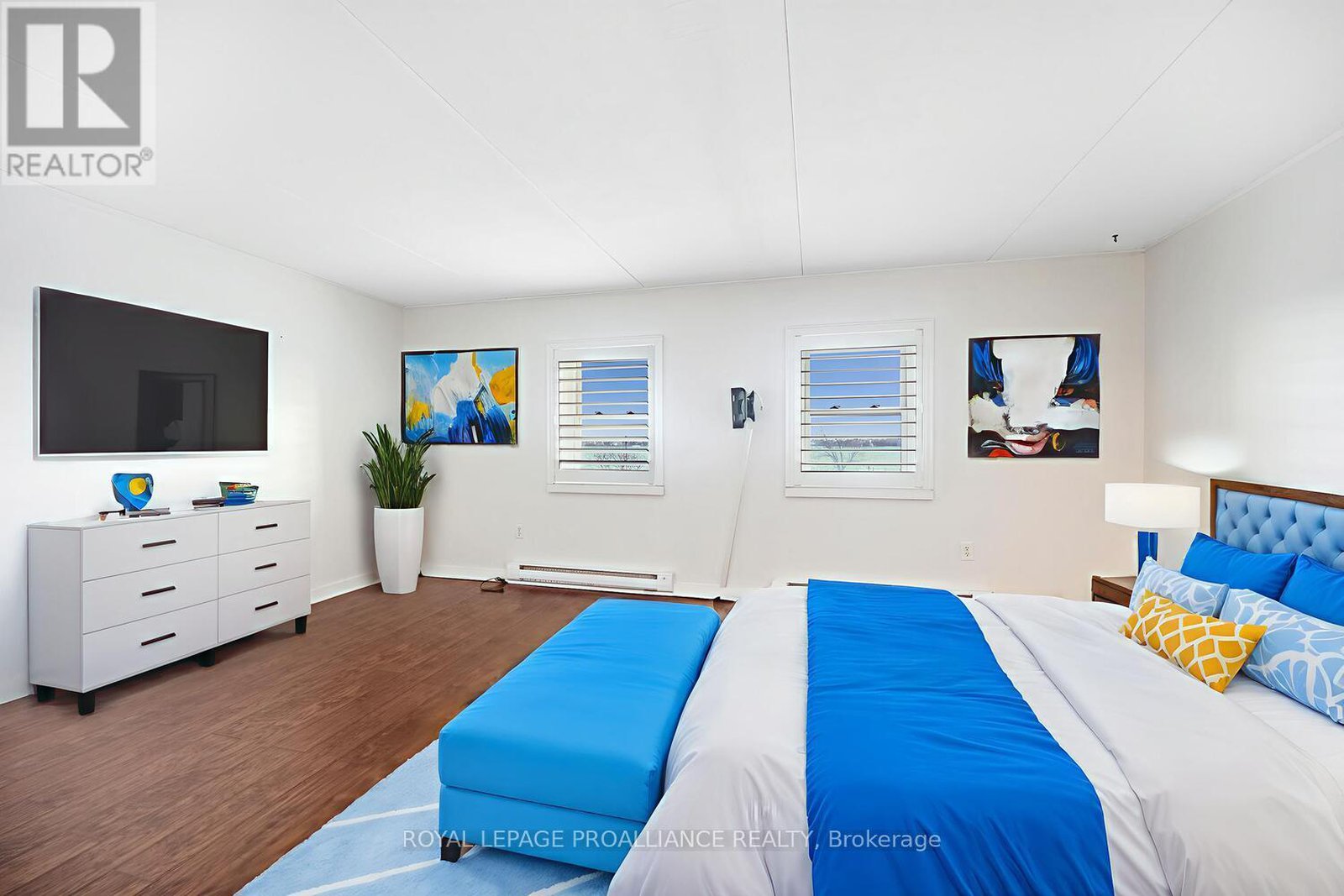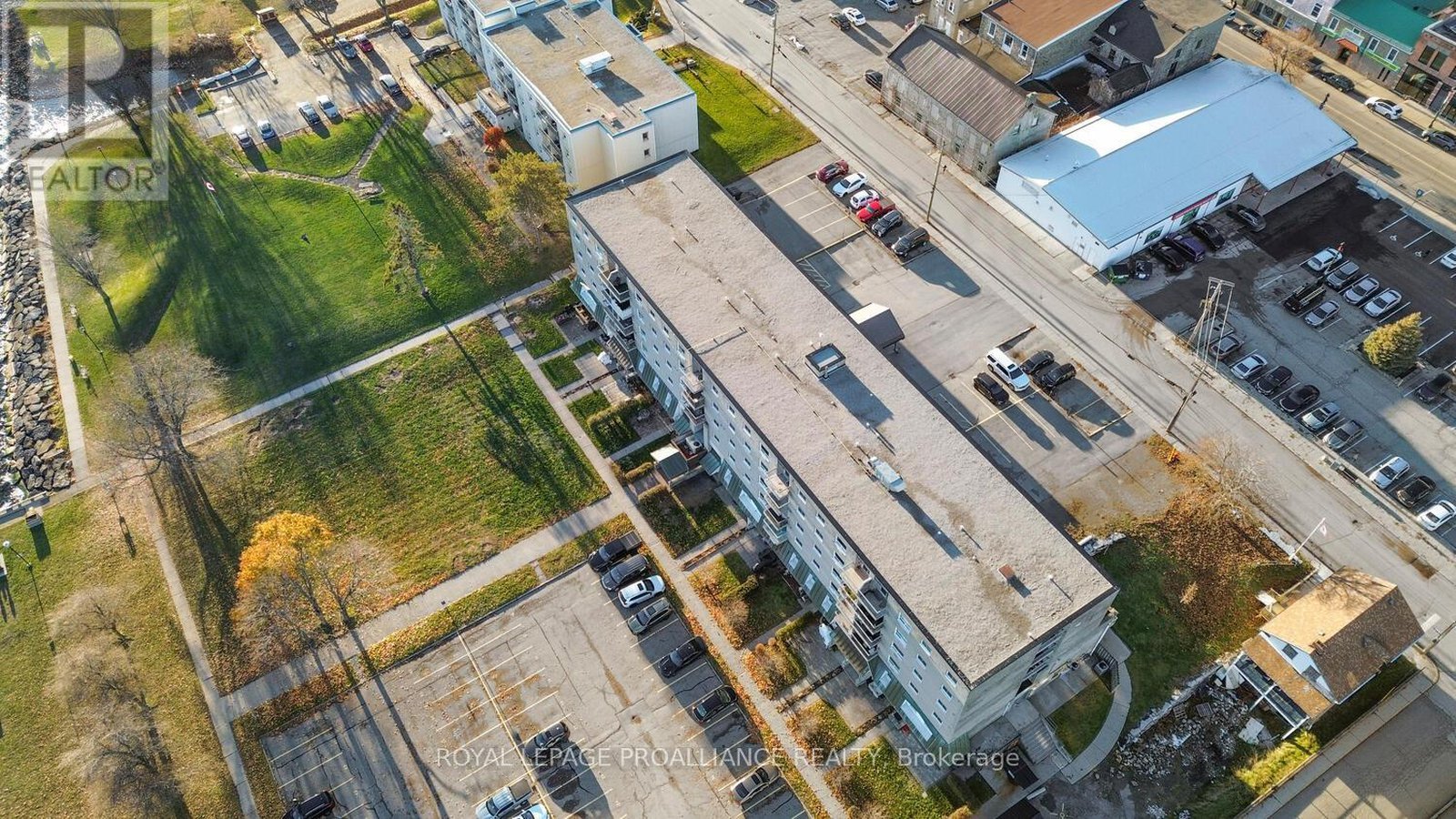 Imagine waking up each day to spectacular views of the majestic St. Lawrence River. A rare opportunity has become available in Prescott Place-a waterfront townhouse you simply won't find at this price again. This two-storey model offers approximately 820 sq. ft. of comfortable living space. The main level features a spacious living/dining area and a classic galley kitchen. Just beyond the kitchen is a bonus room that truly sets this unit apart. Unlike the apartment-style units, this space allows for in-suite laundry and even the option to add a 2-piece bathroom (with Condo approval and licensed trades). Unit 119 already includes its own washer and dryer. The entire lower level has been freshly repainted and is move-in ready.Upstairs, what was once two bedrooms has been opened into one large, bright primary suite. If a second bedroom is needed, a wall can easily be reinstalled. This level also includes a recently refreshed 4-piece bathroom. An assigned parking spot is directly outside your Unit. Step outside and you're just moments from the Sandra Lawn Marina, the Prescott Amphitheatre, and the scenic River Walk pathway. Enjoy quiet mornings watching ships glide along the St. Lawrence Seaway from one of the many waterfront benches. Recreation, leisure, and natural beauty are at your doorstep.Prescott's vibrant downtown-complete with shops, amenities, entertainment, and seasonal events-is just one street over. This is a lifestyle opportunity you won't want to miss. The special assessment will be fully paid by the Seller by December 1.Whether you're downsizing, beginning your real estate portfolio, or seeking a smart investment, this unit is an excellent choice. With quick access to Highways 401 and 416, commuting is simple and convenient. Prescott Place is also undergoing exciting updates-now is the perfect time to buy while it's still affordable.