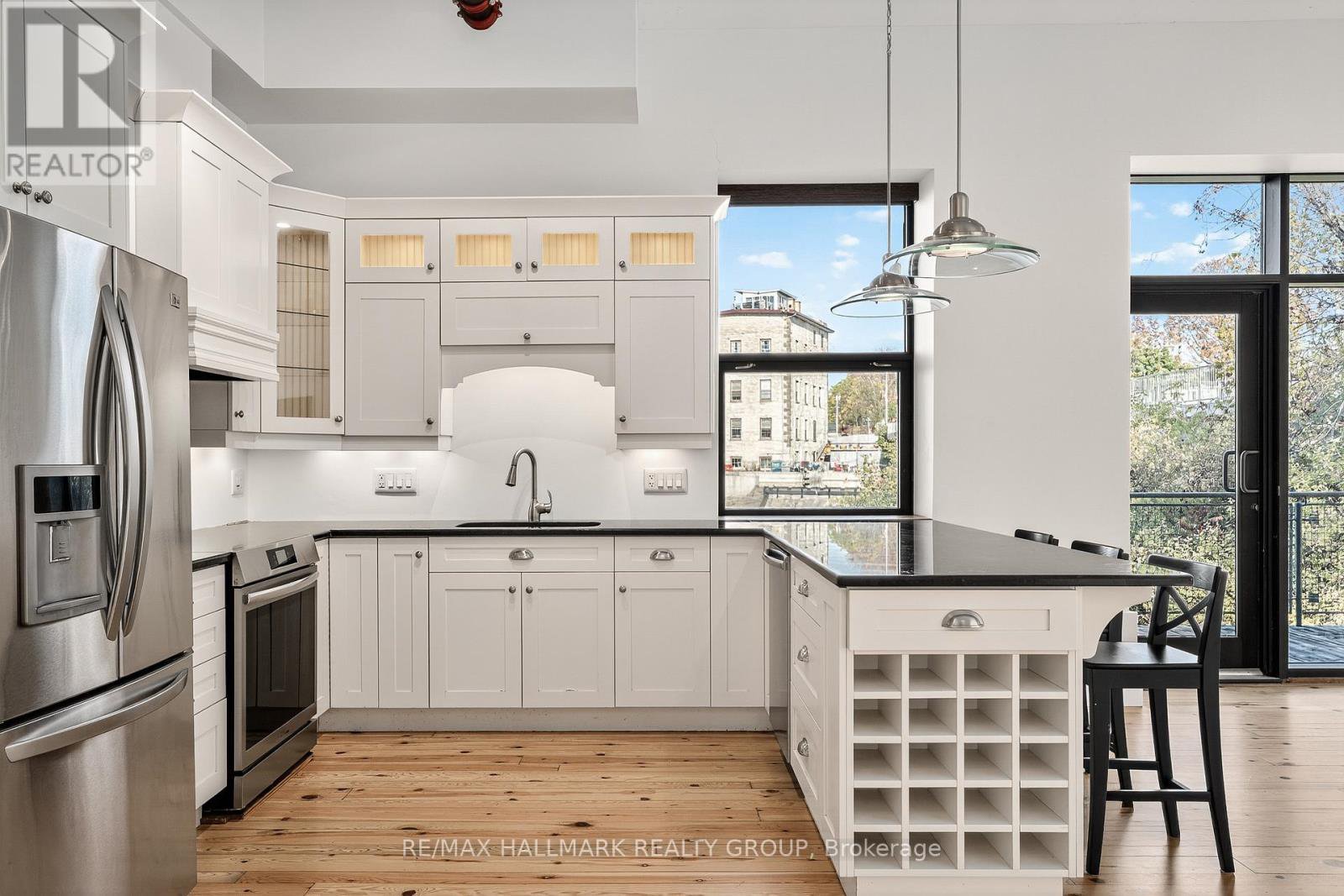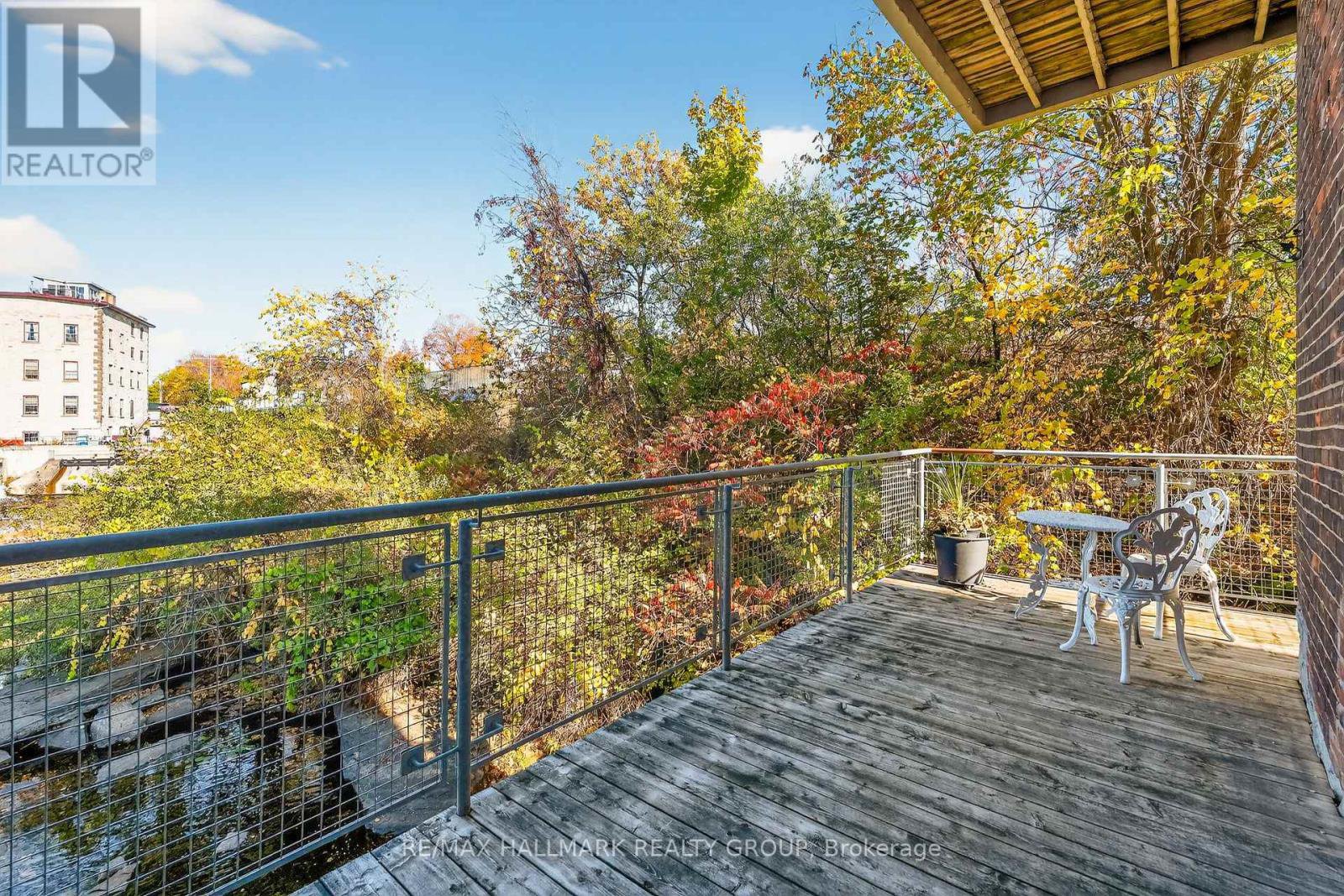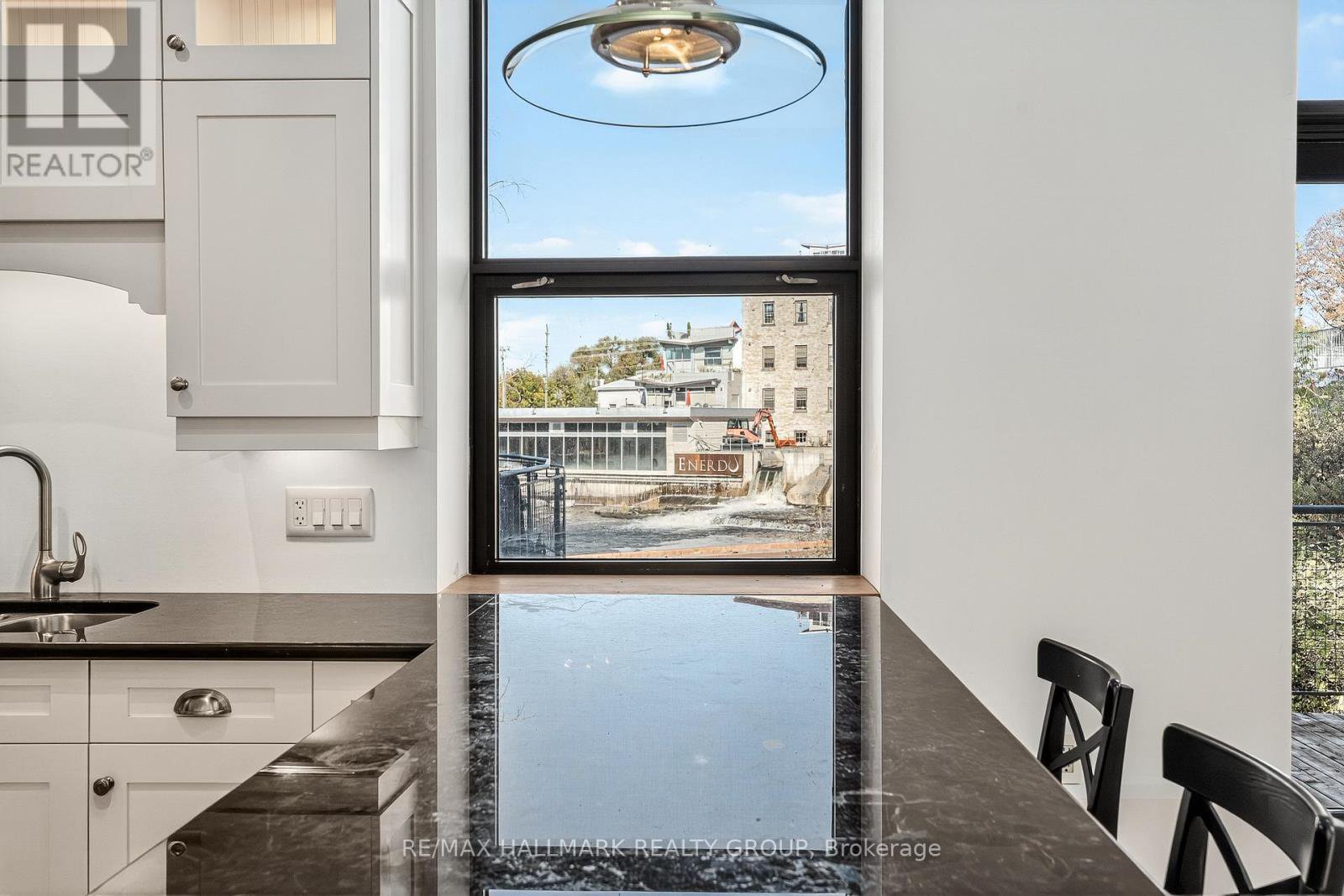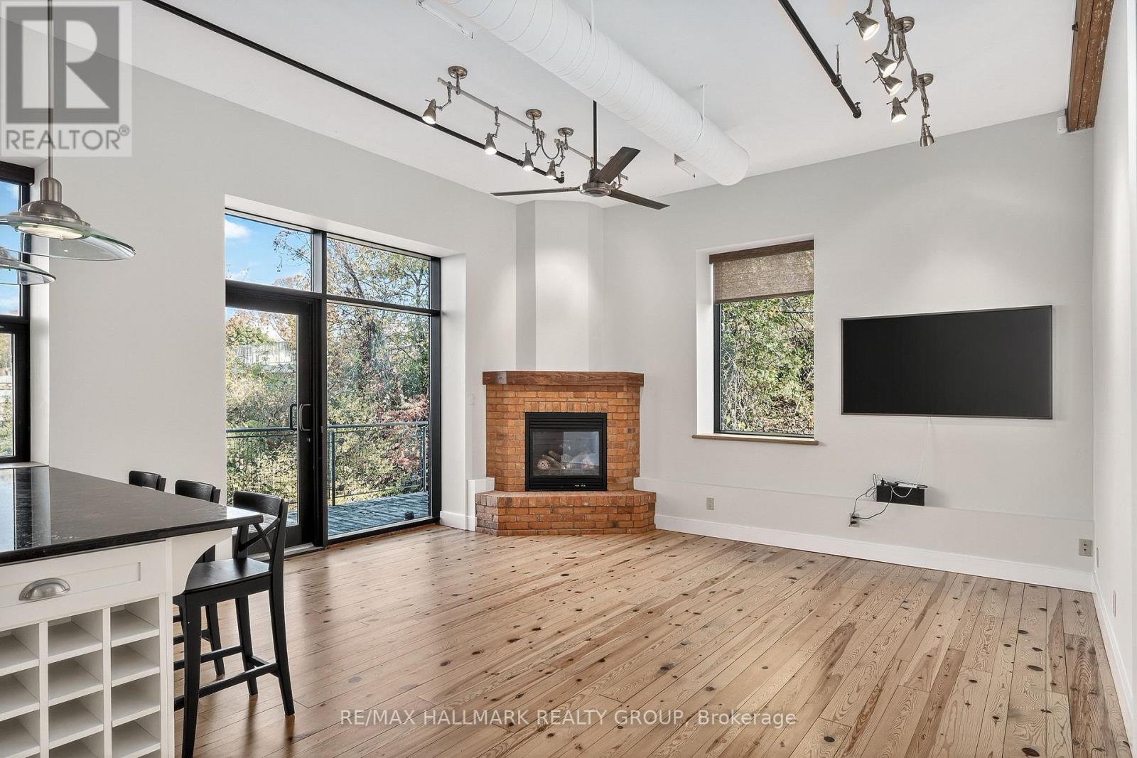 ONE OF A KIND CONDO overlooking the Mississippi River in the heart of Almonte! Welcome to Thornburn Mill, a historic and highly sought-after building that blends timeless character with modern comfort. This stunning 1 bedroom, 2 bathroom corner unit offers 1,177 sq. ft. of beautifully renovated living space featuring soaring high ceilings, natural rustic hardwood floors, and an abundance of natural light throughout. Step inside to a bright, welcoming entrance leading to the primary bedroom, complete with a custom walk-in closet and a luxurious 5-piece ensuite showcasing double sinks with granite counters, a glass shower, a deep soaker tub, and in-suite laundry. The grand hallway leads to a wall full of convenient storage, perfect for keeping everything organized, as well as a stylish powder room ideal for guests. The open concept living area is perfect for both entertaining and everyday living. A custom kitchen features newer stainless steel appliances, granite countertops, custom cabinetry, under-cabinet lighting, and a sit-up counter. The spacious living room centers around a cozy fireplace and large windows with breathtaking river views. The extra living space is generous and versatile, easily spacious enough for a dining room & a home office, den, or a future guest space. Step onto your private wraparound balcony, a rare feature that provides privacy and stunning views of the river and surrounding greenery, perfect for relaxing or entertaining. Additional highlights include one conveniently located parking spot, a large storage locker, and a pet-friendly, smoke-free building that radiates charm and tranquility. Located just steps from Almonte's vibrant downtown, you'll enjoy easy access to shops, restaurants, cafés, scenic walking trails, and the town's historic beauty. This exceptional condo combines heritage character with modern finishes, offering a truly unique living experience.