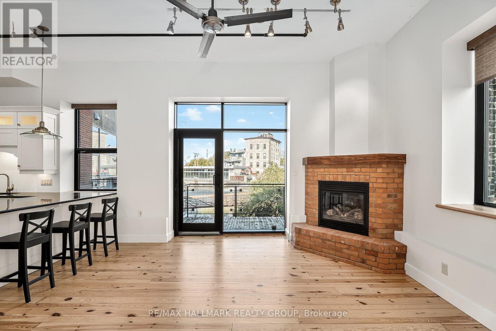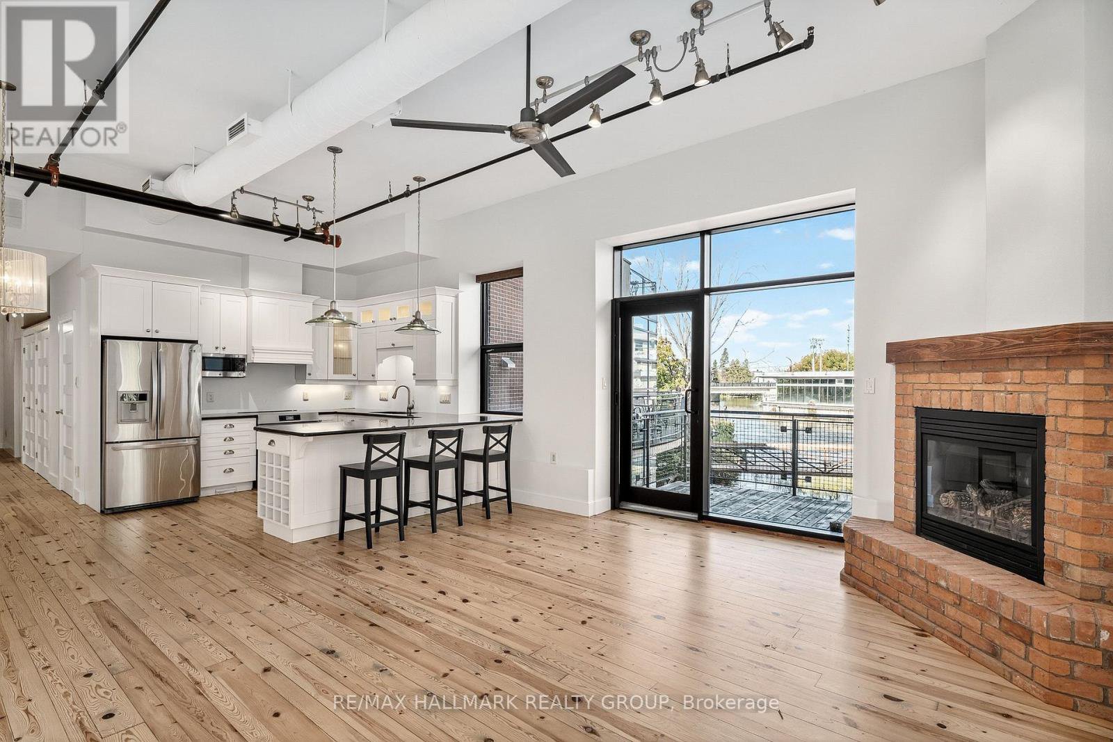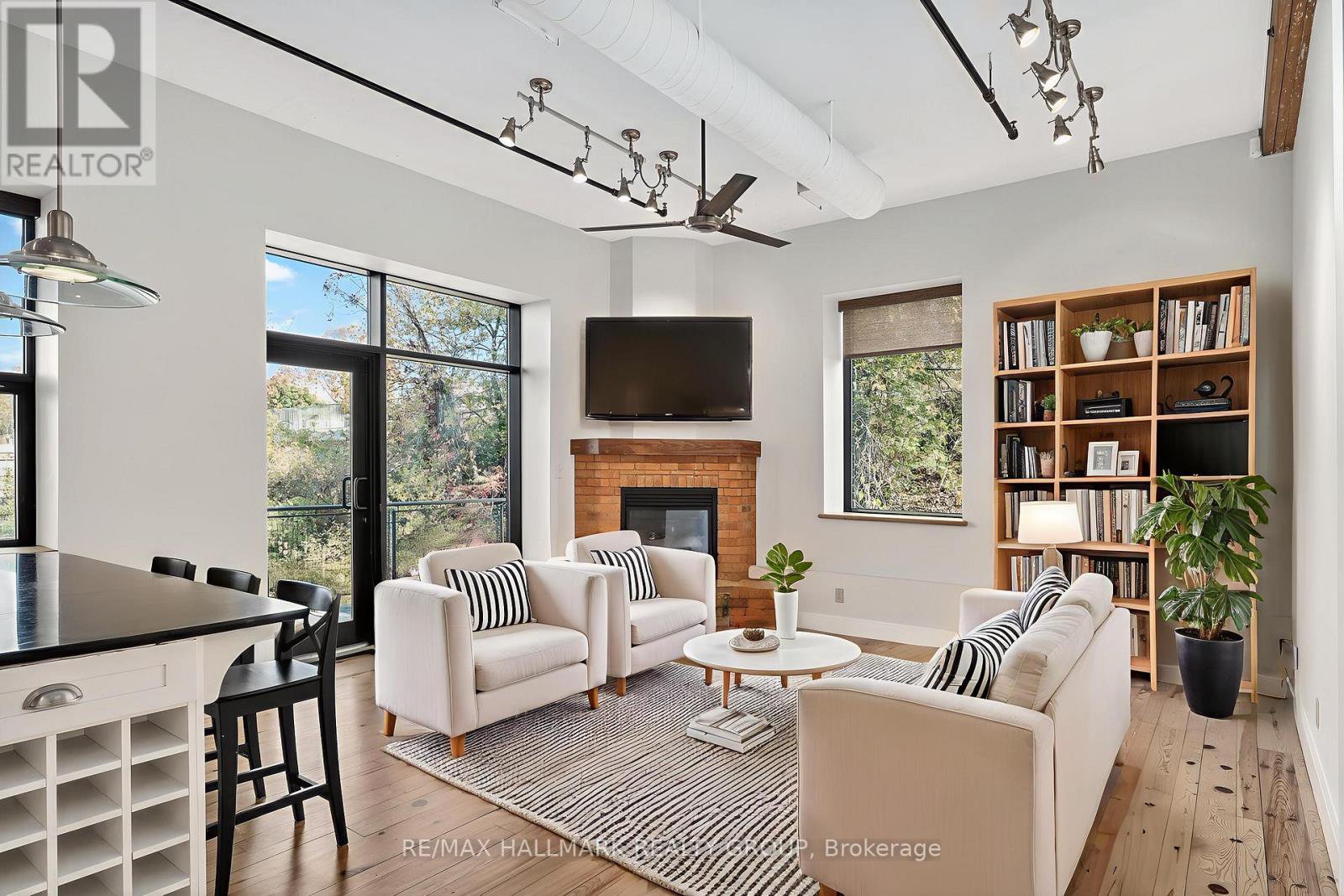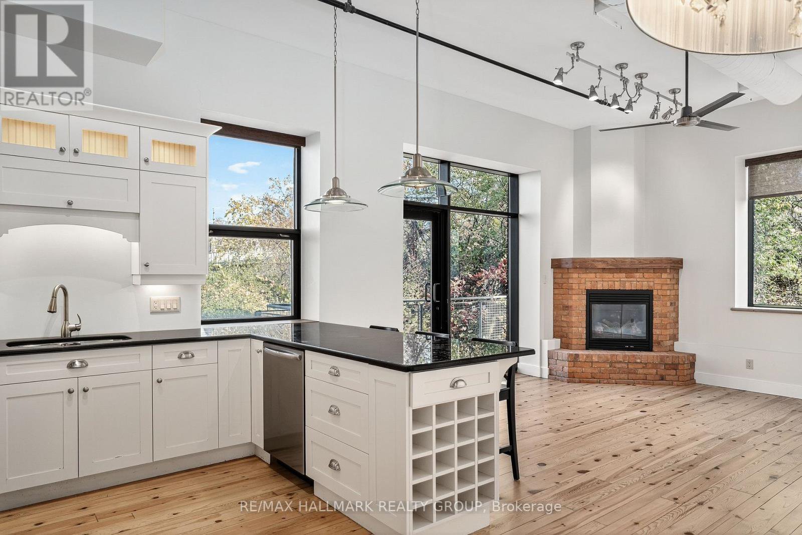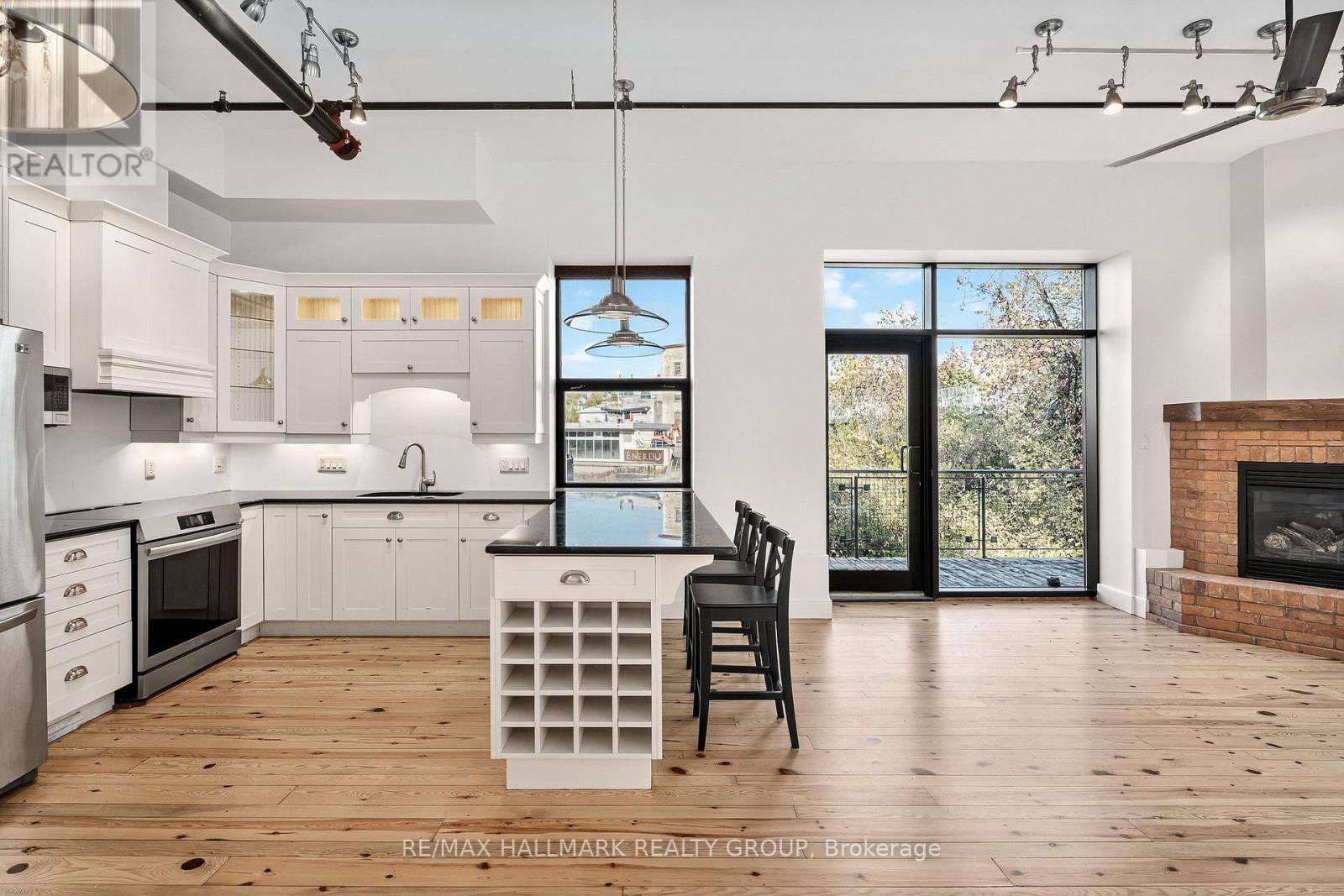 ONE OF A KIND CONDO overlooking the Mississippi River in the heart of Almonte! Welcome to Thornburn Mill, a historic and highly sought-after building that blends timeless character with modern comfort. This stunning 1 bedroom, 2 bathroom corner unit offers 1,177 sq. ft. of beautifully renovated living space featuring soaring high ceilings, natural rustic hardwood floors, and an abundance of natural light throughout. Step inside to a bright, welcoming entrance leading to the primary bedroom, complete with a custom walk-in closet and a luxurious 5-piece ensuite showcasing double sinks with granite counters, a glass shower, a deep soaker tub, and in-suite laundry. The grand hallway leads to a wall full of convenient storage, perfect for keeping everything organized, as well as a stylish powder room ideal for guests. The open concept living area is perfect for both entertaining and everyday living. A custom kitchen features newer stainless steel appliances, granite countertops, custom cabinetry, under-cabinet lighting, and a sit-up counter. The spacious living room centers around a cozy fireplace and large windows with breathtaking river views. The extra living space is generous and versatile, easily spacious enough for a dining room & a home office, den, or a future guest space. Step onto your private wraparound balcony, a rare feature that provides privacy and stunning views of the river and surrounding greenery, perfect for relaxing or entertaining. Additional highlights include one conveniently located parking spot, a large storage locker, and a pet-friendly, smoke-free building that radiates charm and tranquility. Located just steps from Almonte's vibrant downtown, you'll enjoy easy access to shops, restaurants, cafés, scenic walking trails, and the town's historic beauty. This exceptional condo combines heritage character with modern finishes, offering a truly unique living experience.