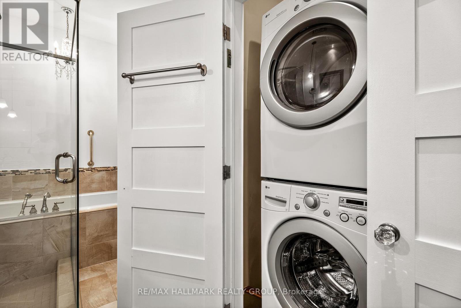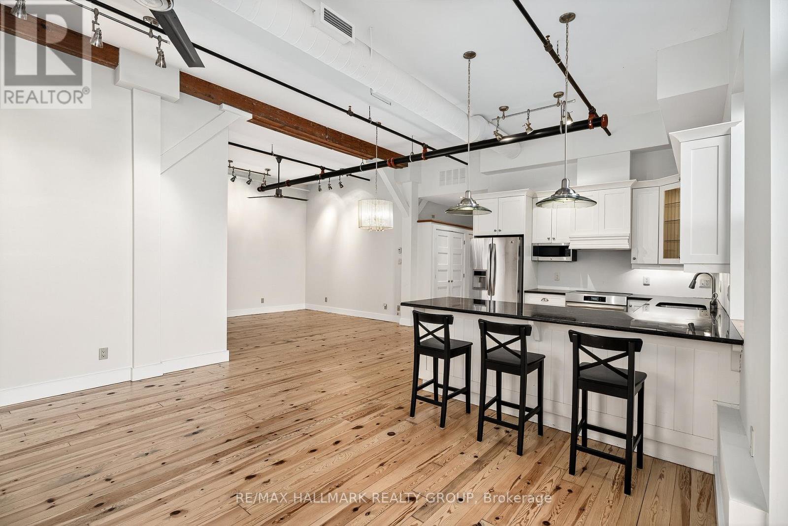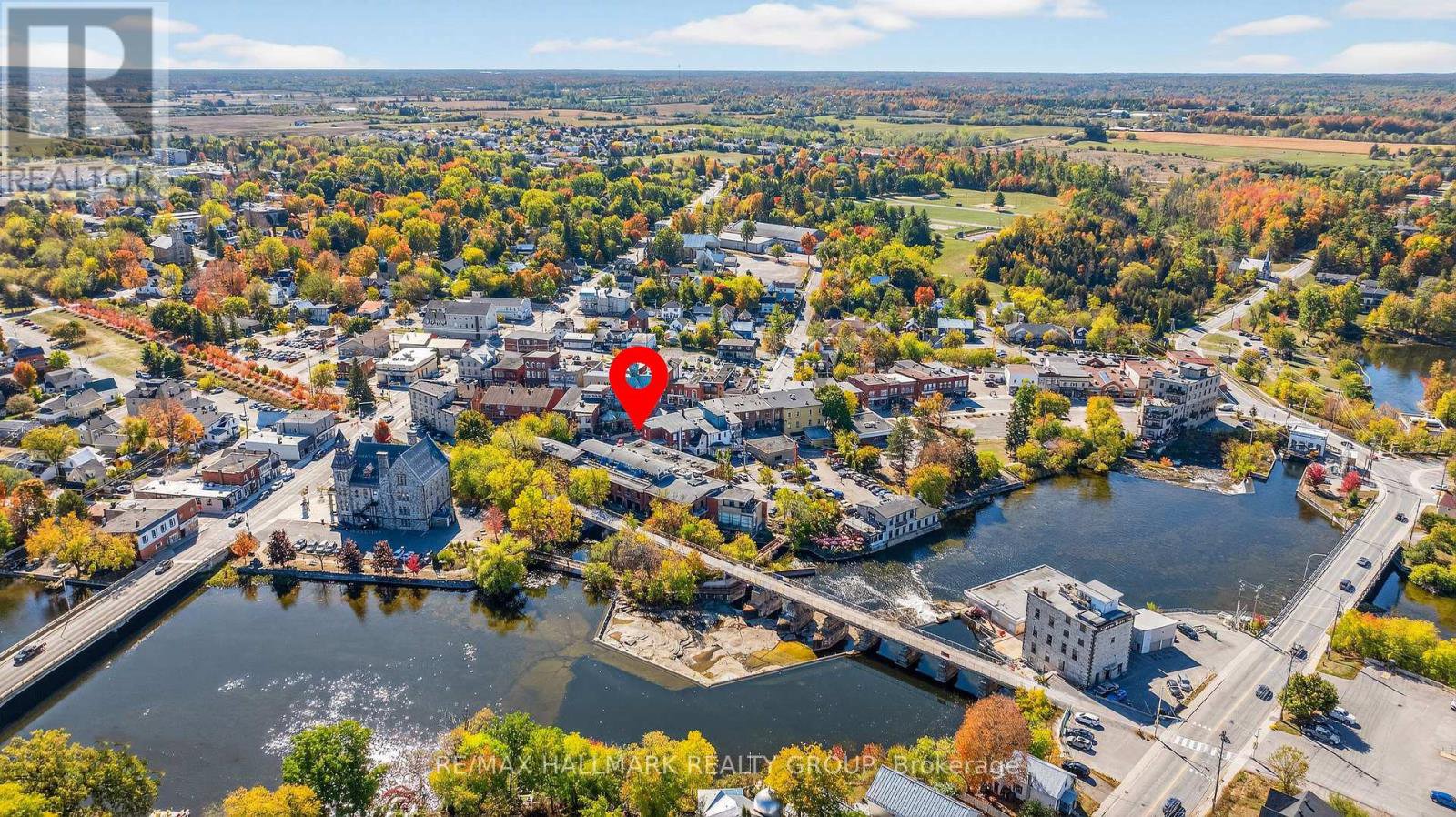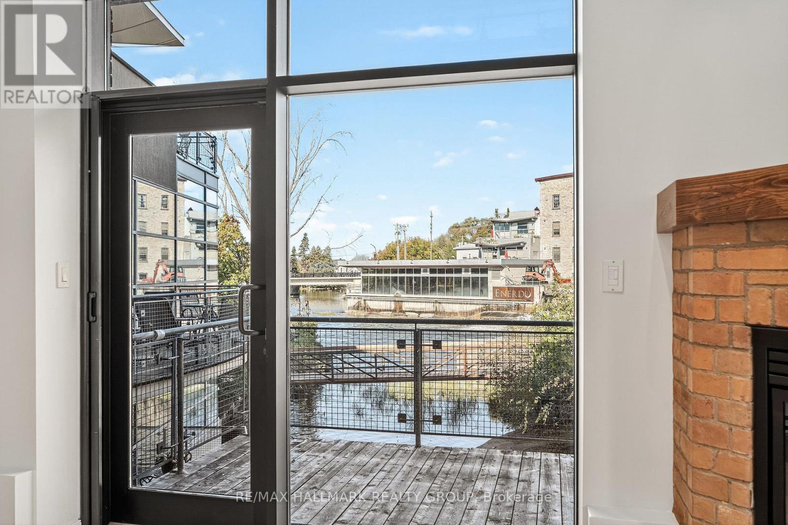 ONE OF A KIND CONDO overlooking the Mississippi River in the heart of Almonte! Welcome to Thornburn Mill, a historic and highly sought-after building that blends timeless character with modern comfort. This stunning 1 bedroom, 2 bathroom corner unit offers 1,177 sq. ft. of beautifully renovated living space featuring soaring high ceilings, natural rustic hardwood floors, and an abundance of natural light throughout. Step inside to a bright, welcoming entrance leading to the primary bedroom, complete with a custom walk-in closet and a luxurious 5-piece ensuite showcasing double sinks with granite counters, a glass shower, a deep soaker tub, and in-suite laundry. The grand hallway leads to a wall full of convenient storage, perfect for keeping everything organized, as well as a stylish powder room ideal for guests. The open concept living area is perfect for both entertaining and everyday living. A custom kitchen features newer stainless steel appliances, granite countertops, custom cabinetry, under-cabinet lighting, and a sit-up counter. The spacious living room centers around a cozy fireplace and large windows with breathtaking river views. The extra living space is generous and versatile, easily spacious enough for a dining room & a home office, den, or a future guest space. Step onto your private wraparound balcony, a rare feature that provides privacy and stunning views of the river and surrounding greenery, perfect for relaxing or entertaining. Additional highlights include one conveniently located parking spot, a large storage locker, and a pet-friendly, smoke-free building that radiates charm and tranquility. Located just steps from Almonte's vibrant downtown, you'll enjoy easy access to shops, restaurants, cafés, scenic walking trails, and the town's historic beauty. This exceptional condo combines heritage character with modern finishes, offering a truly unique living experience.