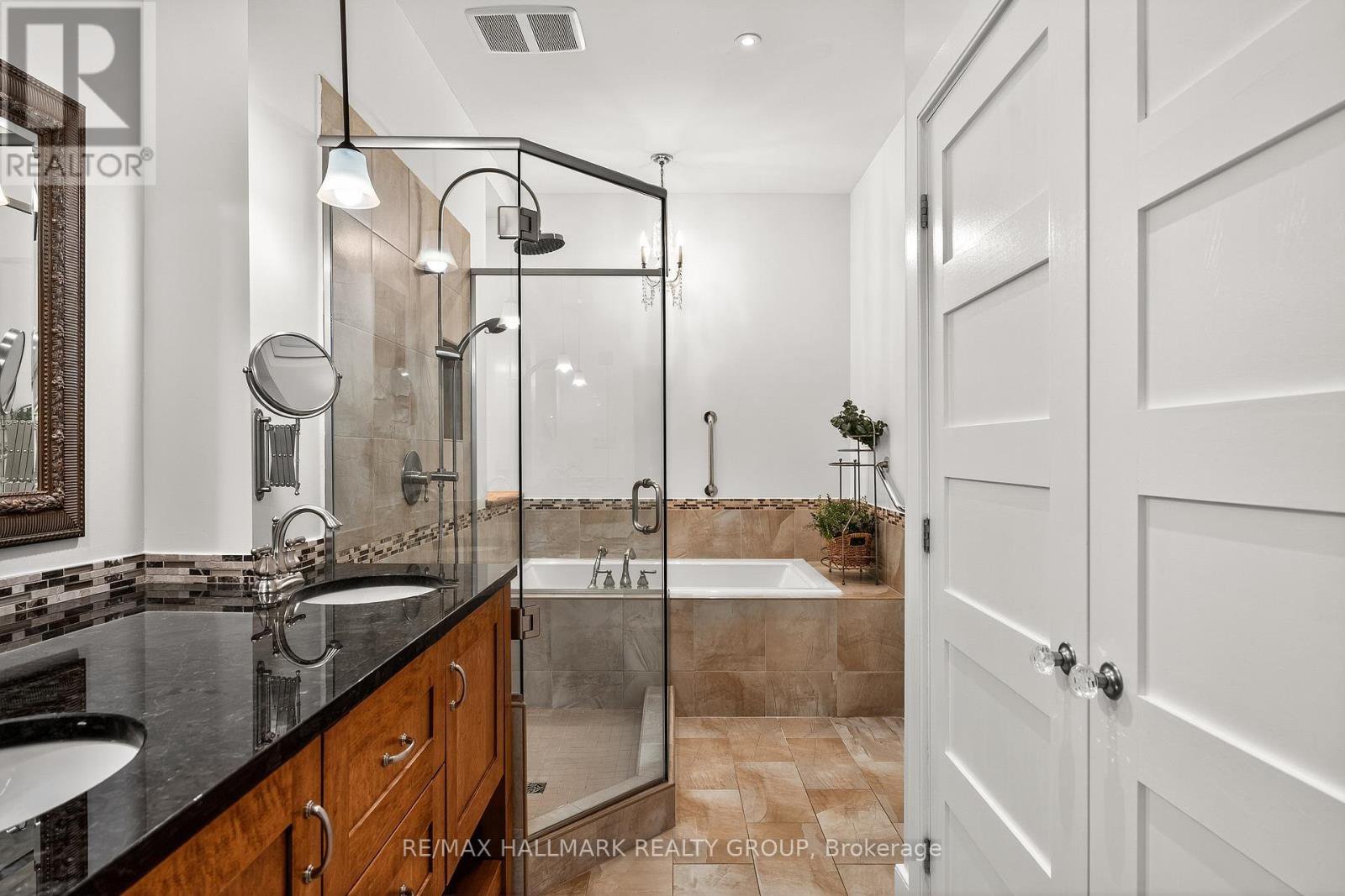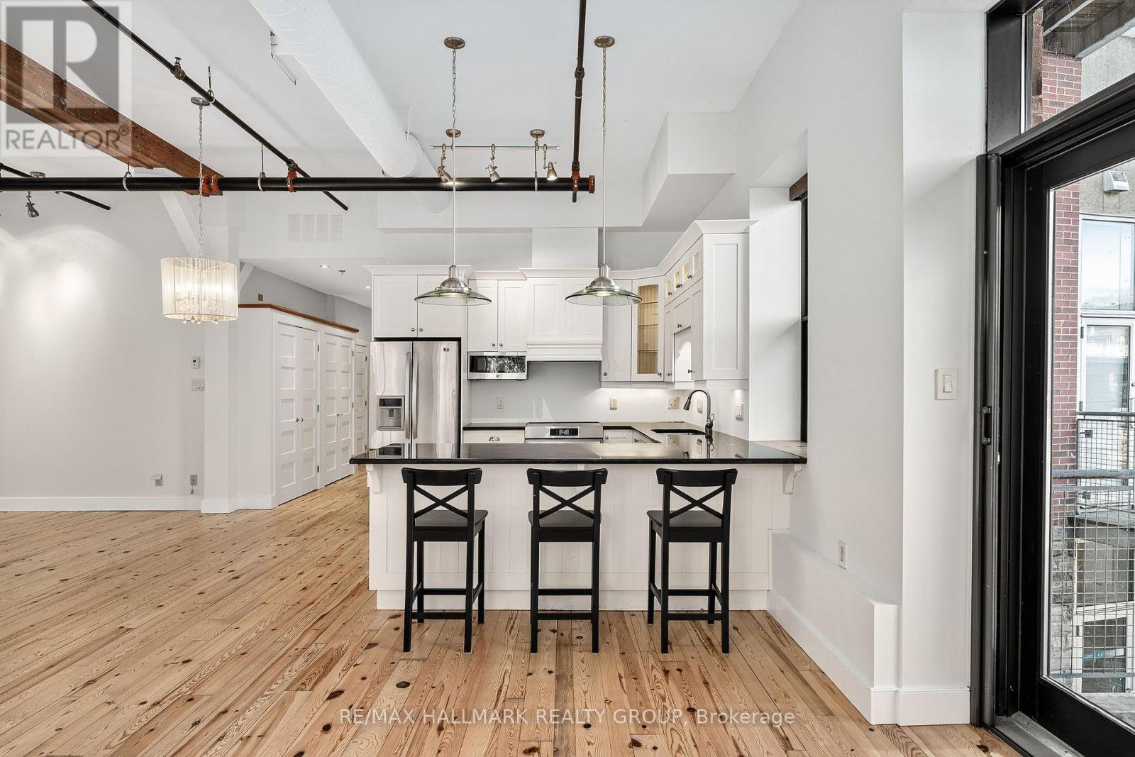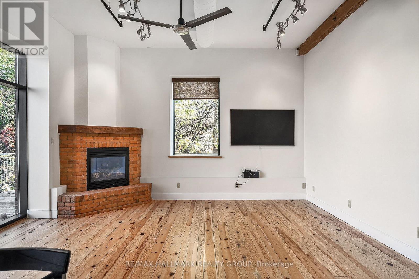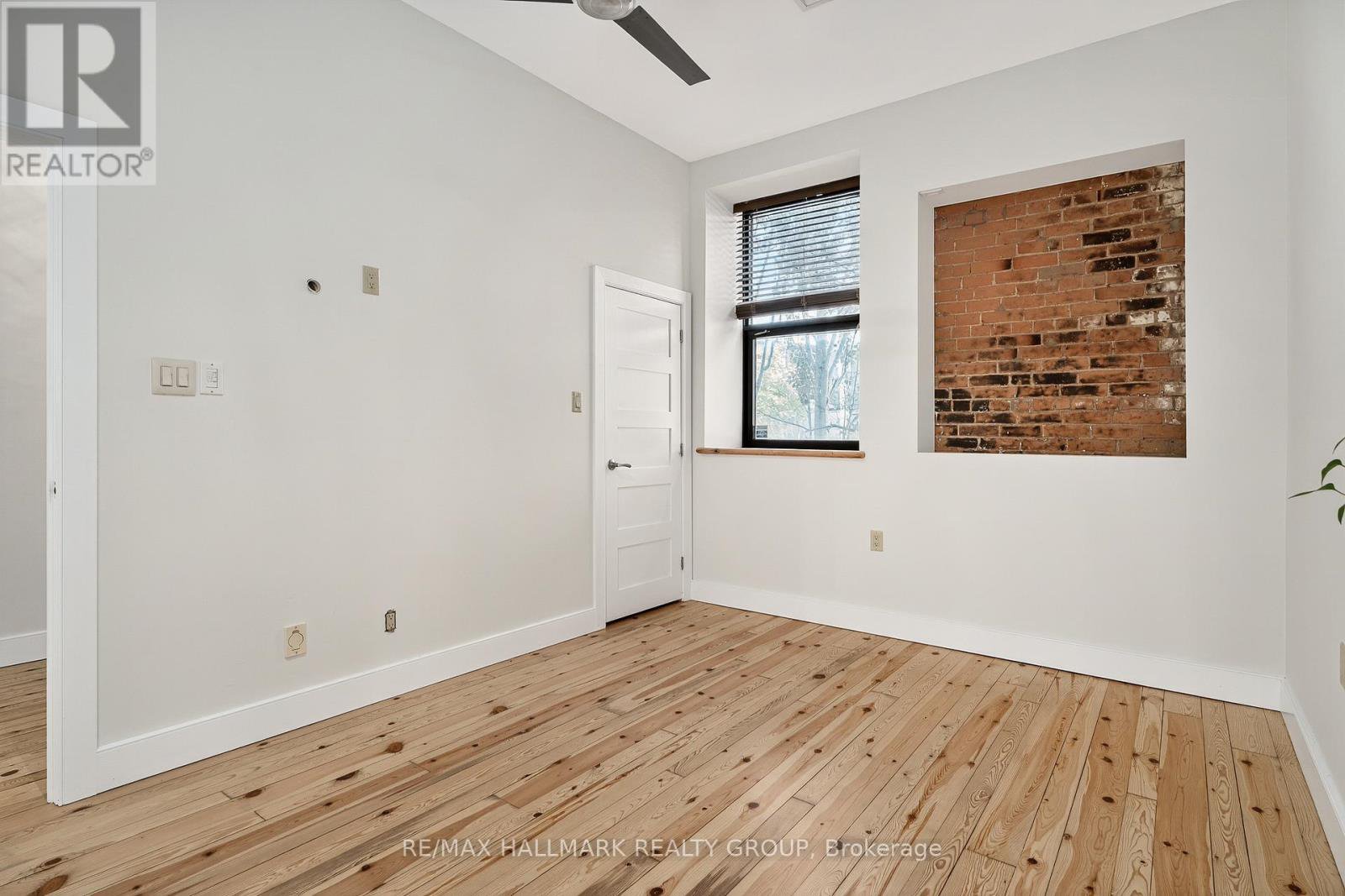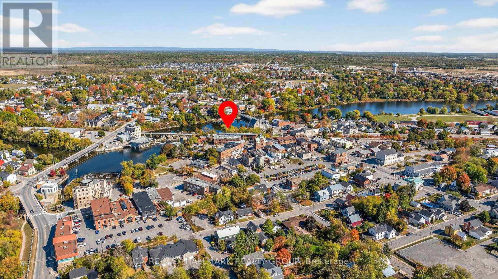 ONE OF A KIND CONDO overlooking the Mississippi River in the heart of Almonte! Welcome to Thornburn Mill, a historic and highly sought-after building that blends timeless character with modern comfort. This stunning 1 bedroom, 2 bathroom corner unit offers 1,177 sq. ft. of beautifully renovated living space featuring soaring high ceilings, natural rustic hardwood floors, and an abundance of natural light throughout. Step inside to a bright, welcoming entrance leading to the primary bedroom, complete with a custom walk-in closet and a luxurious 5-piece ensuite showcasing double sinks with granite counters, a glass shower, a deep soaker tub, and in-suite laundry. The grand hallway leads to a wall full of convenient storage, perfect for keeping everything organized, as well as a stylish powder room ideal for guests. The open concept living area is perfect for both entertaining and everyday living. A custom kitchen features newer stainless steel appliances, granite countertops, custom cabinetry, under-cabinet lighting, and a sit-up counter. The spacious living room centers around a cozy fireplace and large windows with breathtaking river views. The extra living space is generous and versatile, easily spacious enough for a dining room & a home office, den, or a future guest space. Step onto your private wraparound balcony, a rare feature that provides privacy and stunning views of the river and surrounding greenery, perfect for relaxing or entertaining. Additional highlights include one conveniently located parking spot, a large storage locker, and a pet-friendly, smoke-free building that radiates charm and tranquility. Located just steps from Almonte's vibrant downtown, you'll enjoy easy access to shops, restaurants, cafés, scenic walking trails, and the town's historic beauty. This exceptional condo combines heritage character with modern finishes, offering a truly unique living experience.