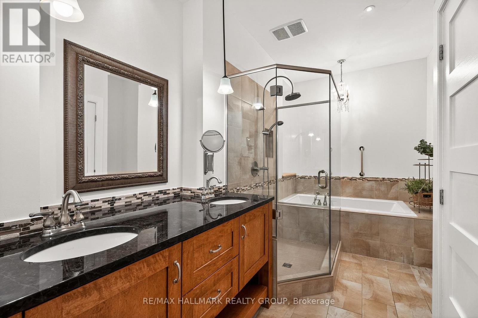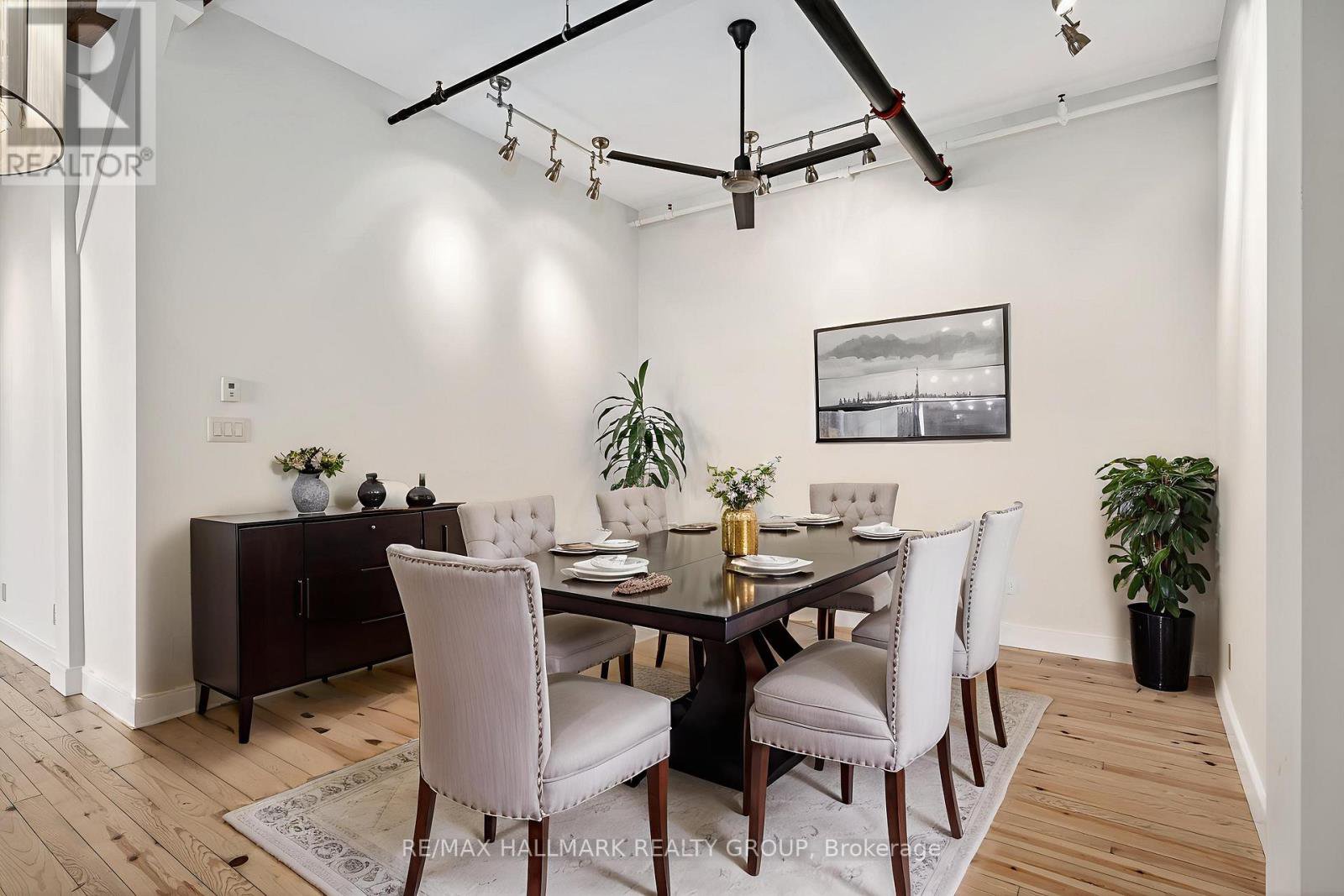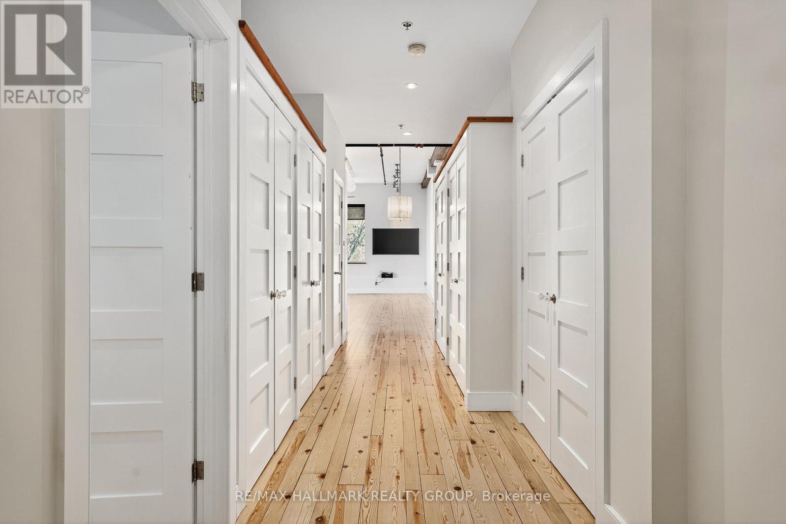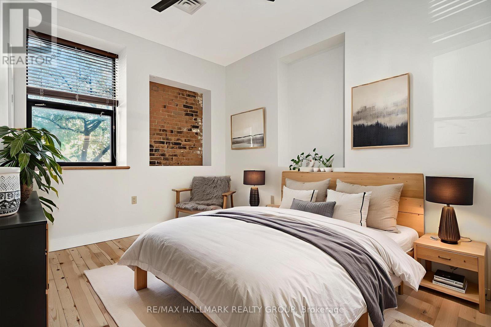 ONE OF A KIND CONDO overlooking the Mississippi River in the heart of Almonte! Welcome to Thornburn Mill, a historic and highly sought-after building that blends timeless character with modern comfort. This stunning 1 bedroom, 2 bathroom corner unit offers 1,177 sq. ft. of beautifully renovated living space featuring soaring high ceilings, natural rustic hardwood floors, and an abundance of natural light throughout. Step inside to a bright, welcoming entrance leading to the primary bedroom, complete with a custom walk-in closet and a luxurious 5-piece ensuite showcasing double sinks with granite counters, a glass shower, a deep soaker tub, and in-suite laundry. The grand hallway leads to a wall full of convenient storage, perfect for keeping everything organized, as well as a stylish powder room ideal for guests. The open concept living area is perfect for both entertaining and everyday living. A custom kitchen features newer stainless steel appliances, granite countertops, custom cabinetry, under-cabinet lighting, and a sit-up counter. The spacious living room centers around a cozy fireplace and large windows with breathtaking river views. The extra living space is generous and versatile, easily spacious enough for a dining room & a home office, den, or a future guest space. Step onto your private wraparound balcony, a rare feature that provides privacy and stunning views of the river and surrounding greenery, perfect for relaxing or entertaining. Additional highlights include one conveniently located parking spot, a large storage locker, and a pet-friendly, smoke-free building that radiates charm and tranquility. Located just steps from Almonte's vibrant downtown, you'll enjoy easy access to shops, restaurants, cafés, scenic walking trails, and the town's historic beauty. This exceptional condo combines heritage character with modern finishes, offering a truly unique living experience.