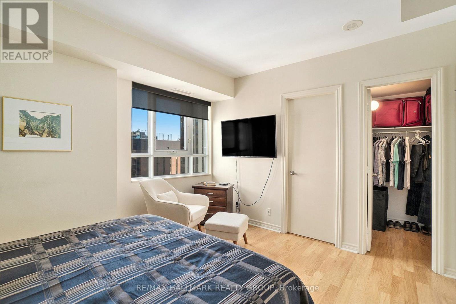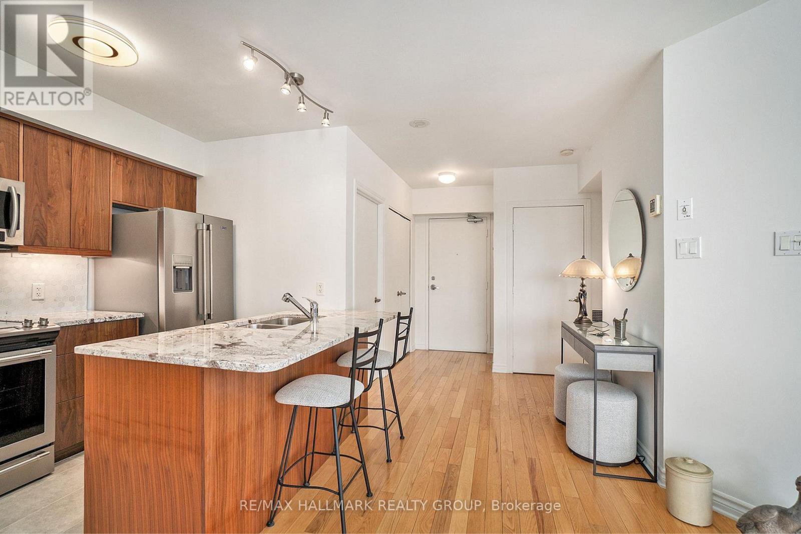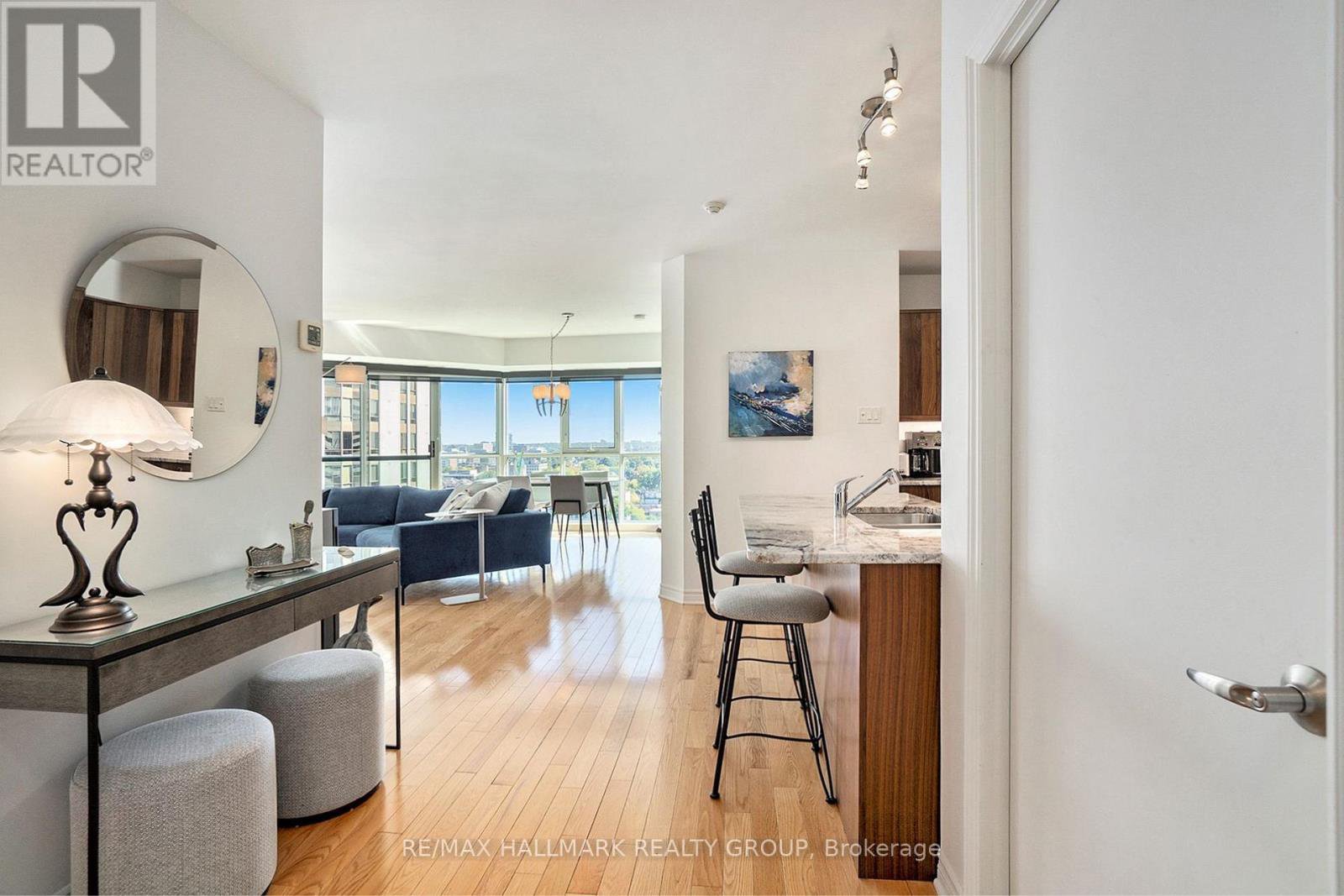 Welcome to The Pinnacle, a quiet, well-kept condo building in the heart of Centretown, where comfort meets convenience. This beautifully updated 2-bedroom, 2-bathroom corner unit offers 985 sq. ft. of sun-filled living space, framed by floor-to-ceiling windows that stretch across two walls. The layout is spacious and practical, with a large open-concept living and dining area that feels airy and relaxed. The kitchen is a standout, featuring stainless steel appliances (2022), quartz countertops, a tiled backsplash, and sleek, high-grade cabinetry with plenty of storage. Hardwood flooring runs throughout the unit, and custom living room built-ins add style and function. The primary bedroom includes its own ensuite, while the second full bathroom features a luxurious walk-in tub offering a spa-like place to unwind at the end of the day. Unit includes underground parking (Level 3, Spot 4A) and a storage locker (Level 2, Unit 76). The Pinnacle offers a party room, two elevators, and secure entry, with just five units per floor for a quieter atmosphere. Across the street, a community garden and park provide a peaceful green space to enjoy with your morning coffee, and the Tech Wall Dog Park is just a few blocks away. You're surrounded by top restaurants, cafes, grocery stores, and transit connections, all just minutes from your door. Quick closing available!