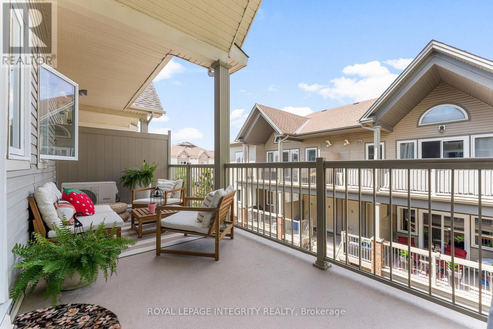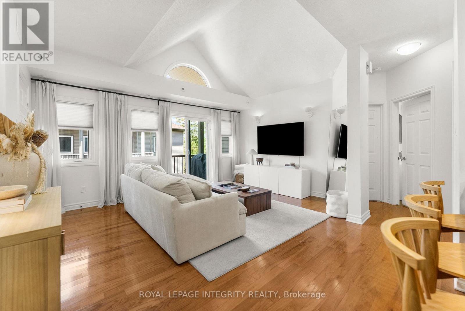 Welcome to carefree condo living in the highly sought-after community of Jackson Trails! This beautifully maintained upper unit is flooded with natural light thanks to its abundance of windows and soaring vaulted ceilings. With no rear neighbours and views of the trees, it offers a peaceful retreat just steps from all the amenities you need. The open-concept living and dining area features a full wall of windows, creating an airy, sun-filled space perfect for relaxing or entertaining. Rich hardwood flooring flows throughout the main living areas and both bedrooms, adding warmth and elegance. The kitchen is both stylish and functional, with stainless steel appliances, a sleek glass tile backsplash, a breakfast bar for casual dining, and convenient in-unit laundry access. The primary bedroom is a serene escape with a generous walk-in closet and a patio door that opens to tranquil treetop views, no rear neighbours to disturb your privacy. The second bedroom is also a great size, making it ideal for guests, a home office, or a cozy retreat. The large main bathroom offers both comfort and style, featuring a separate soaker tub and a walk-in shower. Off the living room, step out onto your private balcony, the perfect spot for morning coffee or evening unwinding. Located just minutes from shopping, restaurants, banking, schools, and transit, this home offers the best of both comfort and convenience. Whether you're a first-time buyer, downsizer, or investor, this bright and spacious unit checks all the boxes. Don't miss this opportunity to own in one of Stittsville's most popular neighbourhoods!