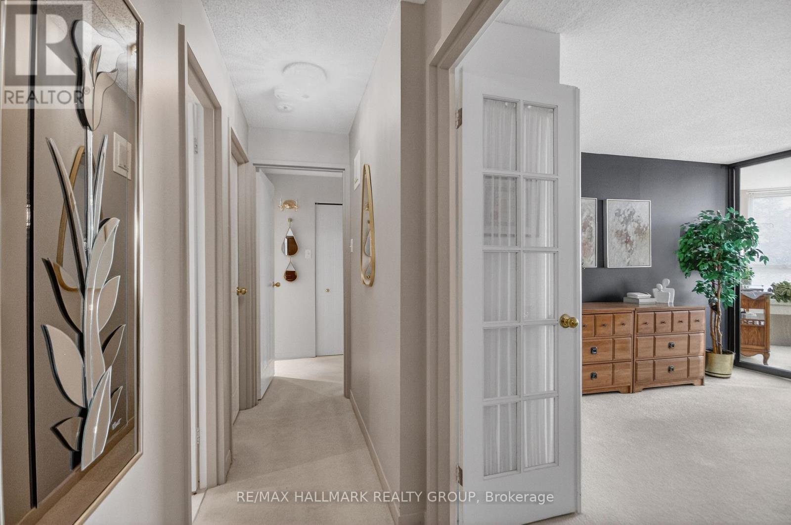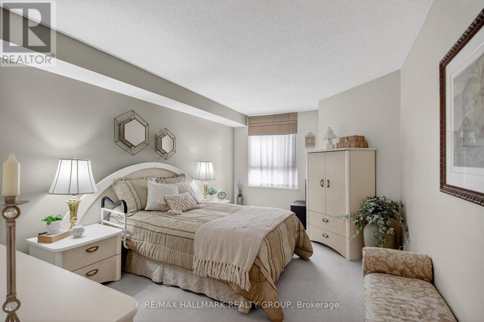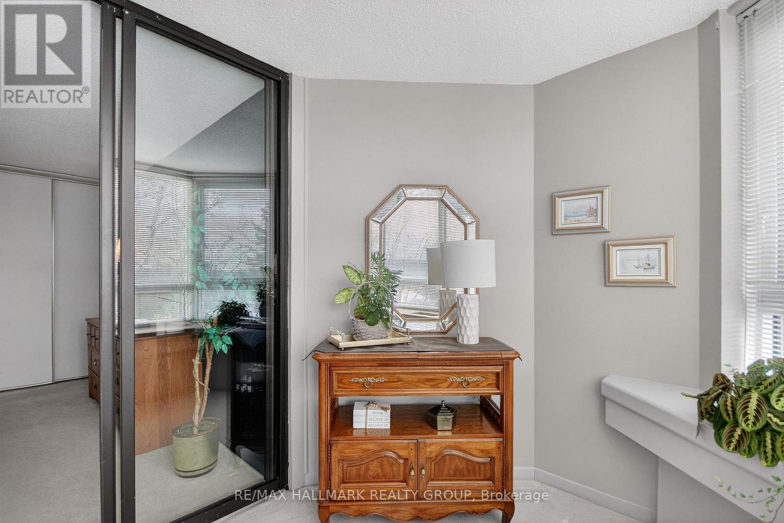 Nestled in mature Leslie Park, the amenity-rich Sophia I at 80 Sandcastle is a well-managed friendly community steps to Queensway Carleton Hospital, close to Baseline/Richmond transit, and minutes to Highways 417/416. One of the larger 2-bedroom + solarium layouts (popular Augusta model!) provides nearly 1,000 sq ft of flexible living space and a peaceful treed view. Classic cherry wood kitchen with pantry cabinetry, sleek black appliances are included. Large windows bring abundant natural light. The southeast-facing solarium (cat-approved sunbeam lounge!) connects both the living room and 2nd bedroom - perfect as a bright home office, reading nook or hobby space without sacrificing a bedroom. Life at Sophia I feels pleasantly straightforward and community-minded. Start the day with coffee in your sunny solarium overlooking mature trees, then take a quick elevator ride down for a workout, a quiet read in the library, soak in the hot tub or stretch in the sauna. In warmer months, the outdoor pool becomes the perfect "staycation" perk. The building is well managed with helpful on-site staff, and residents stay in the loop through regular updates posted in the common areas. When friends or family visit, the guest suite is a game-changer. Add in nearby transit, quick highway access, and close proximity to the Queensway Carleton Hospital, Bayshore, Bells Corners, College Square and DND Carling Campus and you get a comfortable, convenient lifestyle that suits downsizers, commuters, and anyone who wants a calm place to call home. Pet-friendly (restrictions apply): up to two pets per unit (20 lb limit). Common areas are "carry, crate, or stroller" territory - yes, you can absolutely justify the cutest pet stroller or puppy purse. Life is full of joy at the Sophia I, come see for yourself!