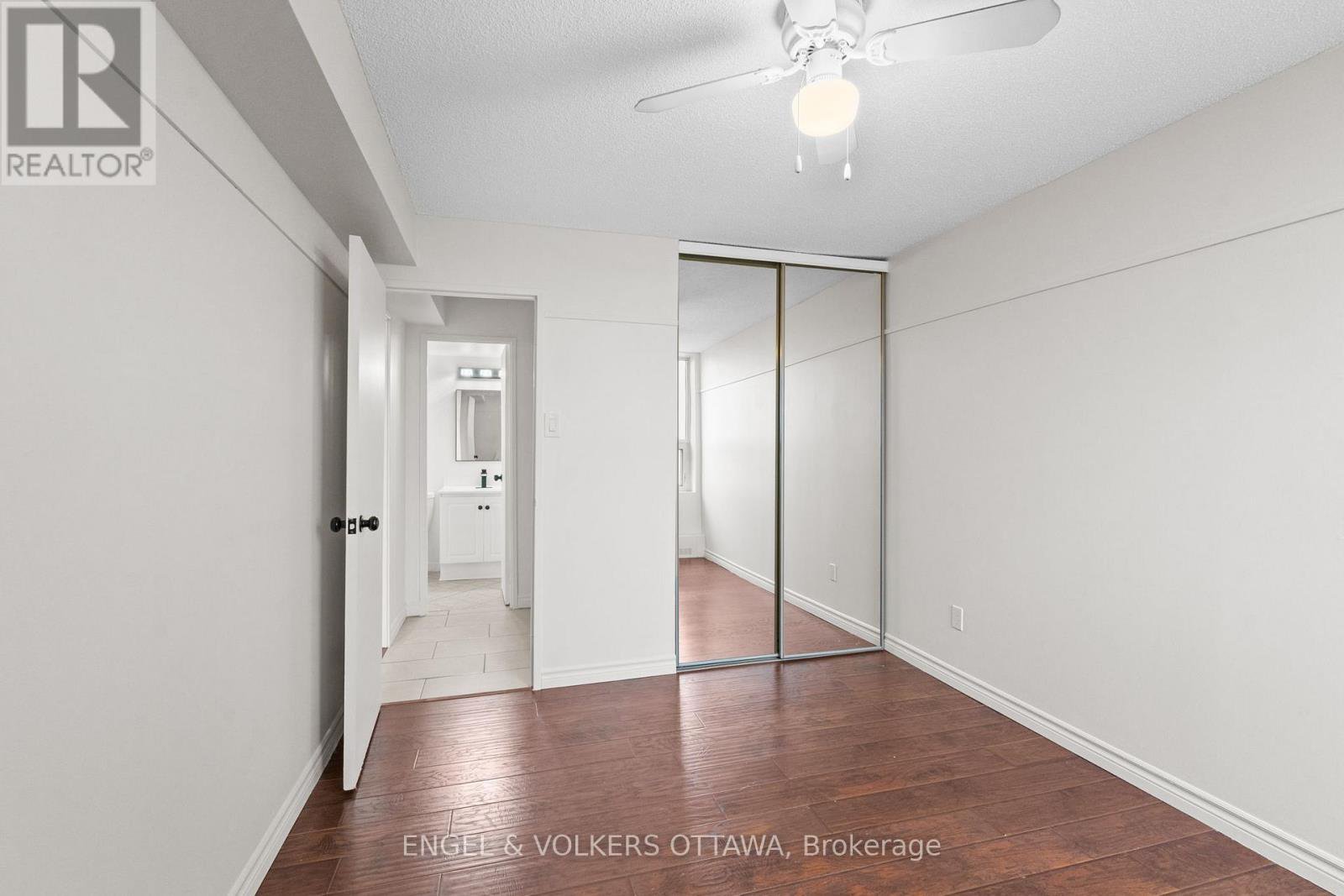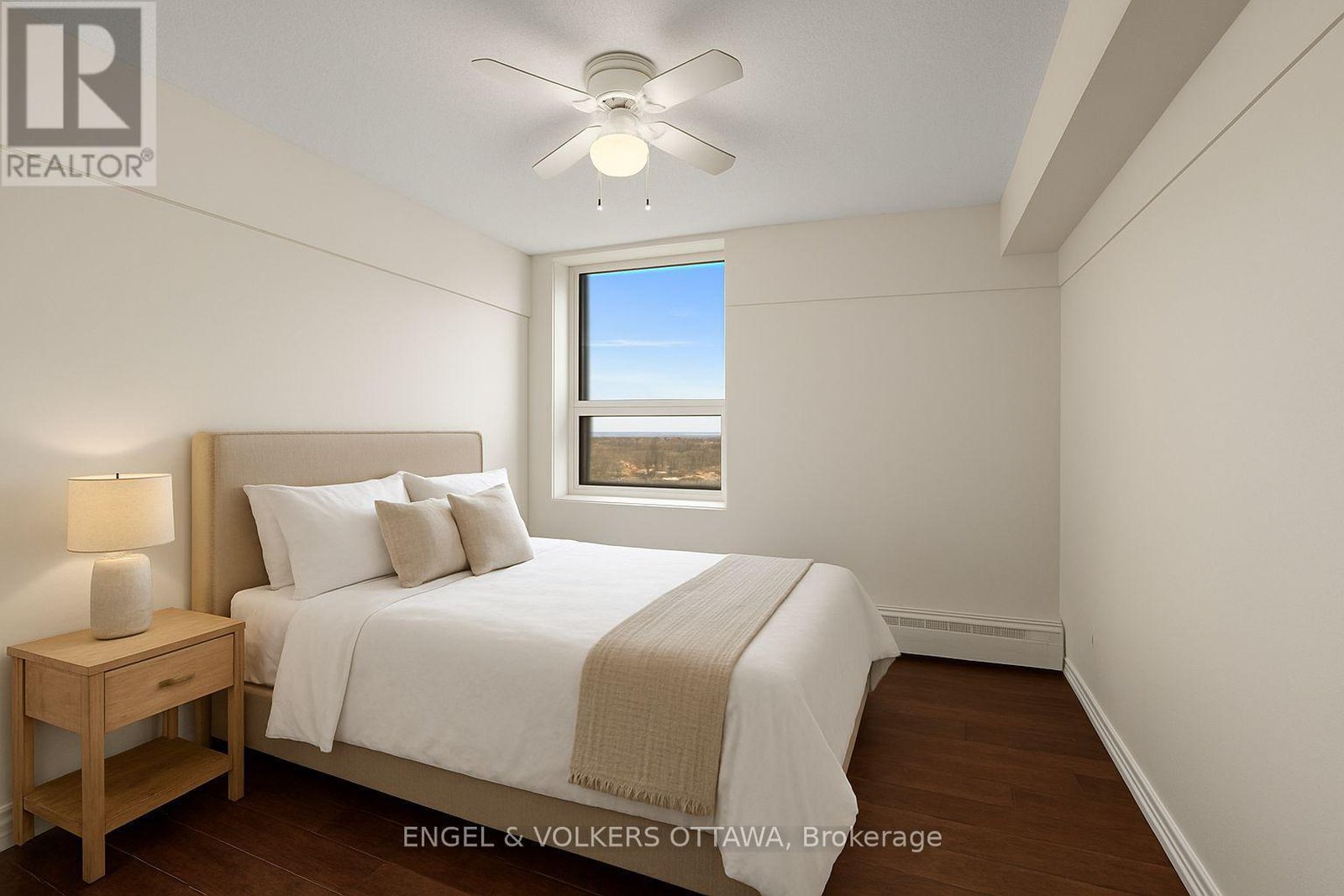 Set high above the city skyline, this beautifully updated two-bedroom residence offers bright, contemporary living with panoramic views stretching across Ottawa's treetops and skyline. With over 900 square feet of well-planned space, this unit features fresh paint and an abundance of natural light, providing a clean slate for your design. The welcoming entryway opens to a spacious living and dining area, where wide-plank hardwood flooring and crisp white walls create a refined, airy atmosphere. Expansive windows and sliding glass doors flood the space with light, leading to a private balcony that's perfect for morning coffee or evening relaxation while enjoying sweeping views from the 20th floor. The kitchen features white shaker cabinetry, dark countertops, a glass tile backsplash, and ample counter space, making meal preparation easy and efficient. The primary bedroom features large windows and a walk-in closet, while the second bedroom has a spacious closet with full-length mirrors. Both have easy access to the 4-piece bathroom, complete with a tiled shower-tub combination, a contemporary vanity, and an illuminated mirror. This home offers access to a full suite of amenities, including an indoor pool, sauna, party room, exercise facilities, and a shared laundry room. Conveniently positioned near the Montfort Hospital, St. Laurent Shopping Centre, La Cité Collegiale, and the NRC campus, this address provides easy access to the Blair LRT station and nearby recreation paths along Aviation Parkway. Whether you're downsizing or a professional looking to get into the real estate market, this apartment checks all the boxes!