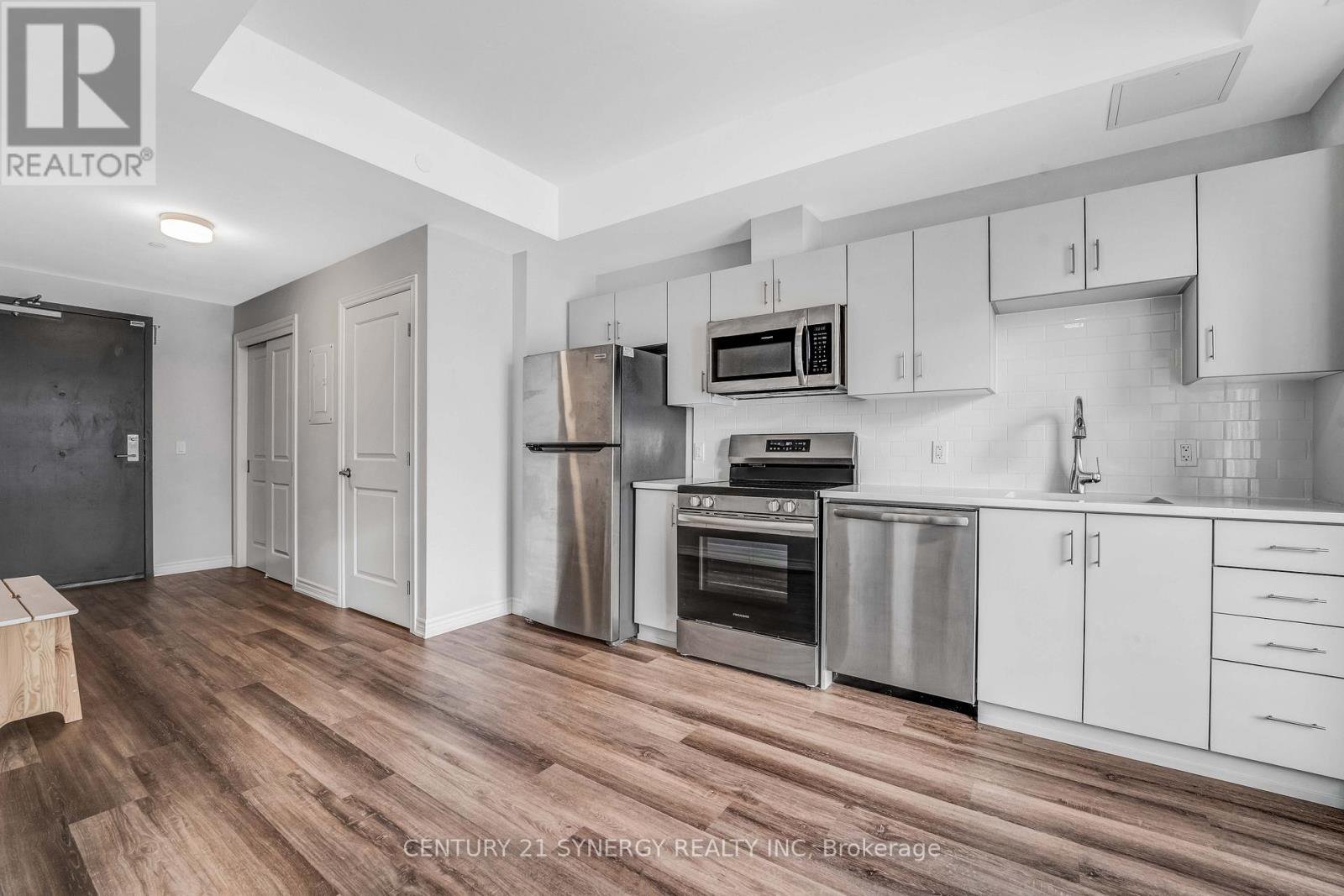 Welcome to Unit 602 at 1350 Hemlock Road, a modern studio located in the heart of Wateridge Village, just minutes from downtown Ottawa and a short walk to the Ottawa River. This bright, south-facing unit offers a smart, functional layout ideal for urban living.The open-concept space is filled with natural light and features a comfortable living and sleeping area. The contemporary kitchen is equipped with stainless steel appliances, quartz countertops, and luxury vinyl tile flooring, while the bathroom is finished with sleek ceramic tile. Enjoy in-unit laundry, elevator access, step-free entry throughout the building, and a private glass-enclosed south-facing balcony-perfect for relaxing or enjoying your morning coffee. Residents also have access to a stylish party room. Set in a vibrant, family-friendly community with new parks, schools, Montfort Hospital nearby, and convenient ground-floor amenities including a pharmacy, convenience store, dentist, and Pilates studio. Move-in ready and wheelchair accessible, this unit is an excellent opportunity for first-time buyers, downsizers, or investors in one of Ottawa's fastest-growing neighbourhoods.