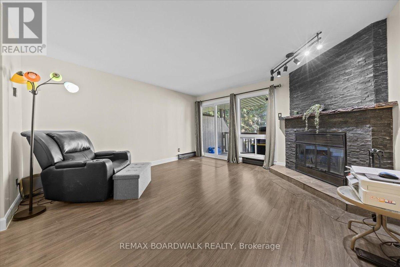 Stylishly Updated & Ready to Move InThis two-level stacked condo blends modern updates with a bright, airy feel, right across from schools and peaceful greenspace. Step into an inviting foyer with tiled floors and a handy powder room before entering the open main level. The renovated kitchen shines with stainless steel appliances (2024) and a chic stone backsplash, while the adjoining living room offers a cozy wood-burning fireplace and walk-out deck perfect for morning coffee or evening sunsets.Downstairs, the spacious primary bedroom offers a full wall of closets, with a well-sized second bedroom nearby. A four-piece bath and dedicated laundry room add everyday convenience.Set in a prime location, you're just a short stroll to the river, recreation facilities, shopping, and transit. Everything you need is at your doorstep. An ideal combination of style, comfort, and unbeatable walk ability this one is not to be missed! Professionally Painted