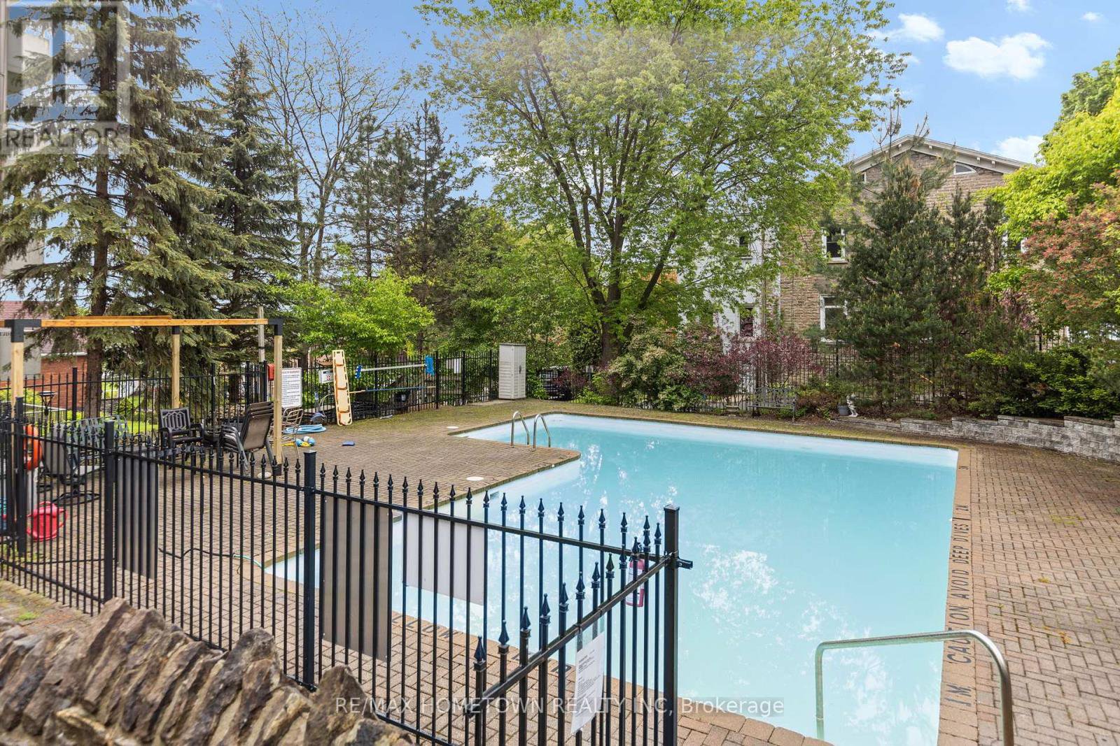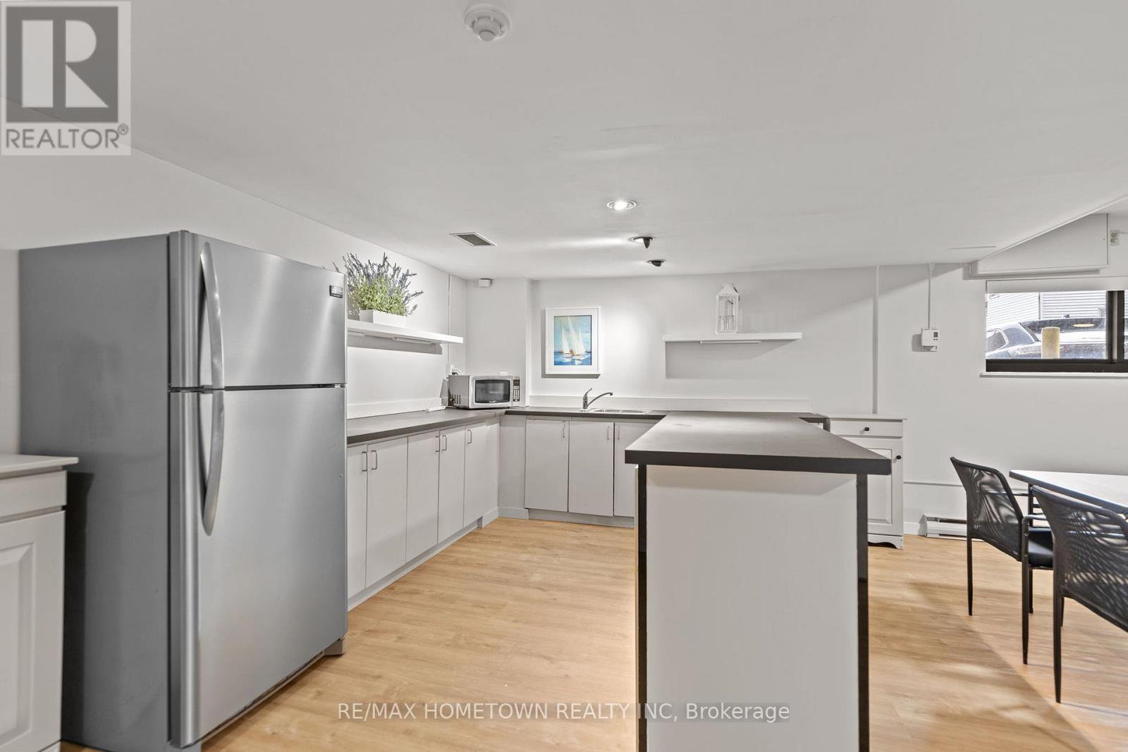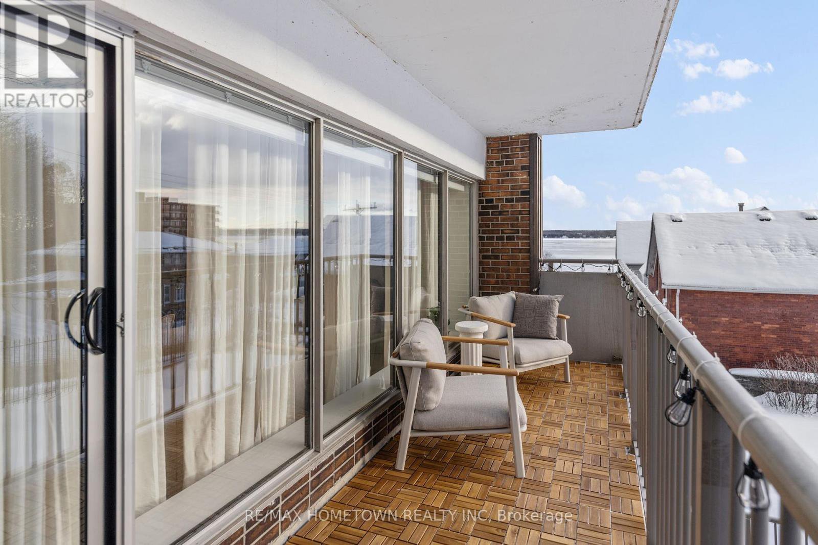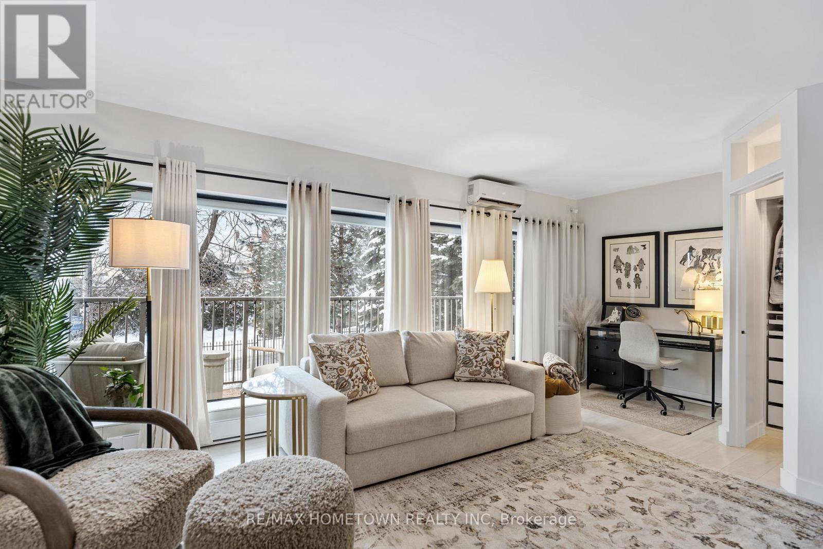 Looking for a place to lay your head during the warmer months? Head away to a warmer climate for the winter, where you can lock the door and go? If you love to travel, work on the road, or simply don't want to be tied down by grass cutting or snow removal, this worry-free condo and its amenities may be exactly what you're looking for. Located on the main level, this unit offers easy access with no stairs and no waiting for an elevator. Mail delivery and secure entry add to the peace of mind. The condo is bright, move-in ready, and has seen many recent updates. The foyer welcomes you with a large closet, leading into a combined living and sleeping area that includes space for a small home office. A sofa bed is in use (purchased 4 months ago), and the seller is willing to sell it. The updated kitchen features painted cabinets with new hardware, upgraded quartz countertops, a quartz backsplash, and a new stove and microwave. A separate built-in closet area keeps everything organized, and a door can be closed off for privacy. The updated three-piece bathroom includes a walk-in shower with a Pier Deco AquaMassage tower featuring a rain shower head, neck and shoulder waterfall, and four adjustable body jets. You may find yourself spending a little extra time there. Step outside to the large southwest-facing balcony, recently upgraded with teak wood tiles. Enjoy afternoon sun and river views in a peaceful setting in this summer. This amazing location is adjacent to Centeen Park and the St. Lawrence River, the downtown market, restaurants, shopping, and just a short walk and public transit right out front on King St. And yes, there's also a heated outdoor pool. Don't miss your chance to enjoy easy, carefree living in a great location.
